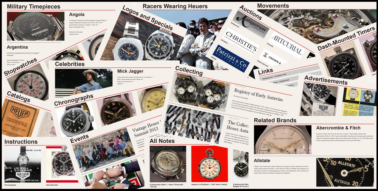 Online since 2003, OnTheDash is the most comprehensive source of information about vintage Heuer chronographs, dashboard timers and other timepieces. OnTheDash presents images of over 500 different models and executions of vintage Heuer chronographs, and scans of over 60 original Heuer catalogs covering the period 1935 through 1985. OnTheDash also includes registries of some of the rarest Heuer models, reference tables providing detailed information about the various chronographs, and blog postings about vintage Heuers and other timepieces. Here, you can see some of the “Best of OnTheDash“.