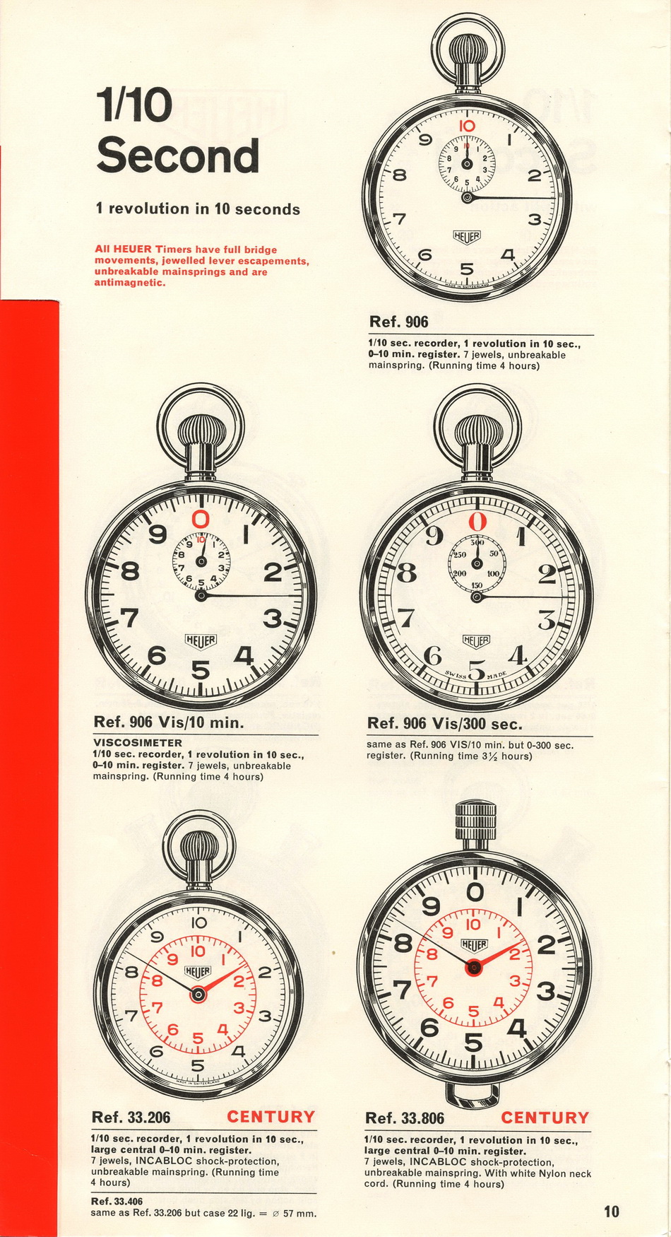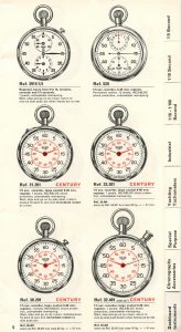Describing all the unusual stopwatches in any particular catalog would be an endless task. On page 10 of the 1961 catalog, we see five stopwatches that have 1/10 second timing, with the second hand making one revolution in 10 seconds. The Reference 906 Vis (Viscosimeter) has a capacity of 10 minutes and a running time of 4 hours; the Reference 906 Vis / 300 seconds has a capacity of 300 seconds (five minutes) and running time of 3-1/2 hours. We can assume that these stopwatches were used for some scientific or industrial application relating to viscosity.