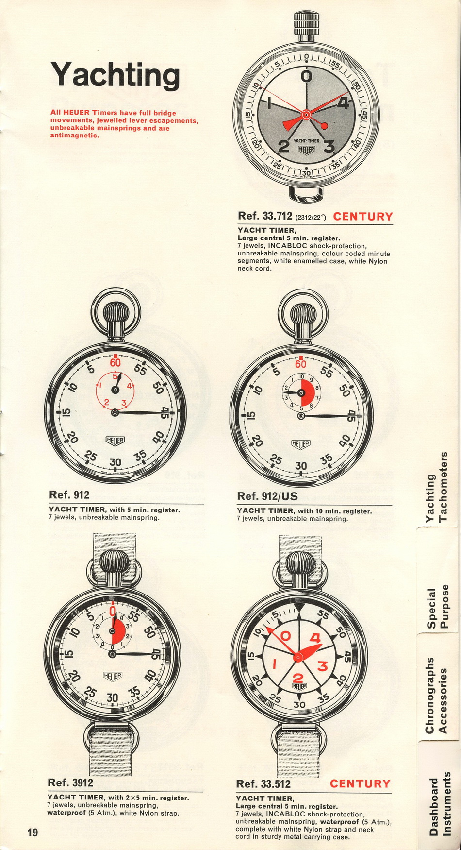 Page 19 of the 1961 catalog shows five stopwatches for Yachting. The Reference 912 and Reference 3912 models are Heuer’s traditional configuration, with a 5 or 10 minute register for the countdown. The newer Reference 33.712 and Reference 33.512 models use Heuer’s “Century” design, with the central minute register guaranteeing 85% better legibility. The Century design had been introduced in 1960, to mark Ed. Heuer’s 100th year in the timepiece business.