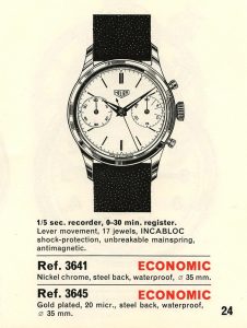 The 1961 catalog was the first Heuer catalog to refer to “Economic” models. We see this designation for the Reference 3641 chronograph, with a nickel-chrome case, and the Reference 3645, with a gold=plated case.