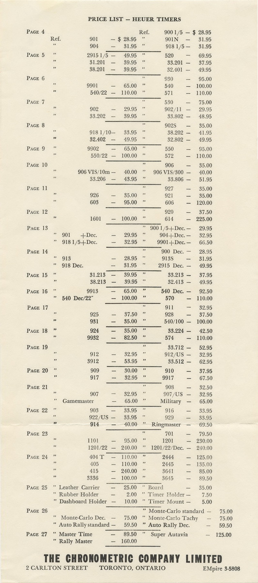 Included with this catalog is a Price List published by The Chronometric Company Limited, Heuer’s branch in Tornoto, Canada. The exchange rate for Canadian dollars to U. S. Dollars was in the range between $0.95 and $1.02 U.S. Dollars per Canadian dollar throughout 1961, so it is easy to translate this Price List into U. S. Dollars.