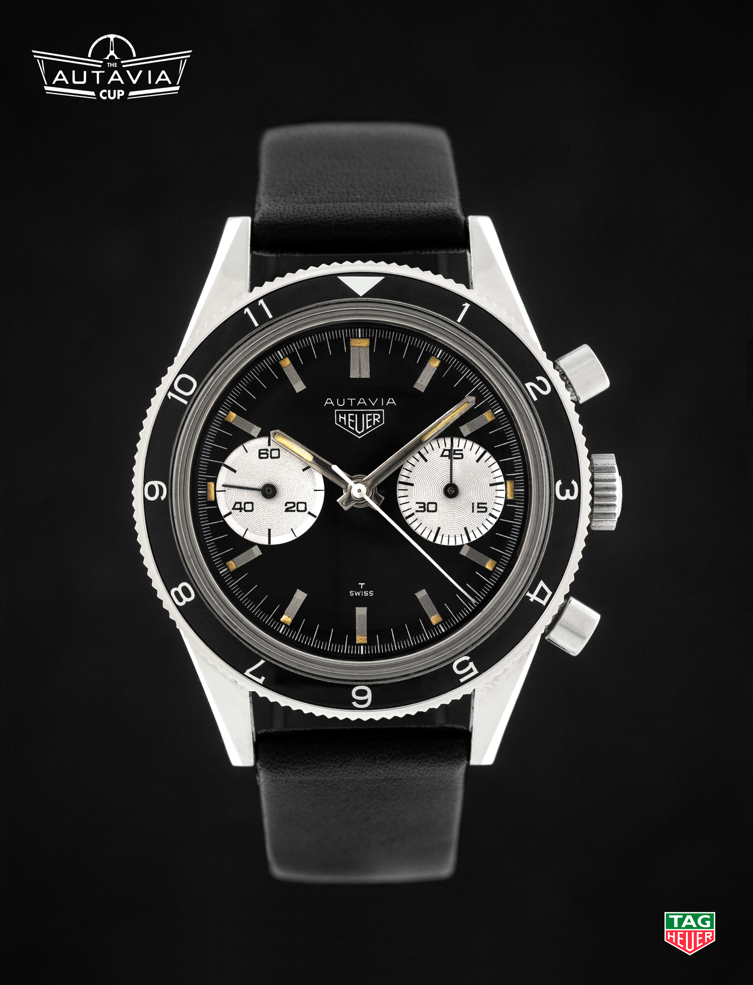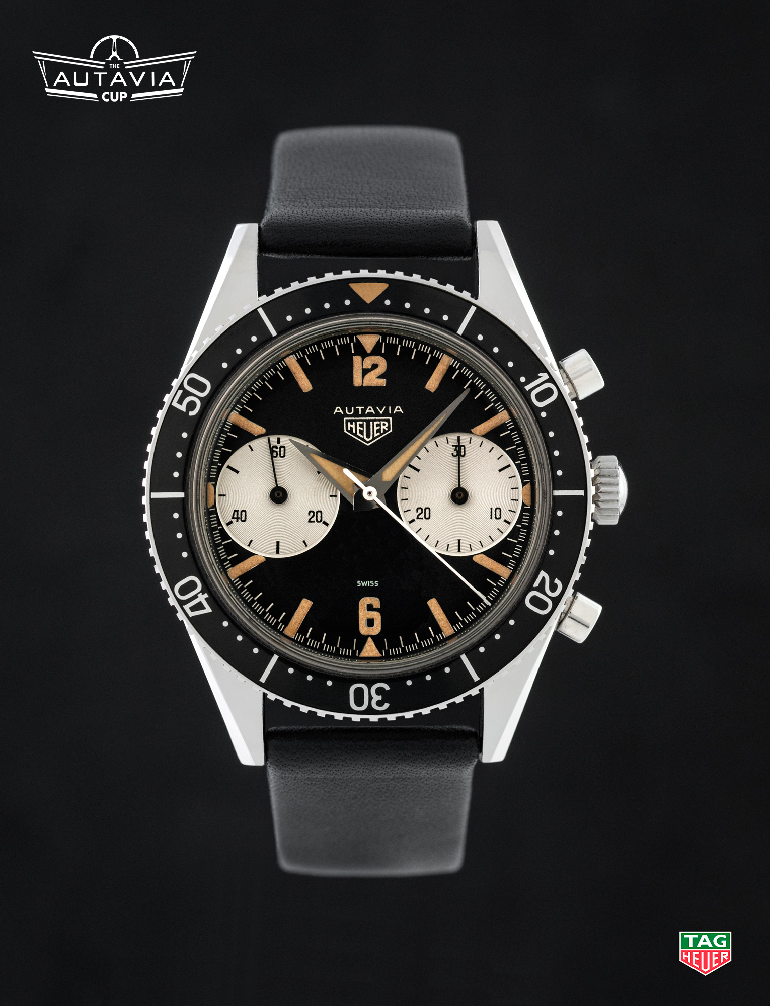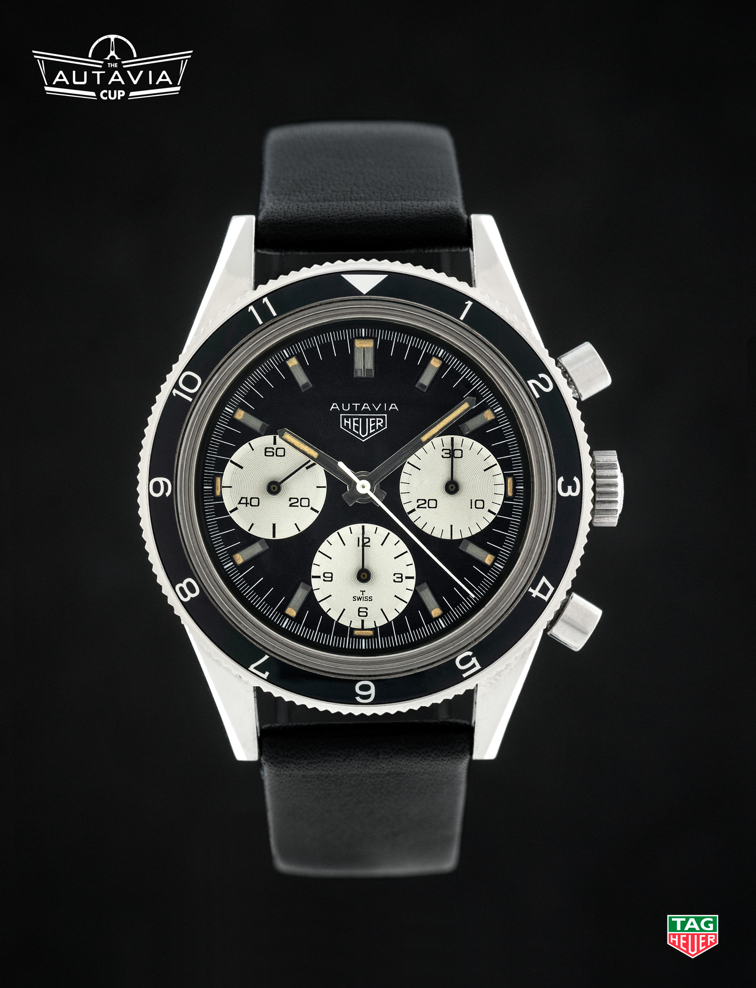 On the Right — Around 1968, Heuer switched the construction of the Autavia case, moving from the previous screw-back models to the snap-back “compressor” model. This traditional model, with a black dial and white registers, is one of the two “compressor” models included in the Autavia Cup competition. [High Res]