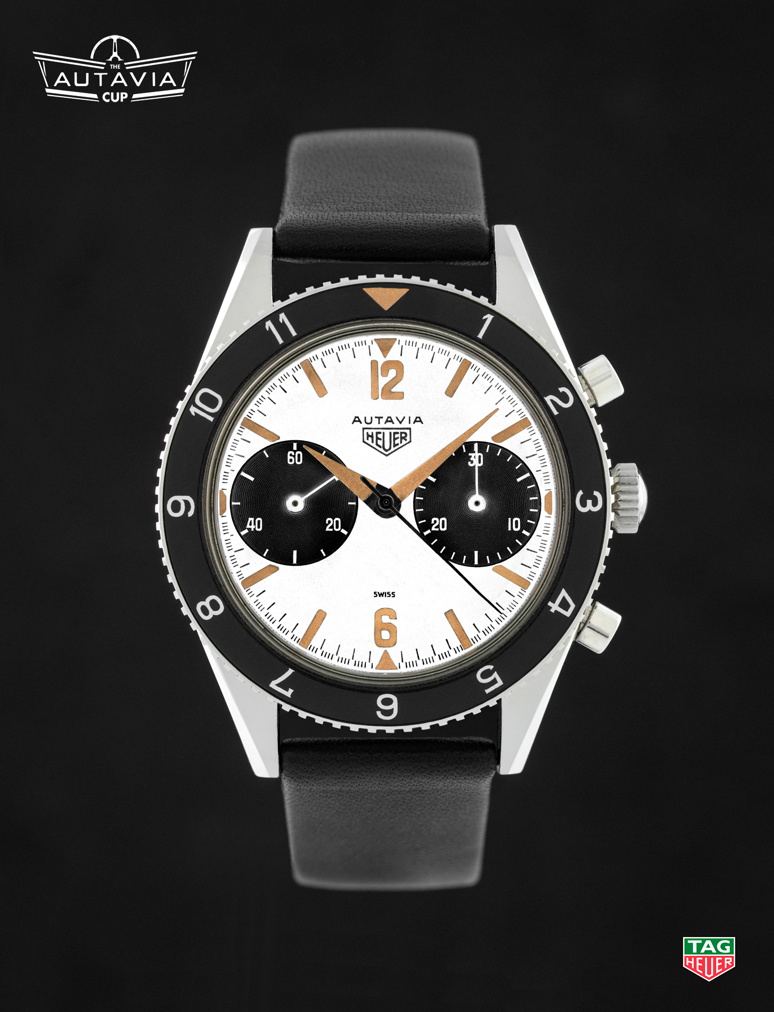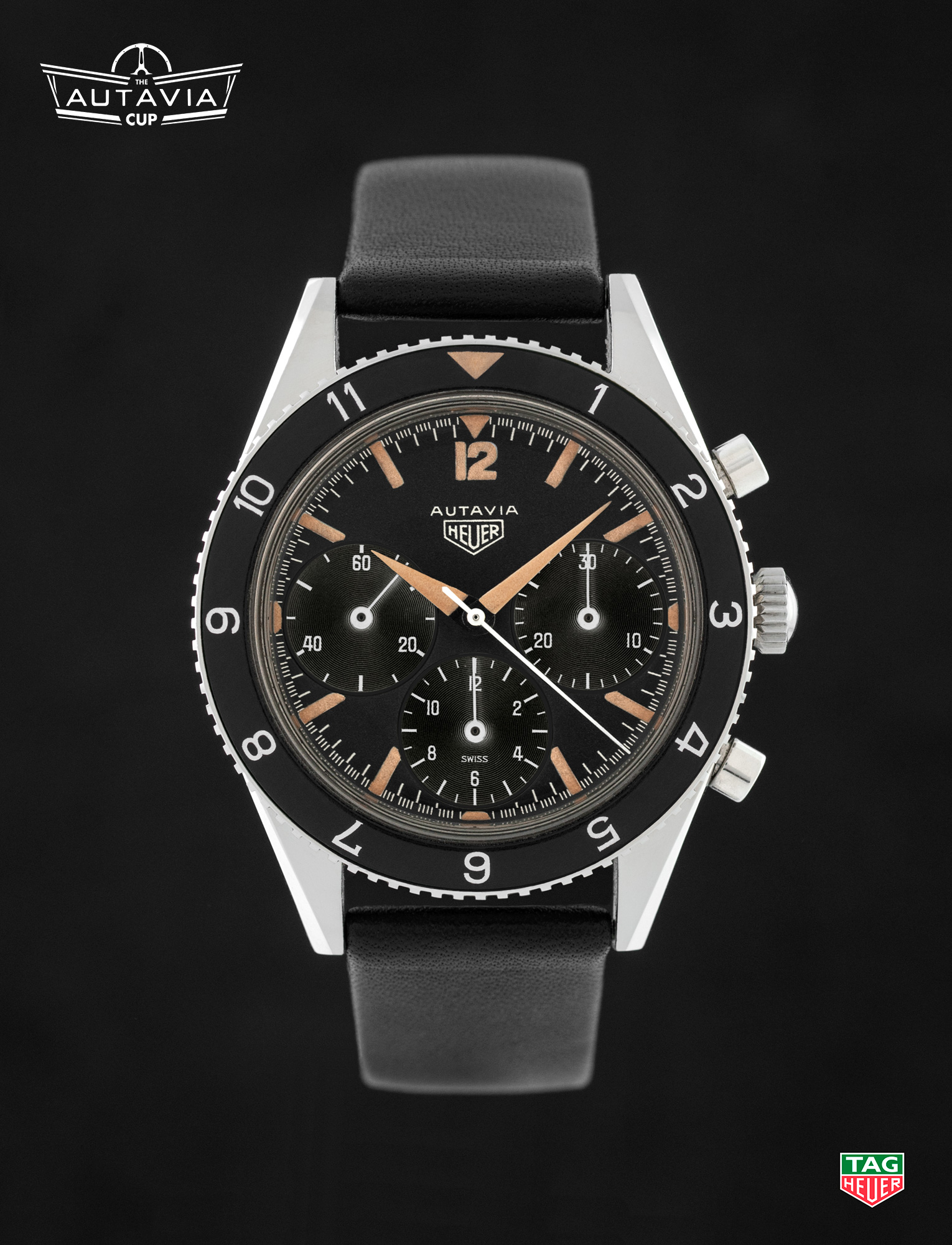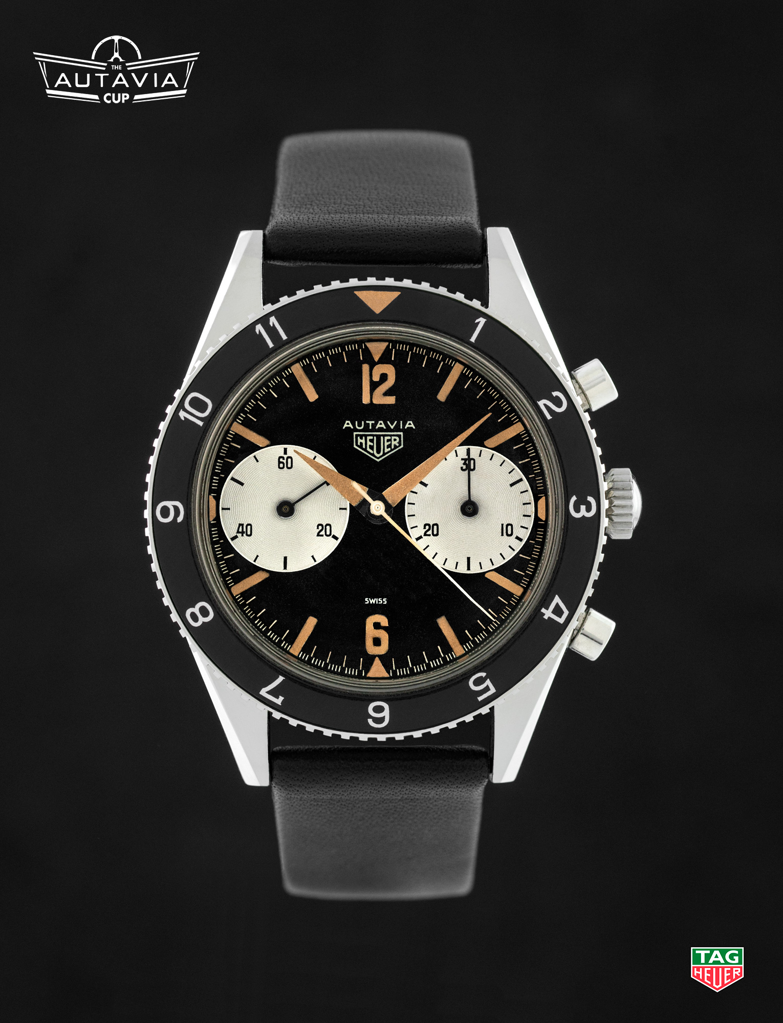 On the Right — Around 1968, Heuer switched the construction of the Autavia case, moving from the previous screw-back models to the snap-back “compressor” model. This traditional model, with a black dial and white registers, is one of the two “compressor” models included in the Autavia Cup competition. [High Res]