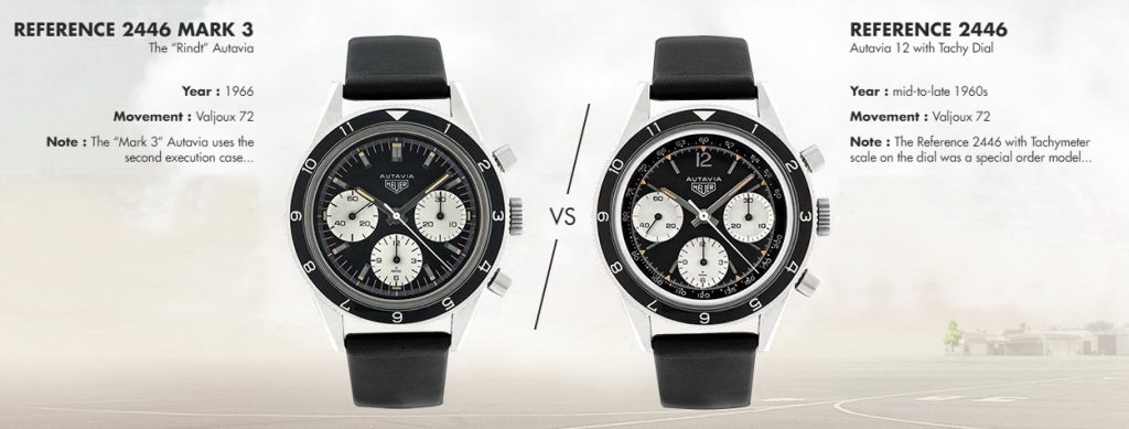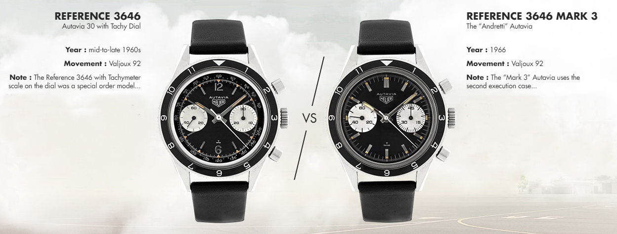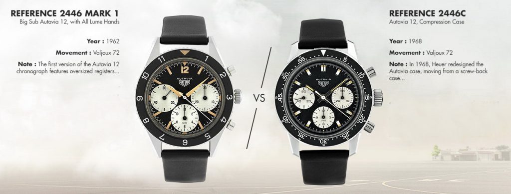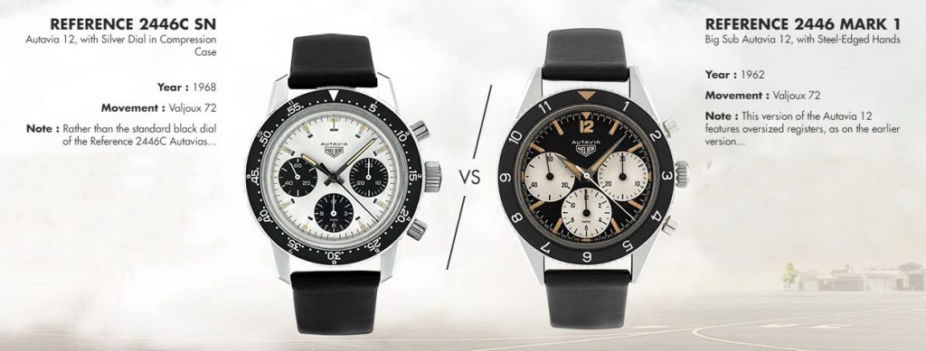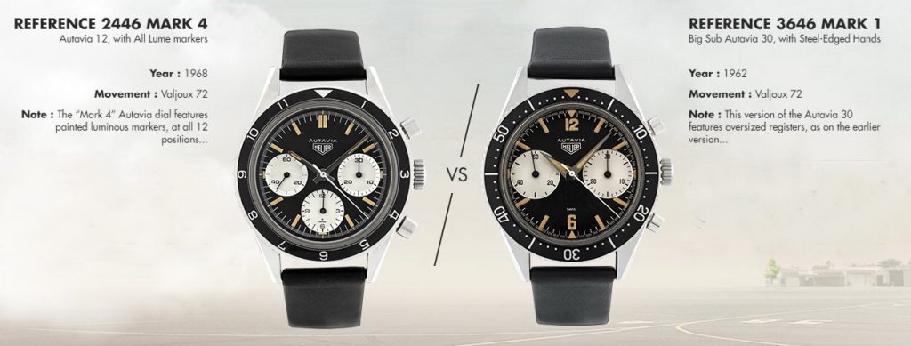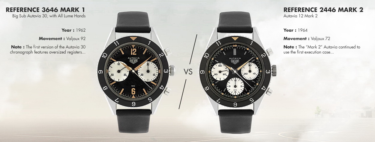 On the Left — This is the very first of the Autavias, from 1962. Signature elements include the oversized registers (which collectors call the “Big Subs”) and the dauphine hands, entirely covered in luminous material (called “All Lume”). This model is sought after by collectors as the original Autavia chronograph. [High Res]