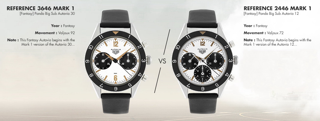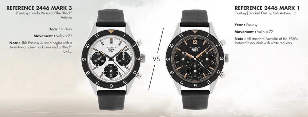 On the Left — In Match 8, we see a pairing of two Big Sub Autavias, both of them reversed from black dials with white registers, to create “Panda” models. The Fantasy Autavia on the left is a two-register model, with All Lume hands, as used on the very first Autavias. [High Res]