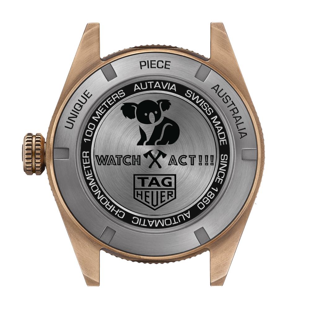 This unique Autavia uses a brass case, with the green dial having the crossed-axes insignia associated with firefighters around the world. The case-back is engraved with the “Watch & Act” logo, along with a koala bear, with the words “Unique Piece Australia” around the edge of the dial.