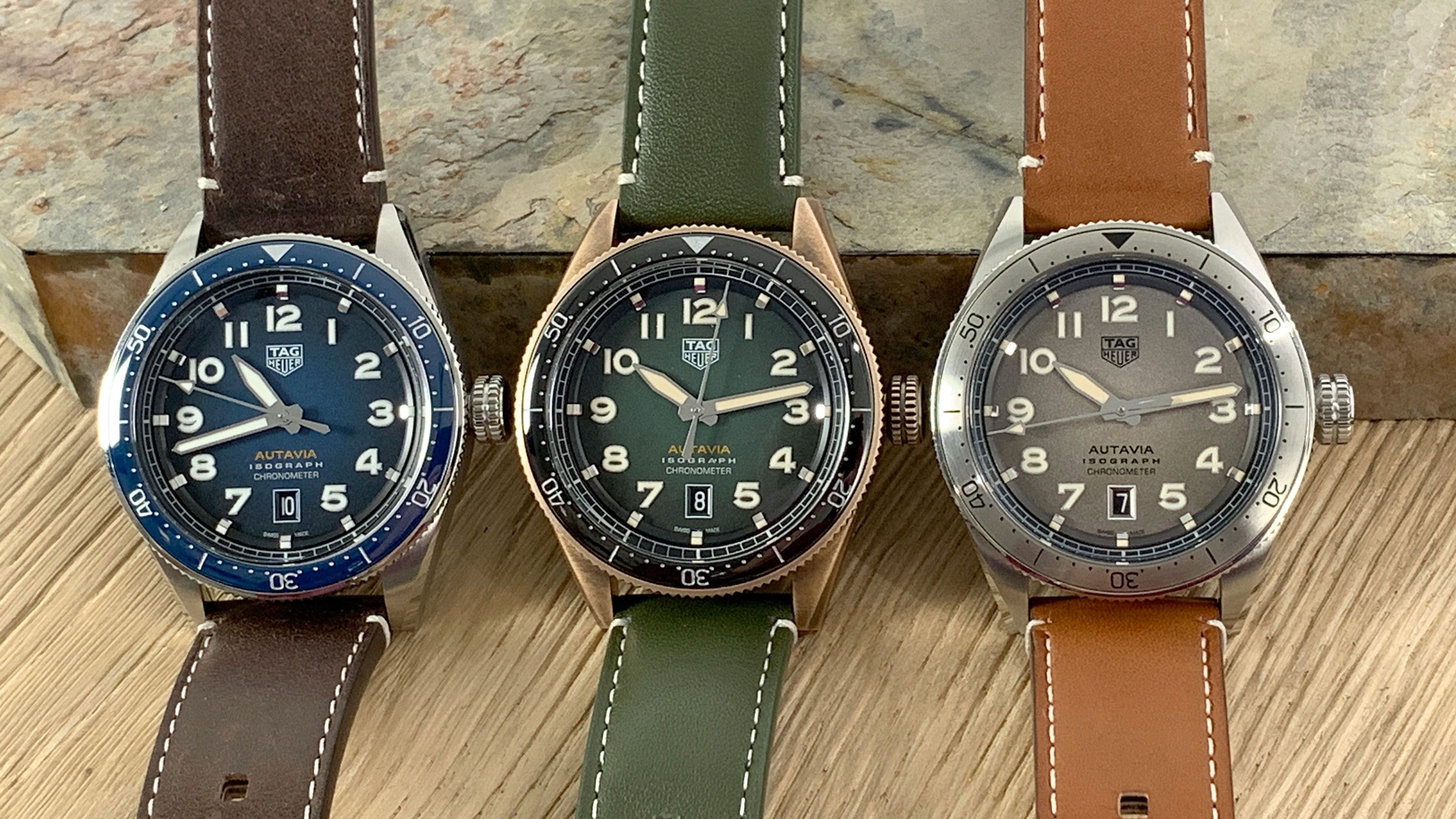 In March 2019, at Baselworld, TAG Heuer introduced the very first Autavia watches, meaning that they were three-hand watches, rather than chronographs. These new Autavia watches featured distinctive colored dials, including dials in blue, fume (smoke) and green. The first models produced by TAG Heuer used stainless steel cases, with brass cases being introduced later during 2019. The bezels are either ceramic or aluminum, and the watches come with a variety of interchangeable straps, as well as a stainless steel bracelet.