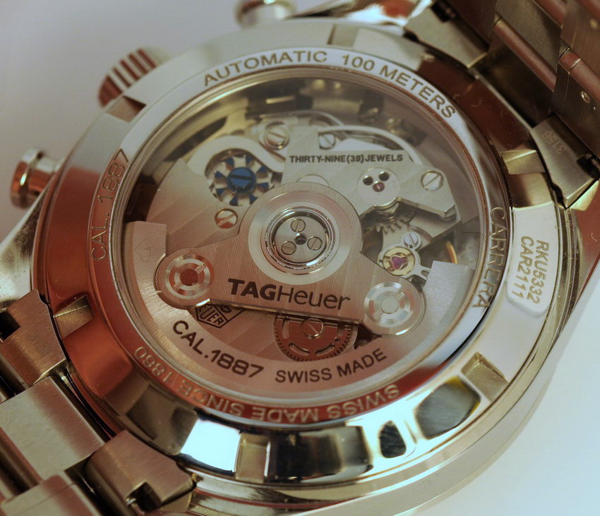 The Carrera Calibre 1887 is the first chronograph to use TAG Heuer’s newly-introduced Calibre 1887 movement, an in-house movement that is expected to become the mainstay of TAG Heuer’s line of chronographs. The Calibre 1887 movement is an integrated movement, featuring a classic column wheel construction, with an oscillating pinion to engage and disengage the chronograph (a technology developed and patented by Edouard Heuer in 1887, which explains the designation of this new calibre). The 13 ligne movement has 39 jewels, with a power reserve of 50 hours and a balance frequency of 28,800 beats per hour. TAG Heuer produces the movement’s main plate, bridges, column wheel and oscillating weight at its industrial facility, based in Cornol, Switzerland, and sources other key components (including the balance spring, the pallets and escape wheel) from Nivarox, a leading Swiss producer of escapement parts.