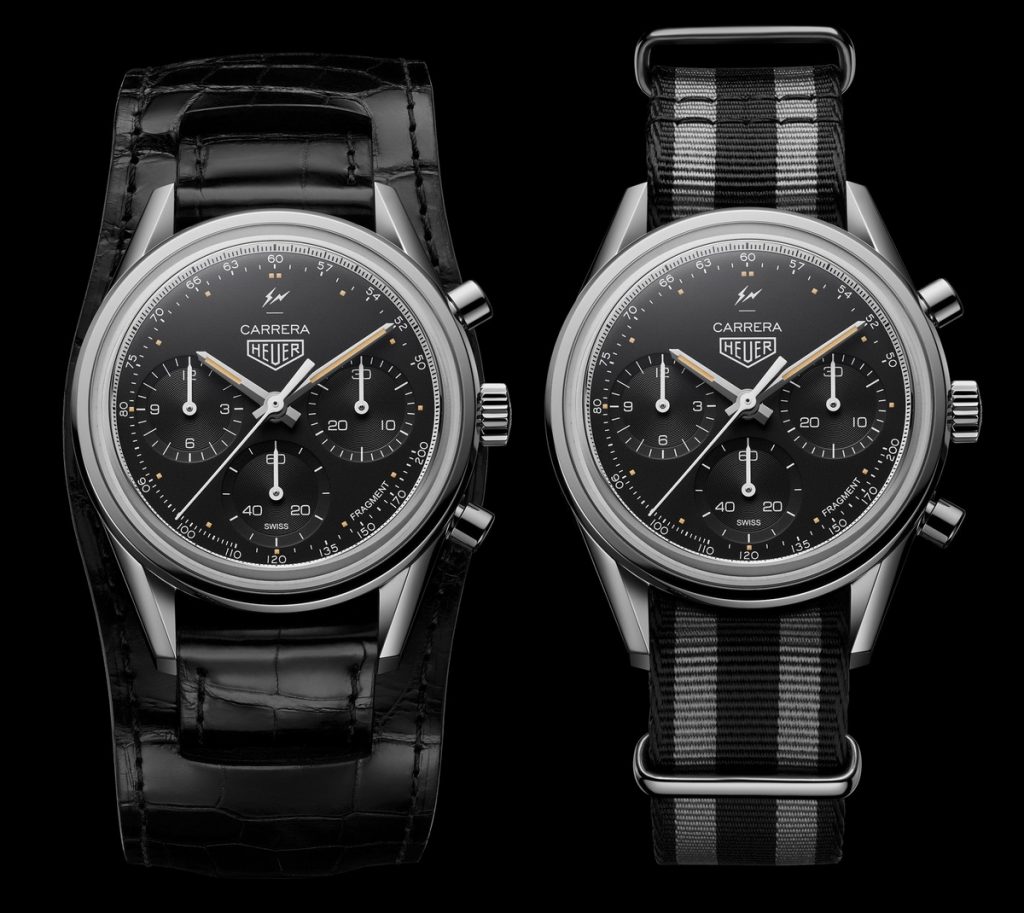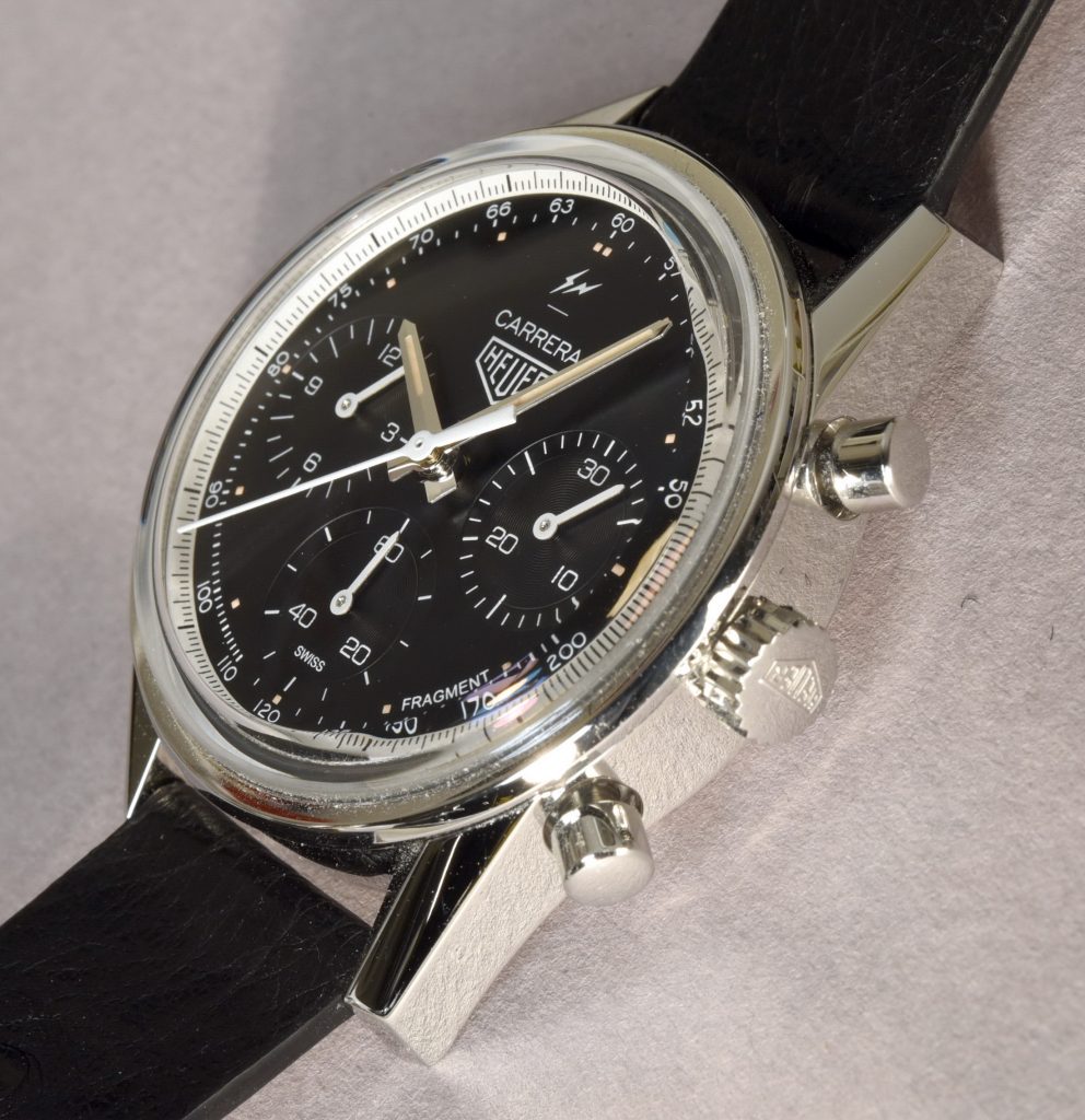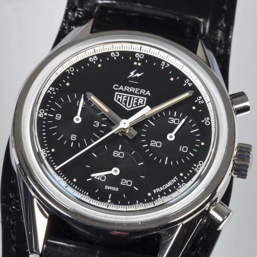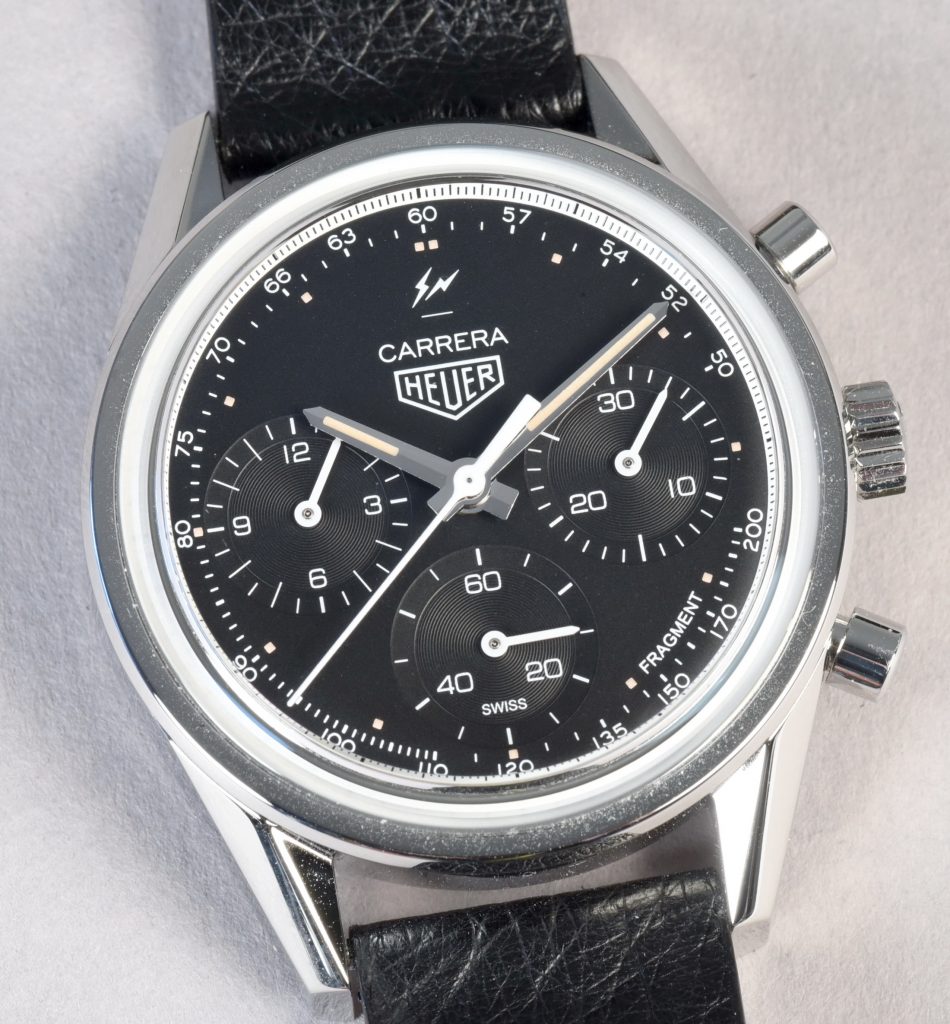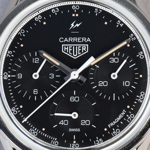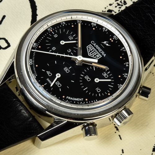 Fujiwara completes the design with his thunderbolts logo at the top of the dial (above the “Carrera”) and the name “Fragment” at the bottom of the dial, between 4 o’clock and 5 o’clock.