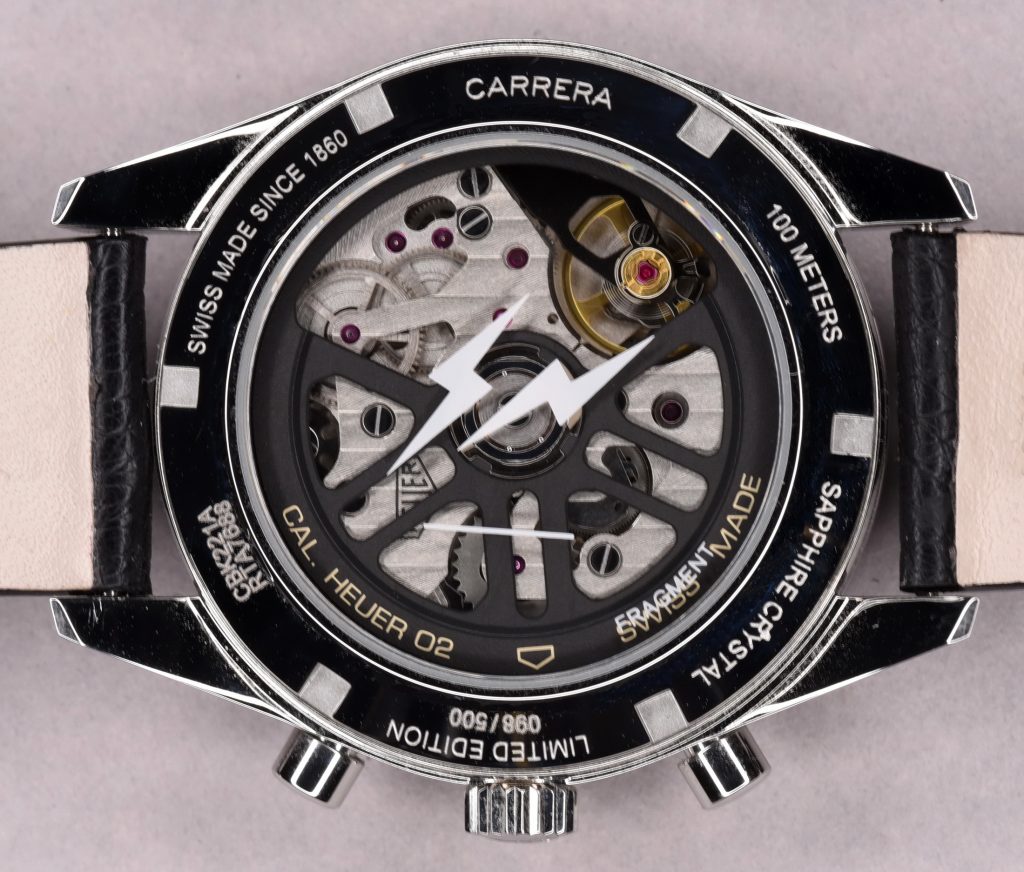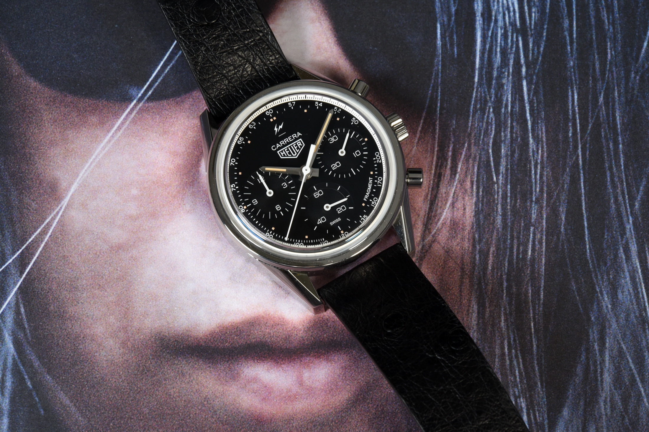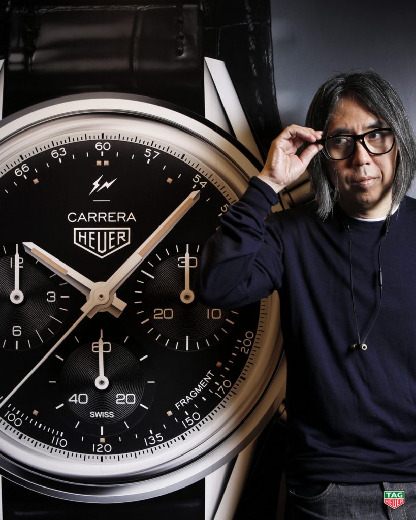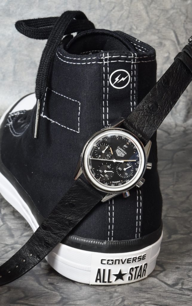Fujiwara completes the design with his thunderbolts logo at the top of the dial (above the “Carrera”) and the name “Fragment” at the bottom of the dial, between 4 o’clock and 5 o’clock.