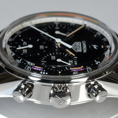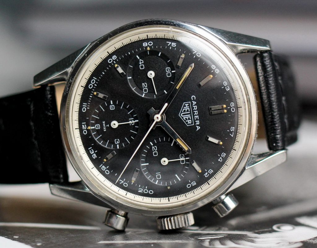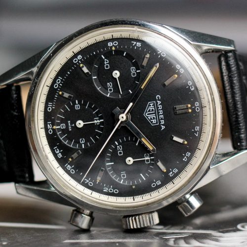 Heuer introduced the Carrera in 1963, with the two-register Carrera 45 (Reference 3647) powered by the Valjoux 92 movement and the three-register Carrera 12 (Reference 2447) powered by the Valjoux 72 movement. The very first Carreras used relatively simple dials, either white dials with white registers or black dials with black registers, and there were no scales being printed on the dials. Defining features of the first Carreras included an inner flange (tension ring) between the dial and the crystal, an over-sized crown and pushers, and strong, angular lugs, with an internal facet between the top surface of the lug and the inside edge of the case (where the strap attaches).