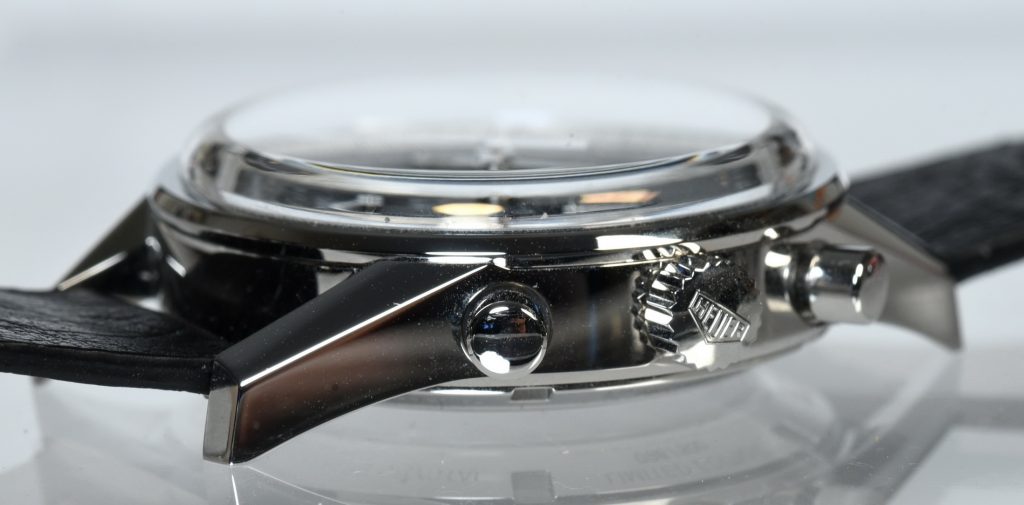 Glassbox is a construction that offers the durability of a modern sapphire crystal, however, the crystal is shaped like the domed, plastic crystals of the 1960s. The “glassbox” case of the Carrera Calibre 18 Telemeter measured 38.3 millimeters across the dial, so both the size of the case and its construction mimic the vintage Carreras from the 1960s.
