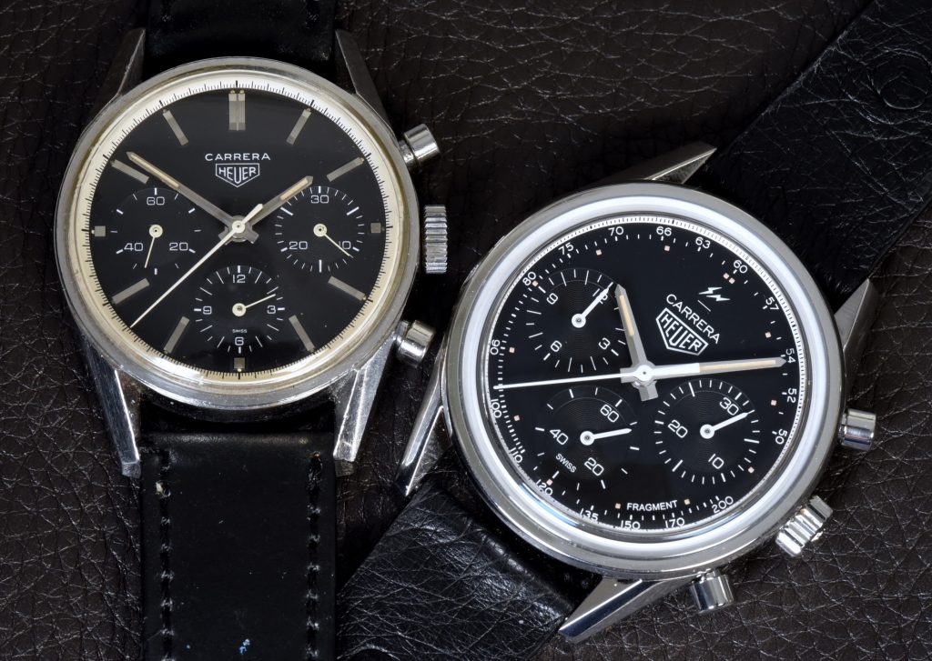 To My Eye. The moment I saw the Fragment Carrera, I knew that I wanted to add it to my collection. Black-white-beige is my favorite color combination for vintage chronographs, as in vintage Autavias, and the black-on-black Carreras from the 1960s are also favorites. To my eye, the “tweaks” added by Fujiwara are excellent updates of the original Carreras from the 1960s, giving the watch a new energy. Increasing the size of the three registers gives the watch a stronger look, and using the small lume dots in place of the applied metal markers provides more real estate for the beautiful black paint, while also deleting an element that can distract from the power of the pure black-on-black dial.