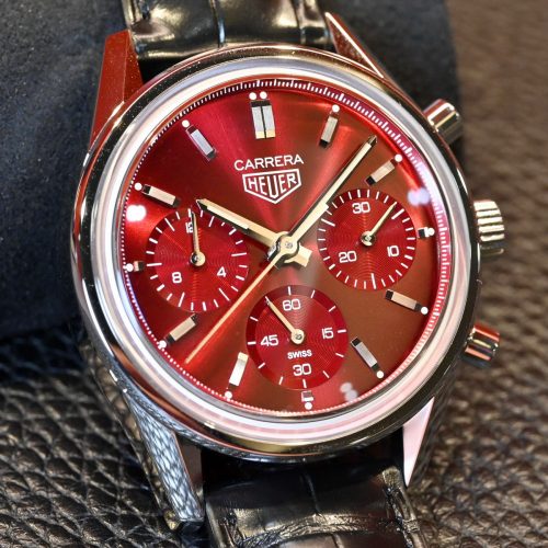 For the background on how Heuer has used the color red to capture the passion of racing, see my posting today on The Edge, TAG Heuer’s online magazine — The Carrera Goes Full Red. For additional information about the Carrera Red Dial LE chronograph, see TAGHeuer.com.