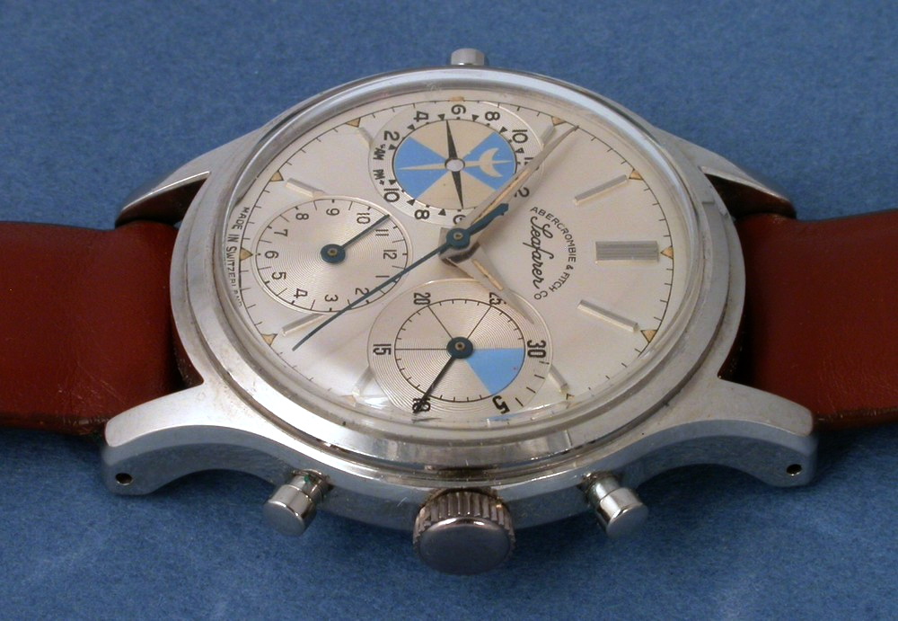 Why It’s a Grail. In the 1940s and 1950s, Abercrombie & Fitch was a high-end outfitter for adventurers. The stores in New York and Chicago were destinations for well-heeled gentlemen being outfitted for adventures such as fishing, sports car rallies, mountain climbing or hunting. Heuer made watches for Abercrombie & Fitch, always the most rugged models in the Heuer catalog. Abercrombie collaborated with Heuer to develop innovative complications, for example the Solunar (to show the high and low tides) and the Auto-Graph (to show speed over a measured distance). In 1950, Heuer designed the Seafarer, a special chronograph for Abercrombie’s beach and fishing enthusiasts, featuring a dial to show the high and low tides each day, which could also be set to show the moon phase. The Seafarer never had a case of its own, but instead occupied the cases used for other Heuer chronographs, from the Reference 346 in the early 1950s through the Reference 2446C in the 1970s. Circa 1965, the Seafarer used the same case as the Carrera Reference 2447, and this is the one cherished by collectors. The tide dial and chronograph minute recorder feature vibrant blue segments and the dauphine hands have thin lume inserts, different from the stick hands on a standard Carrera.