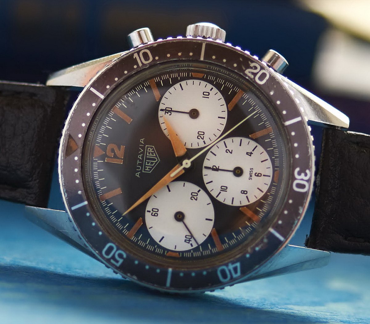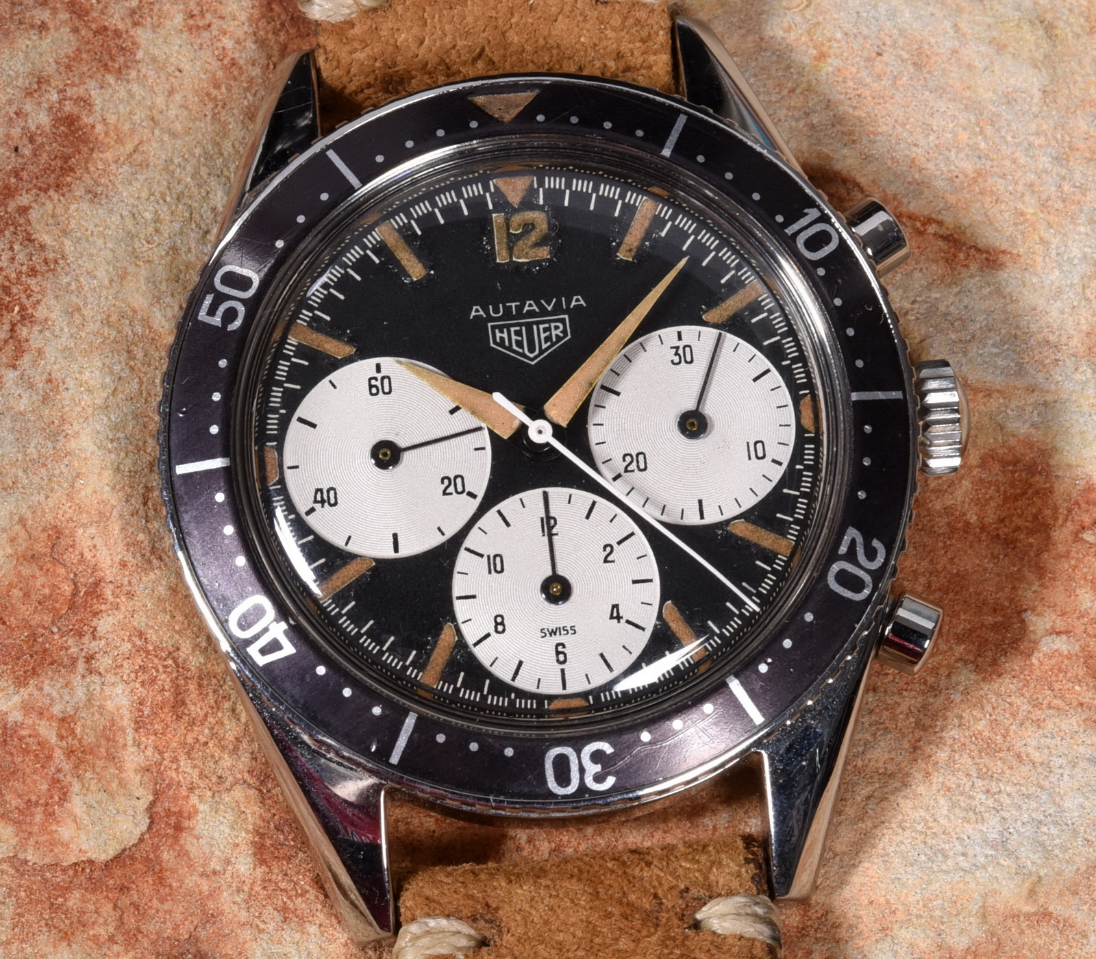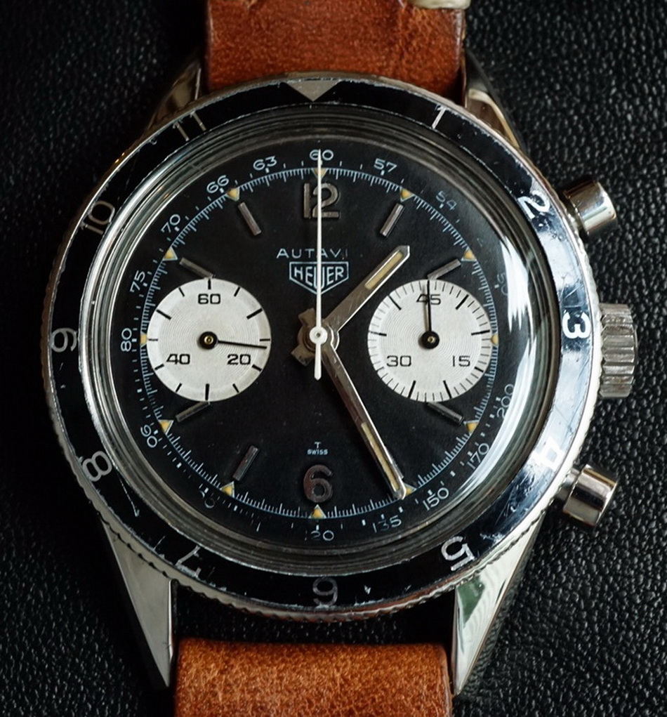 Why They are Grails. From 1962 to 1985, Heuer produced over 80 models and executions of the Autavia, but many collectors would say that they “got it right the first time”. There is something magical about the first Autavias, with the larger registers, dauphine hands, wider bezels and chamfered lugs. The lines and proportions are just right. These are screw-back cases, with round pushers, marked to indicate that they are guaranteed waterproof to 330 feet (100 meters). Add the fact that the Autavia was the first model introduced by Heuer that had a model name, rather than only a reference number, and the early Autavias become one of Heuer’s most collectible watches.