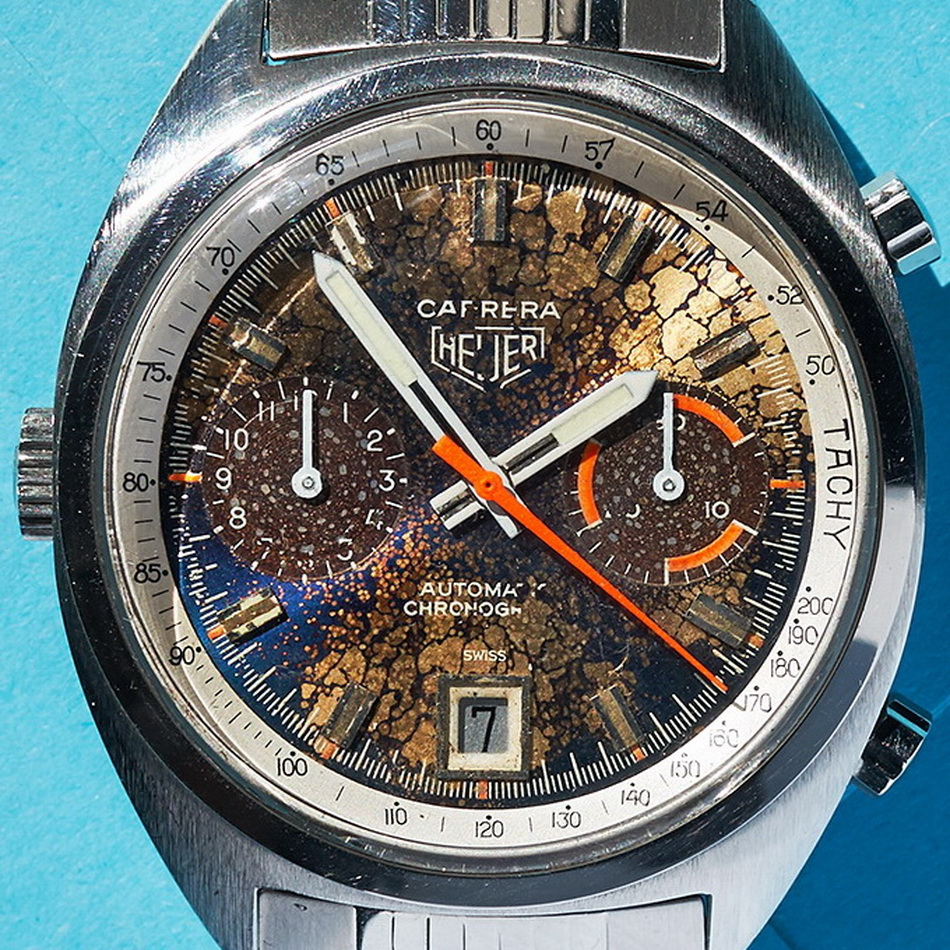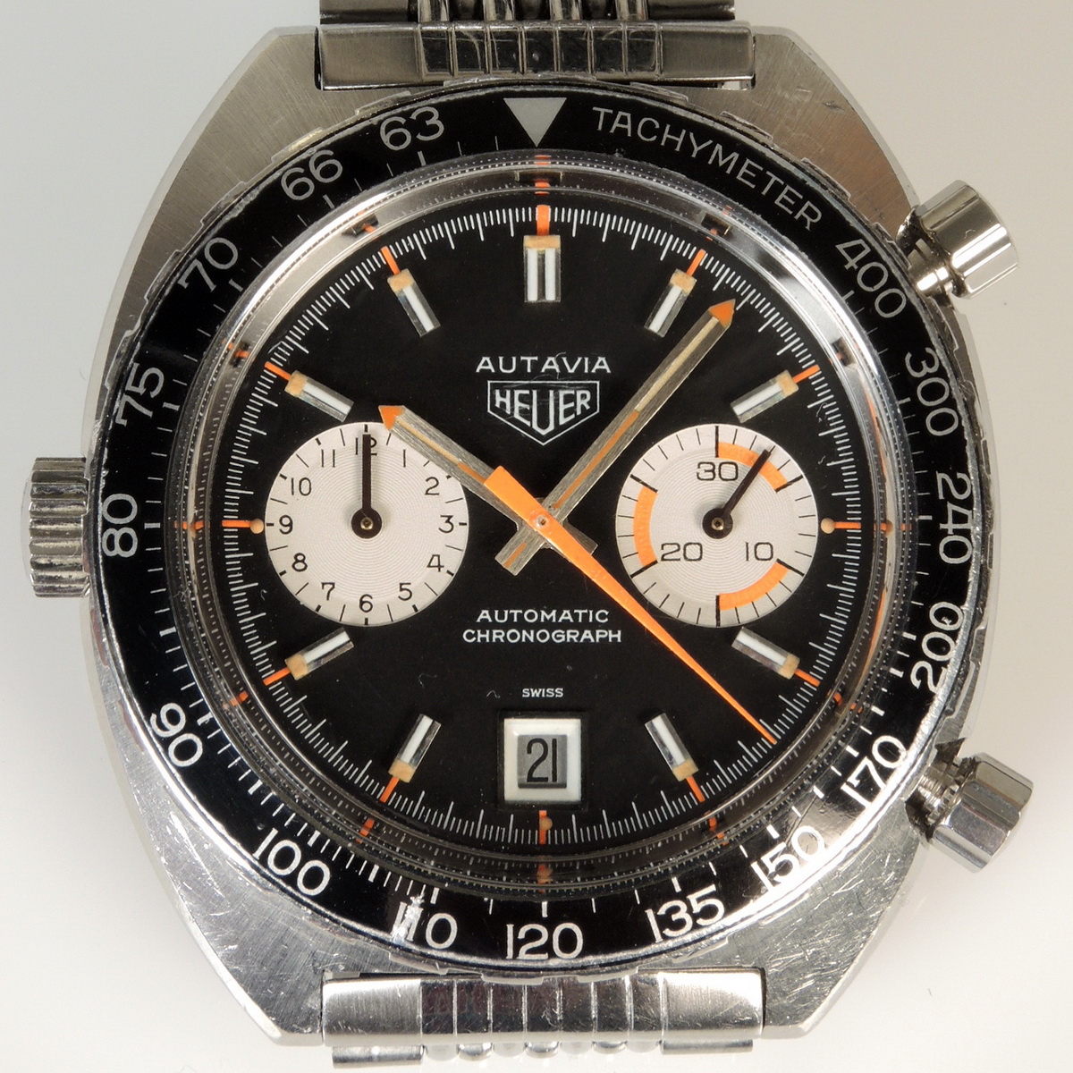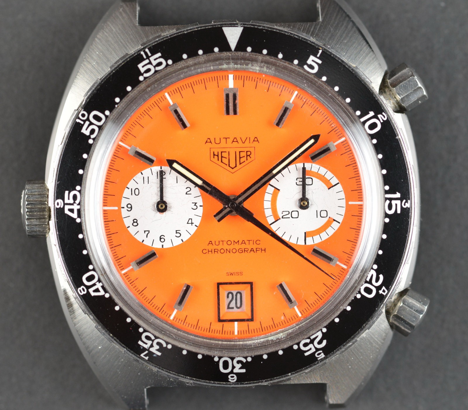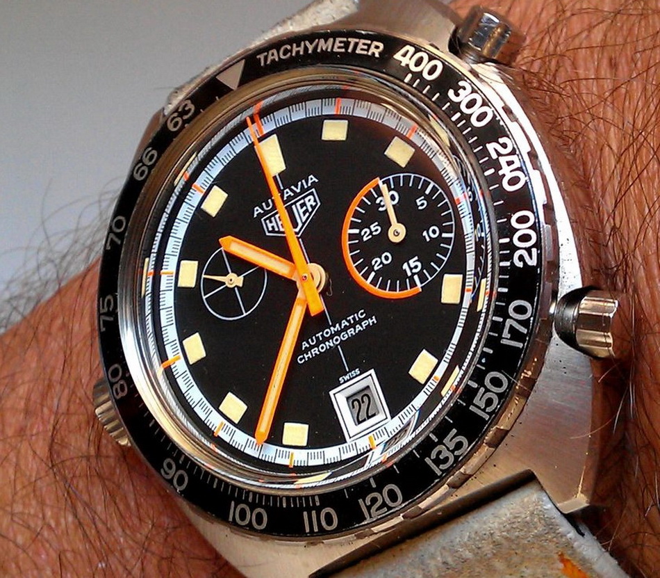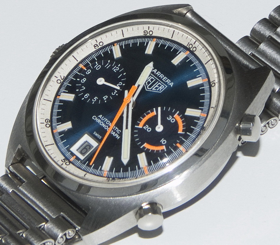 Why It’s a Grail. From the introduction of its automatic chronographs in 1969, Heuer struggled with the fact that these watches were relatively expensive, compared with other chronographs in the market. In order to offer lower-priced models, Heuer had the Calibre 12 movement (with its 12 hour capacity) modified to become the Calibre 15 movement (which deleted the hour recorder and included other modifications that would reduce the price of the watch. The Calibre 15 chronographs were introduced in 1972, with new models of the Autavia, Carrera and Monaco. While the Monaco had been the most daring of the automatic chronographs, a new model of the Calibre 15 Autavia gave the Monaco a run for its money, perhaps being the most “different” model ever made by Heuer. The case was standard fare for the Autavia, but the dial departed radically from all the previous models. The markers are painted lume rectangles, the minute recorder has a bright orange stripe around the left side, and the running seconds recorder uses crosshairs. The hashmarks for the 1/5 seconds incorporate an alternating grid design, adding a racing theme to the watch.
