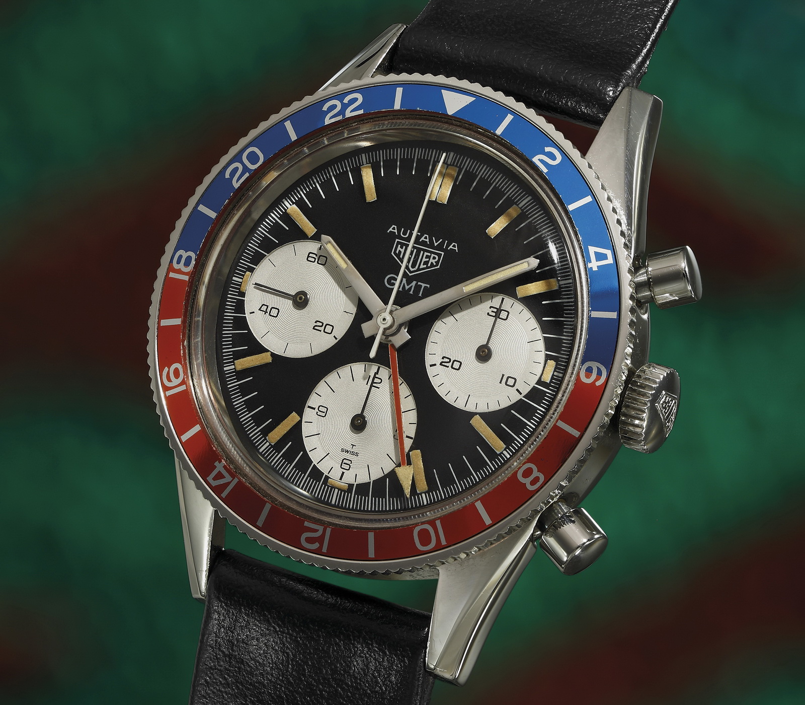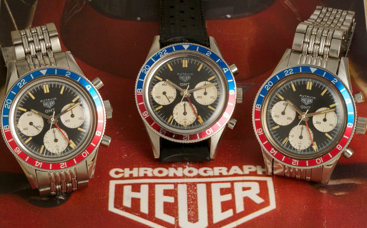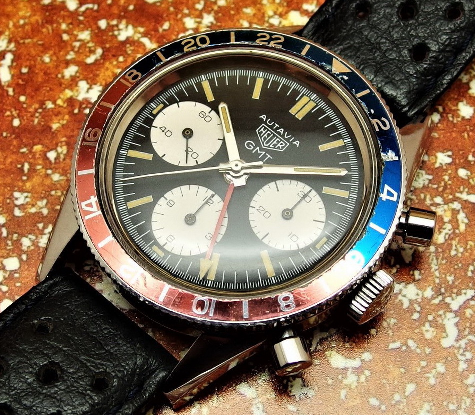 Why It’s a Grail. Heuer introduced its first GMT chronograph circa 1968, adding a GMT hand and red / blue bezel to the Reference 2446 (“Rindt”) model of the Autavia. This first model used a screw-back case, but after a short run, the Autavia GMT moved to a compressor (snap-back) case. The Autavia GMT continued in production for almost two decades, with almost a dozen models along the way, but none of them captured the elegant style of this first screw-back case. Once again, Heuer got it right the first time.