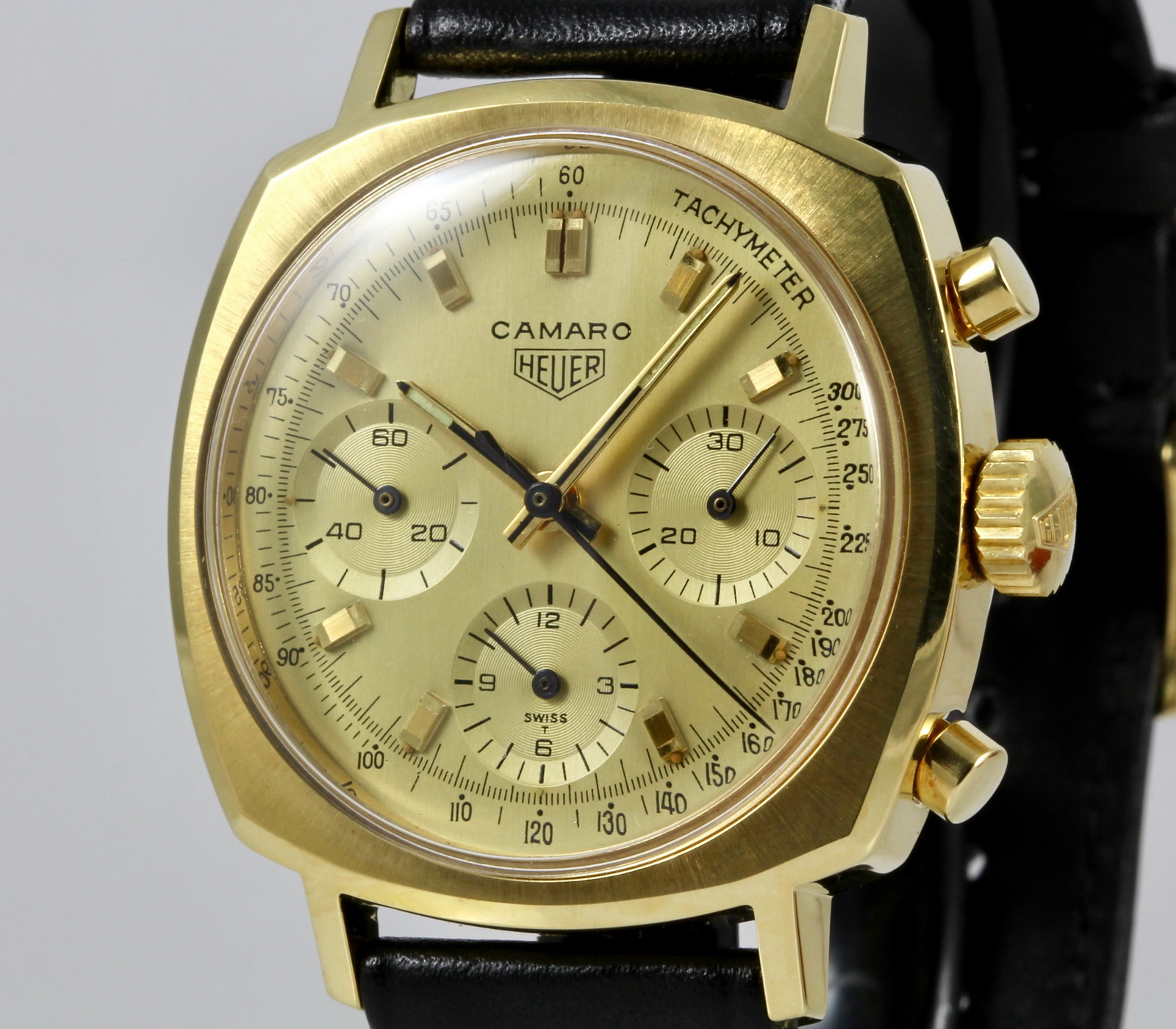 The Watch. Heuer offered two 18 karat gold versions of the Camaro Reference 7228, both three register models with champagne dials. The more common version has a champagne dial and registers, with no scale on the dial; the rare version has a tachymeter scale printed on the dial.