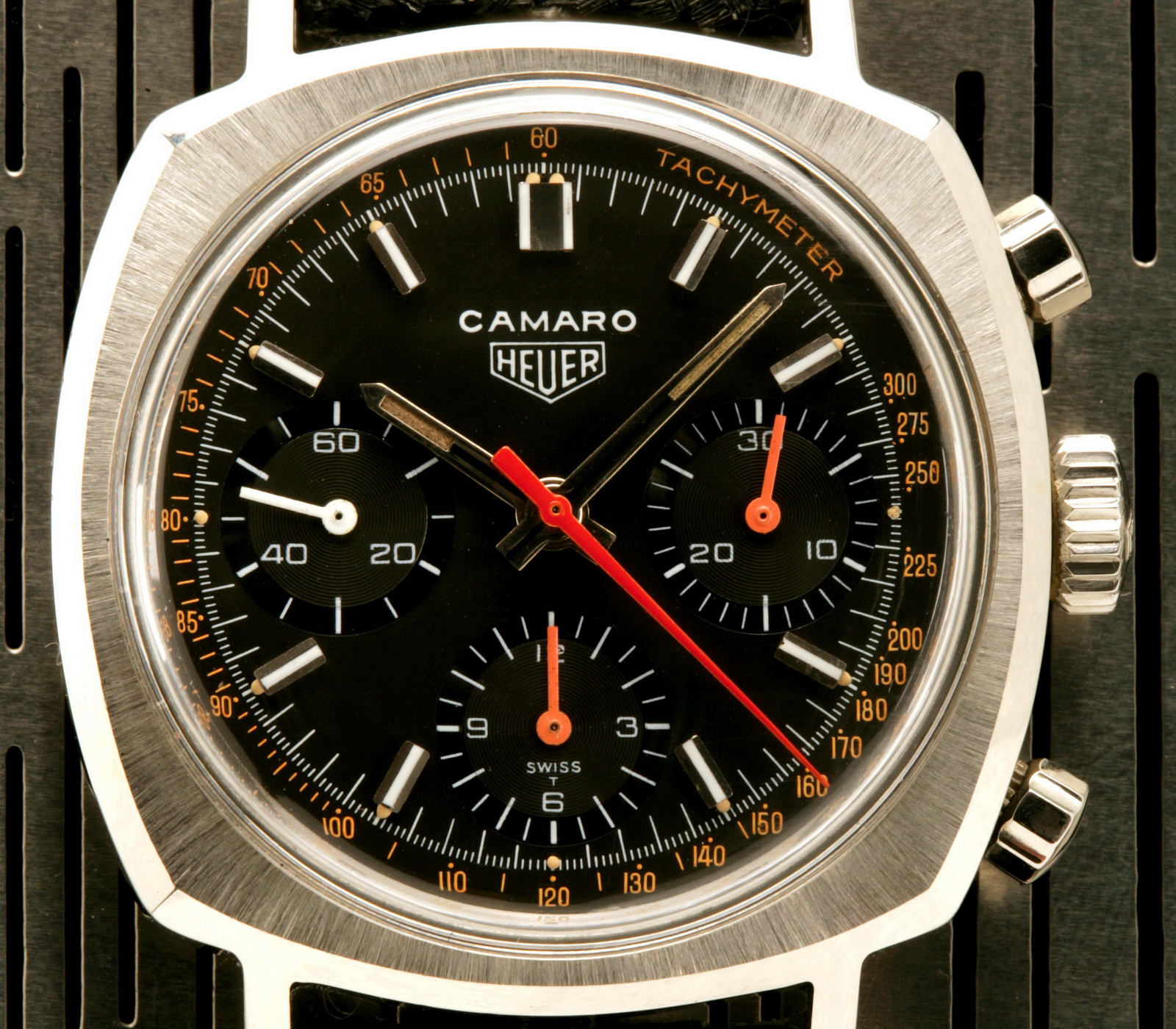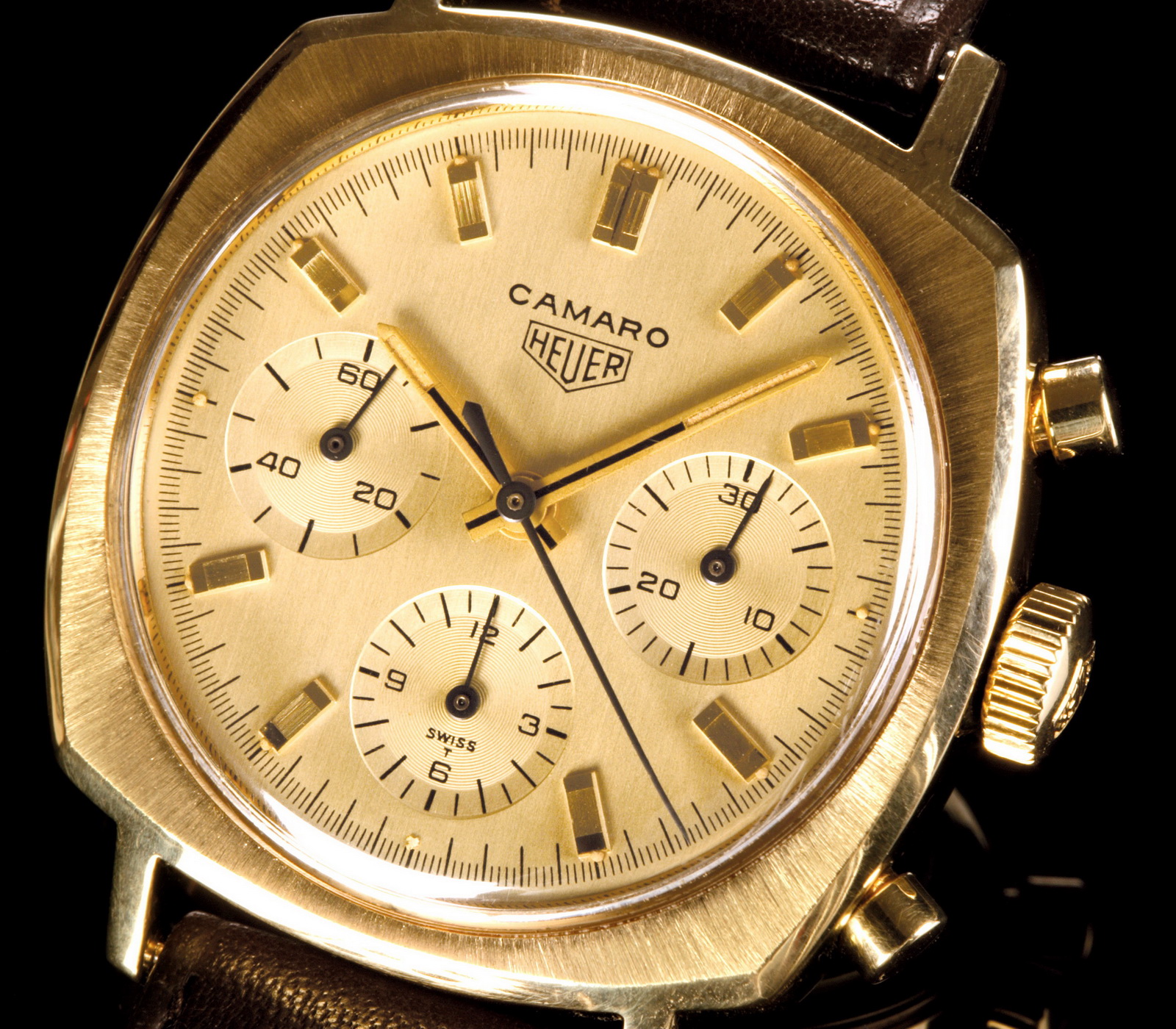 Why It’s a Grail. The Camaro has always been the red-headed stepchild of the vintage Heuer family. It was introduced in 1968, but was left at the alter when Heuer transitioned to automatic chronographs the following year (i.e., Heuer went with automatic versions of the “Big Three” (Autavia, Carrera and Monaco), while the Camaro slowly receded from view). It’s an unusual shape – not round, not square, not C-shape . . . maybe cushion-shaped, but maybe not. Still, the Camaros have a dedicated following of enthusiasts, with the “exotic” models being at the top of the usual Camaro pyramid. But I am going a different direction, because collectors who have seen the 18 karat gold Camaro “in the metal” will often come away believing that they have seen something special. The Camaro fits well on the wrist, and in gold it takes on the feel of a special medallion.