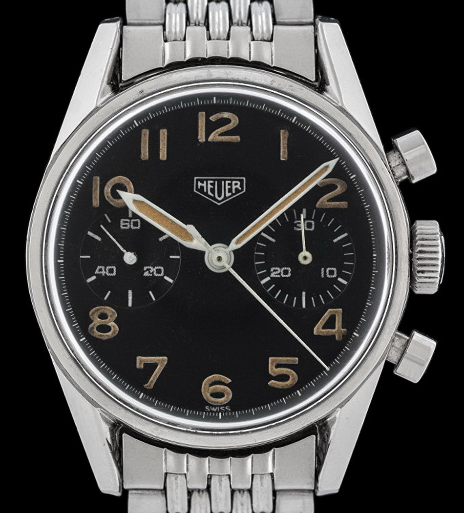 Why It’s a Grail. Heuer added three-register chronographs to its line-up of two-register chronographs in around 1942. The three-register models included a variety of options — dials could be either white or black; cases could be either waterproof (screw-back) or non-waterproof (snap-back); dial and hands were either painted with radium or non-radioactive paint; and there were also choices of tachymeter and telemeter scales. Today, it’s the waterproof cases that attract the following, with the Reference 2447 series, powered by the Vajoux 72 movement, and the Reference 346 model, powered by the Valjoux 71 movement. Within this range of watches, the Reference 2447 with the black dial has become the grail. The Reference 2447 was the true “pre-Carrera”, with the case’s angular lugs foreshadowing those of the Carrera.