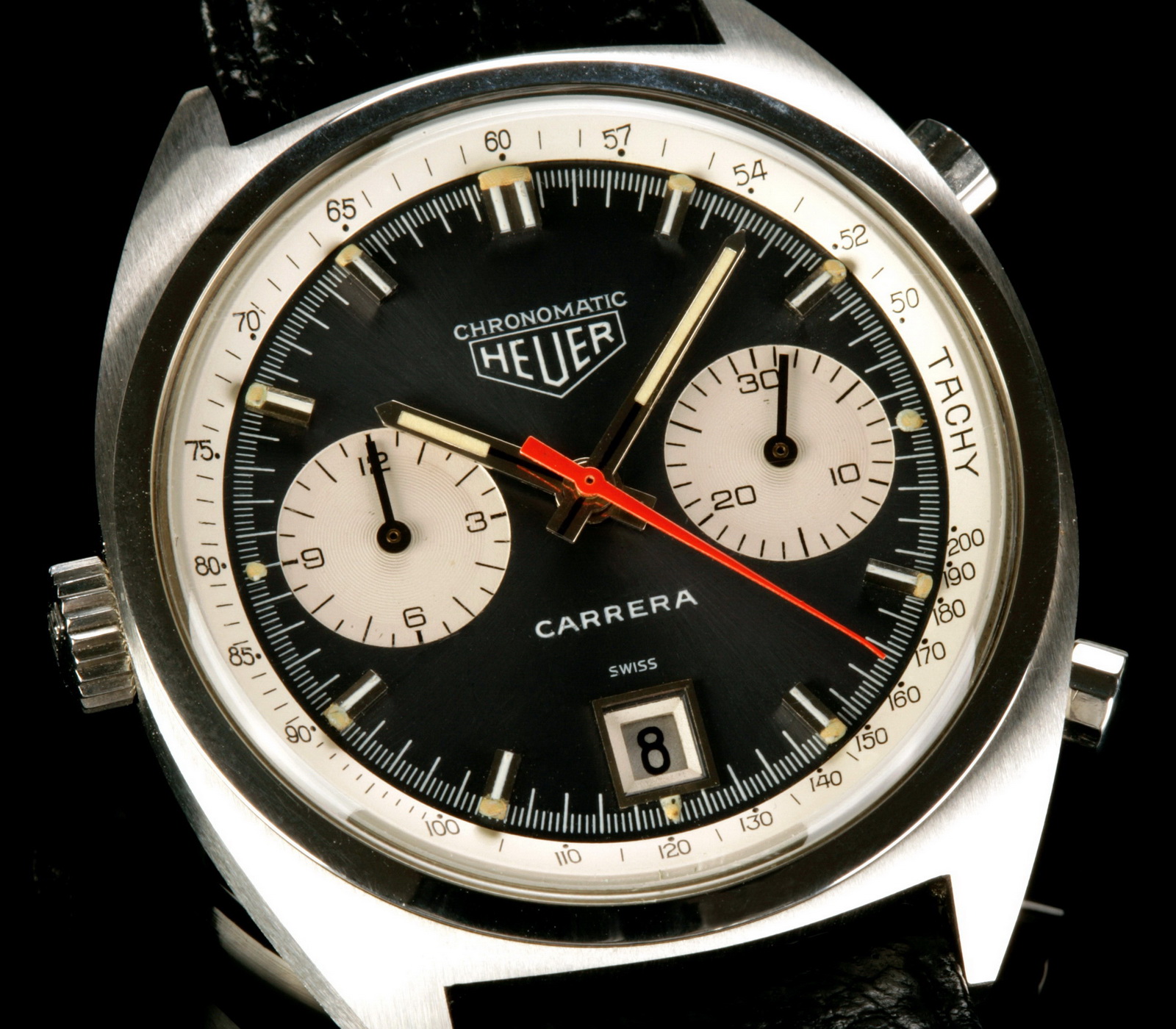 Why They are Grails. Heuer led the joint venture — with Breitling, Hamilton-Buren and Dubois Depraz – that developed the first automatic chronographs to be offered in retail channels around the world. Introduced in Summer 1969, the very first samples made by Heuer had the name “Chronomatic” printed with the Heuer shield across the top of the dial, with the model name written below (Autavia, Carrera or Monaco). Heuer quickly discontinued the use of the “Chronomatic” name, as customers in the large U.S. market did not see the name “Chronomatic” as indicating that the watch was an automatic chronograph. Accordingly, the later, standard production models had the model name with the Heuer shield across the top of the dial, with “Automatic Chronograph” printed across the bottom.