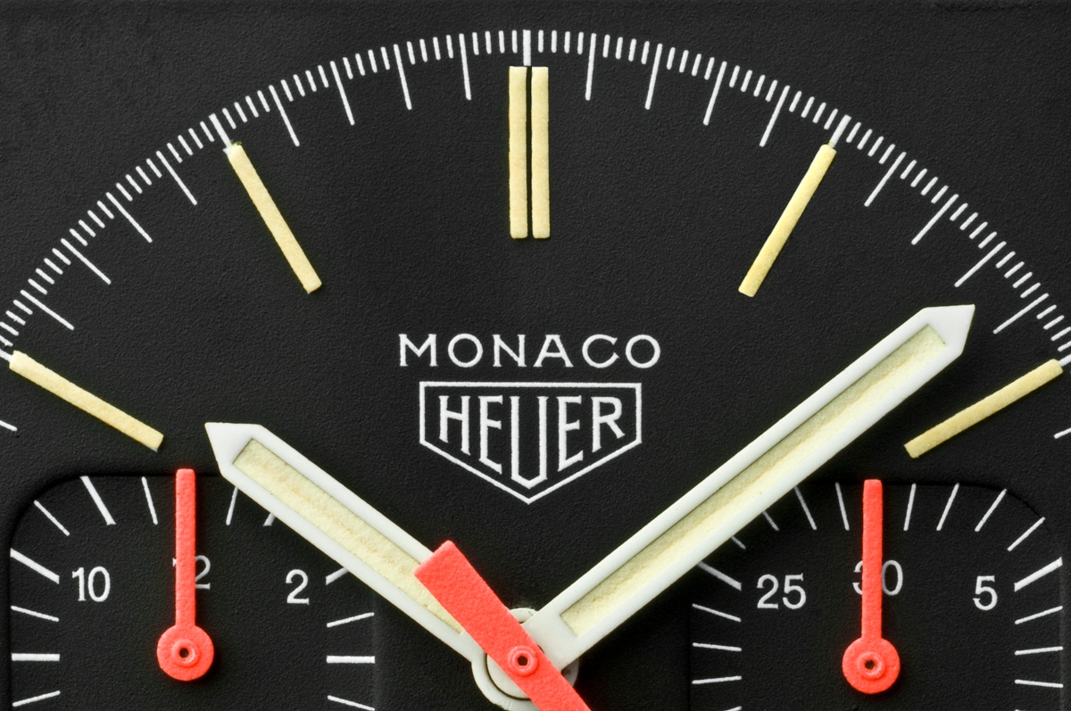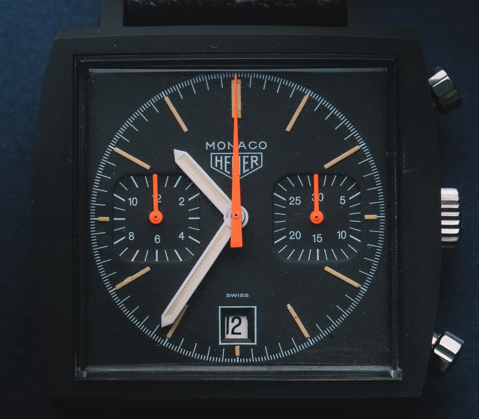 The Watch. The Monaco Reference 74033 N chronograph has a black-coated case, with a black dial and registers, painted white hands for the time of day (hours and minutes), and bright orange hands for the chronograph (hours, minutes and seconds).