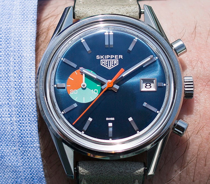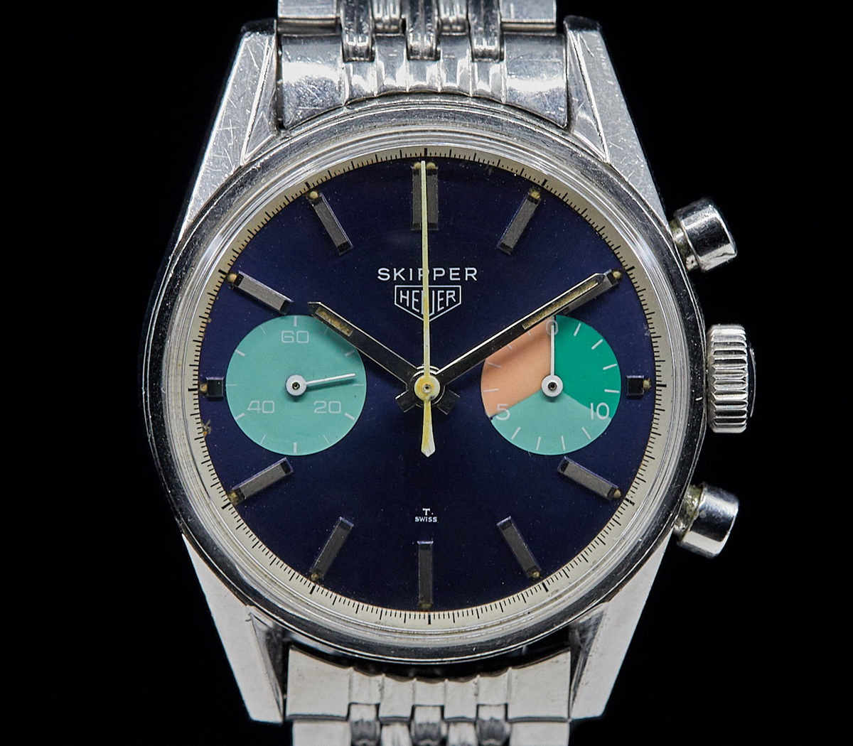 Why It’s a Grail. Heuer had a long tradition in yacht timing, and in 1967 supplied the timing gear for the yacht Intrepid when it successfully defended the America’s Cup, off Newport, Rhode Island. The celebrate the victory, Heuer introduced an entirely new chronograph, the Skipper. With a 15-minute recorder to count-down to the start of a race, and bright blue, orange and green colors matching those of the Intrepid, the Skipper was built for yacht racing. This first Skipper was housed in the case used for the Reference 7753 Carrera and the Valjoux 7730 was modified to go from 30 minute capacity to 15 minute capacity. All subsequent versions of the Skipper would be housed in cases used for the Autavia. The America’s Cup connection, wild color scheme, and Carrera connection combine to make the “Skipperrera” one of the vintage Heuers most coveted by collectors.