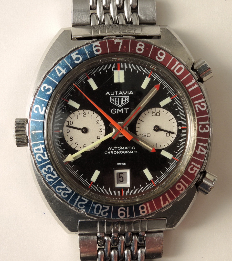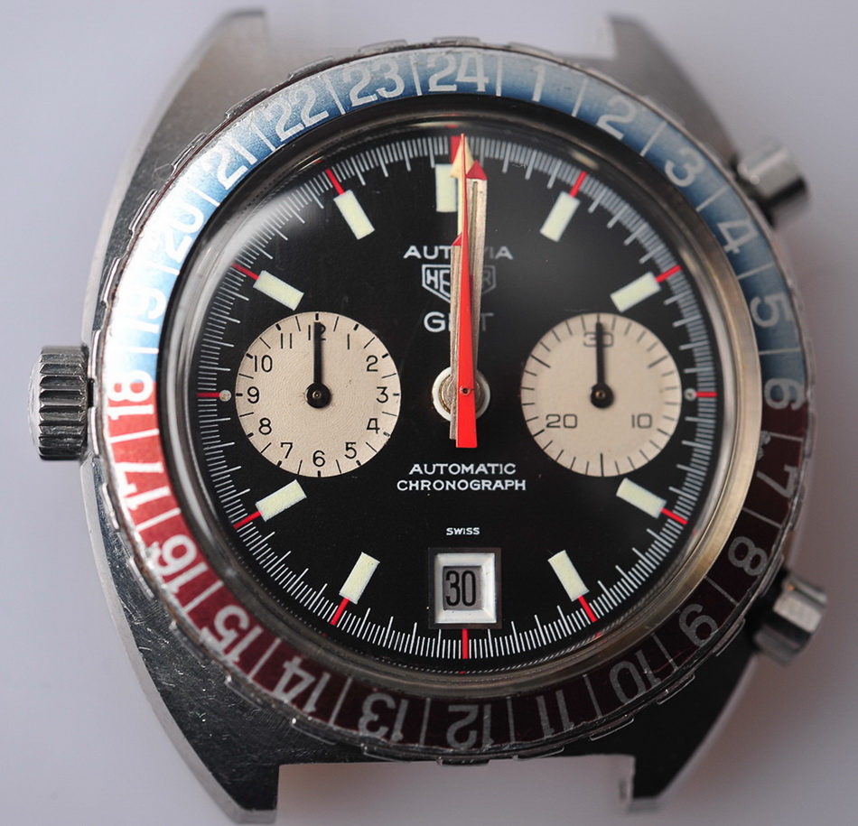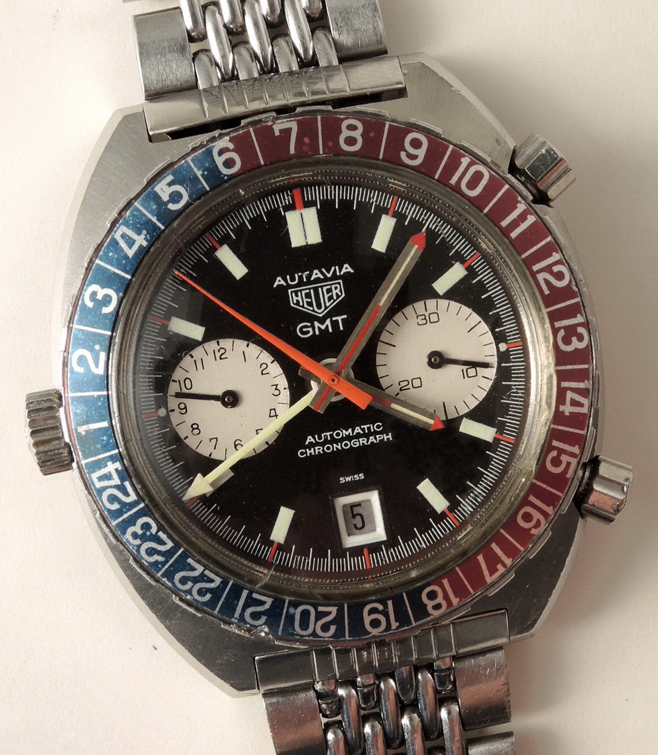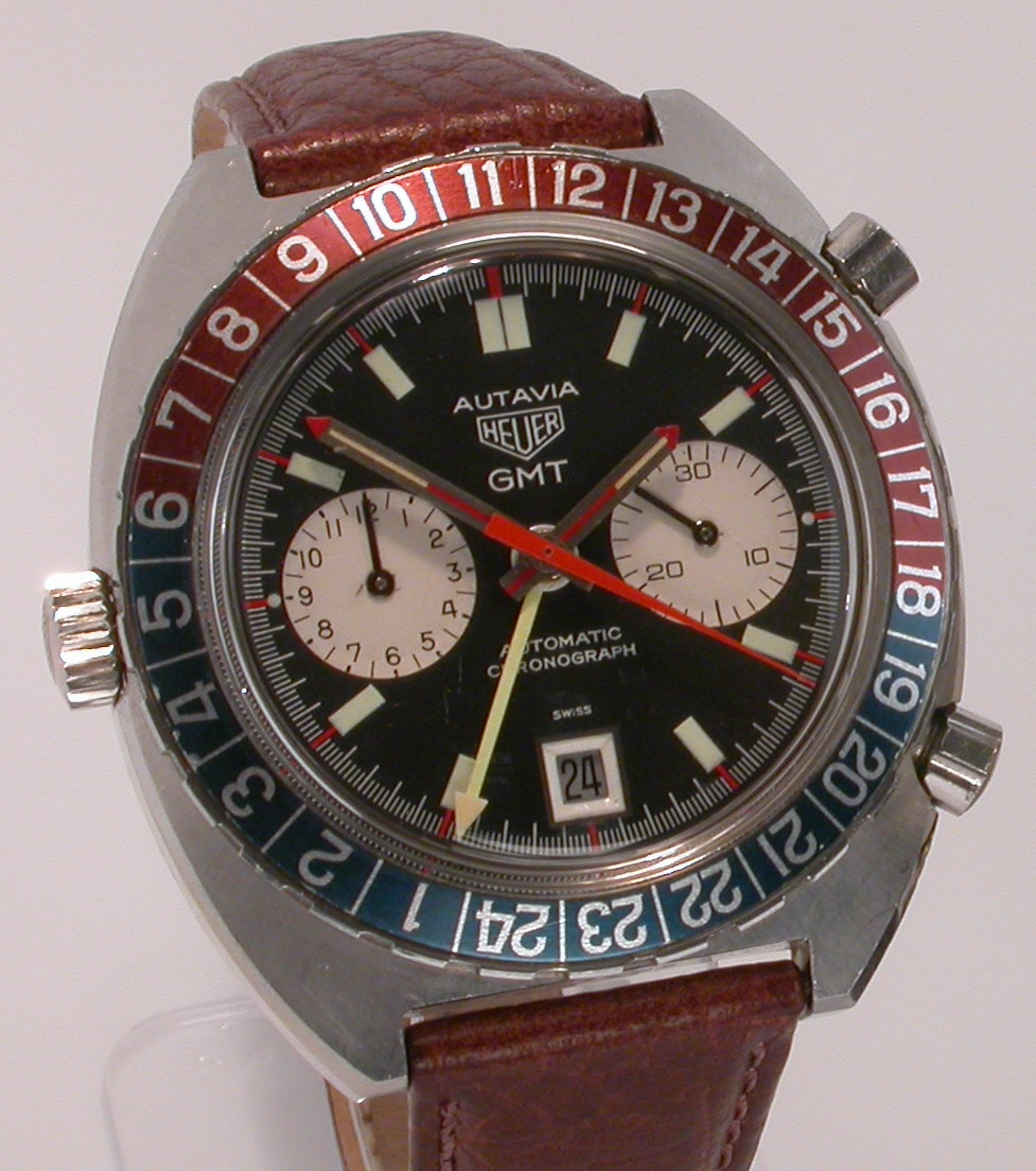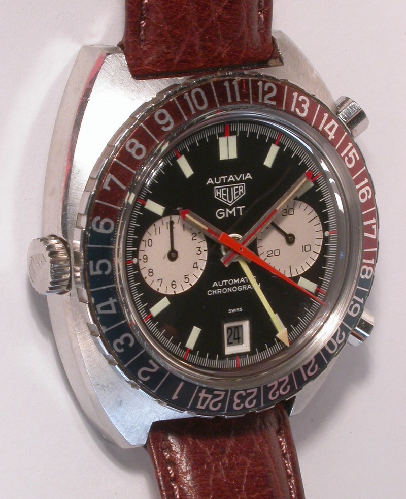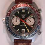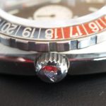 24 numbers on GMT bezel; brushed steel hands, with red and luminous inserts and red tips
