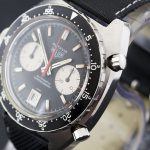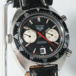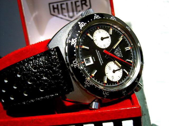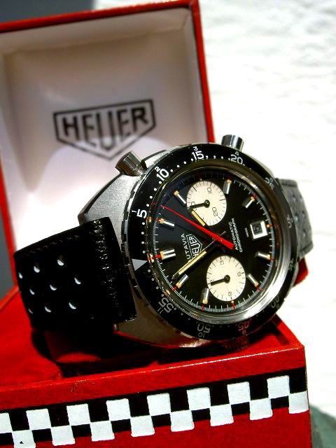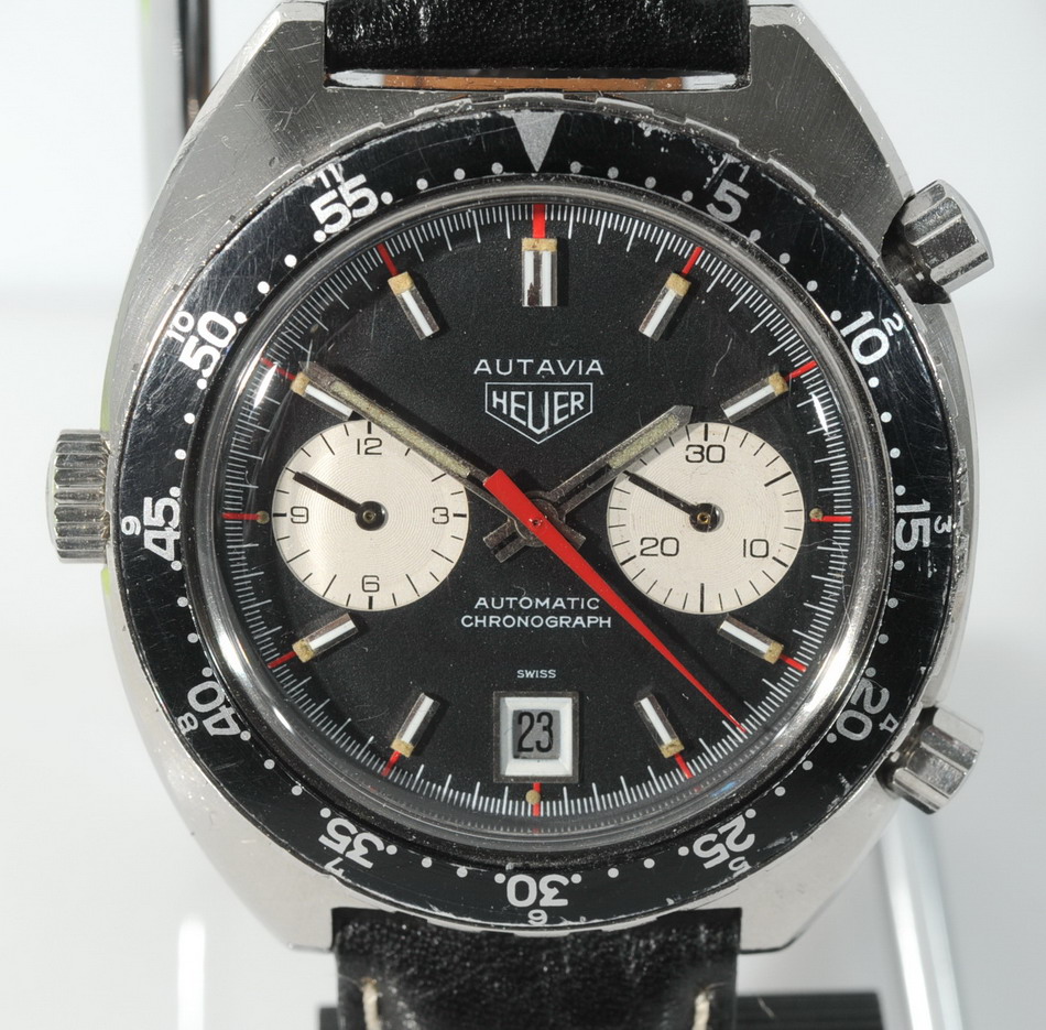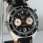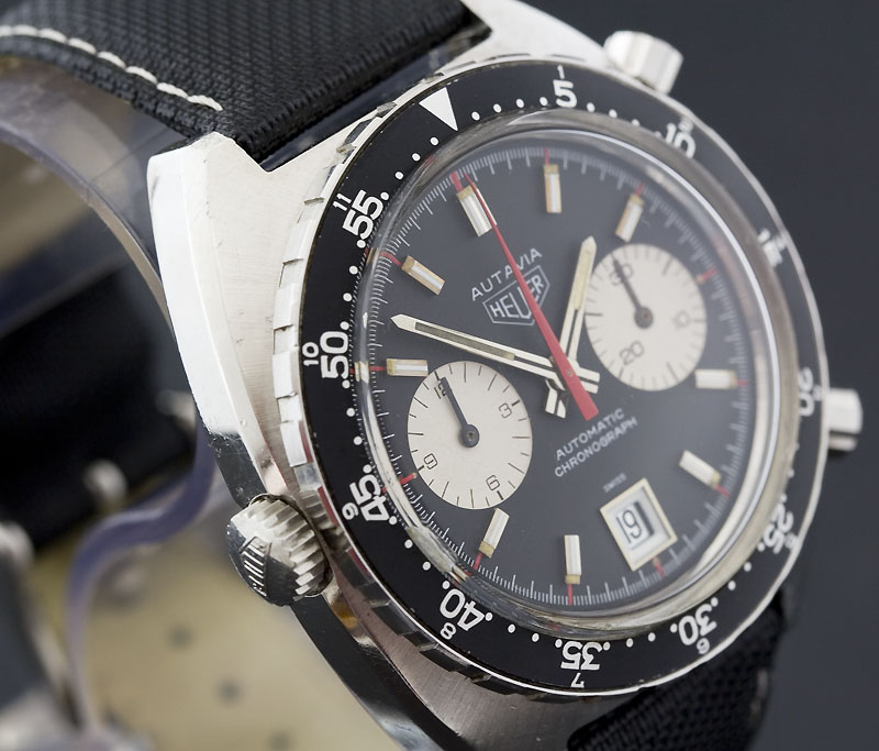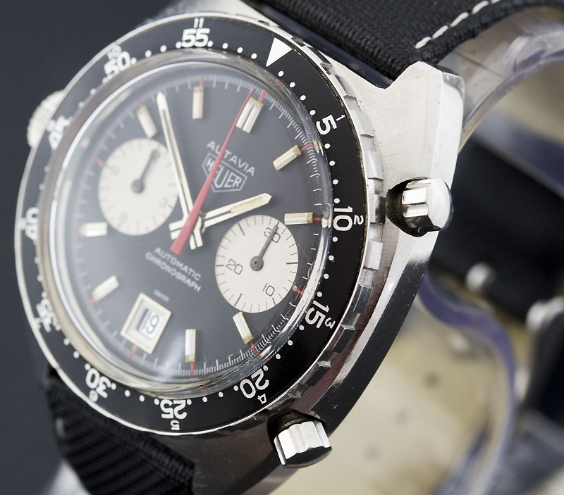 Autavia Reference 1163 MH Mark 5 has 3-6-9-12 on hour recorder; polished steel markers, with luminous inserts; polished steel hands with luminous and black inserts