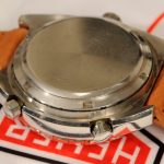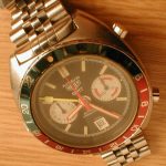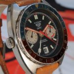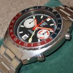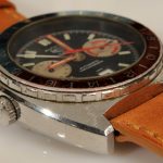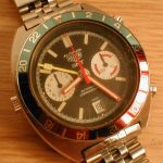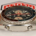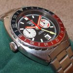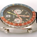White registers, with red stripes on minute recorder; Hands have red edges and full luminous inserts