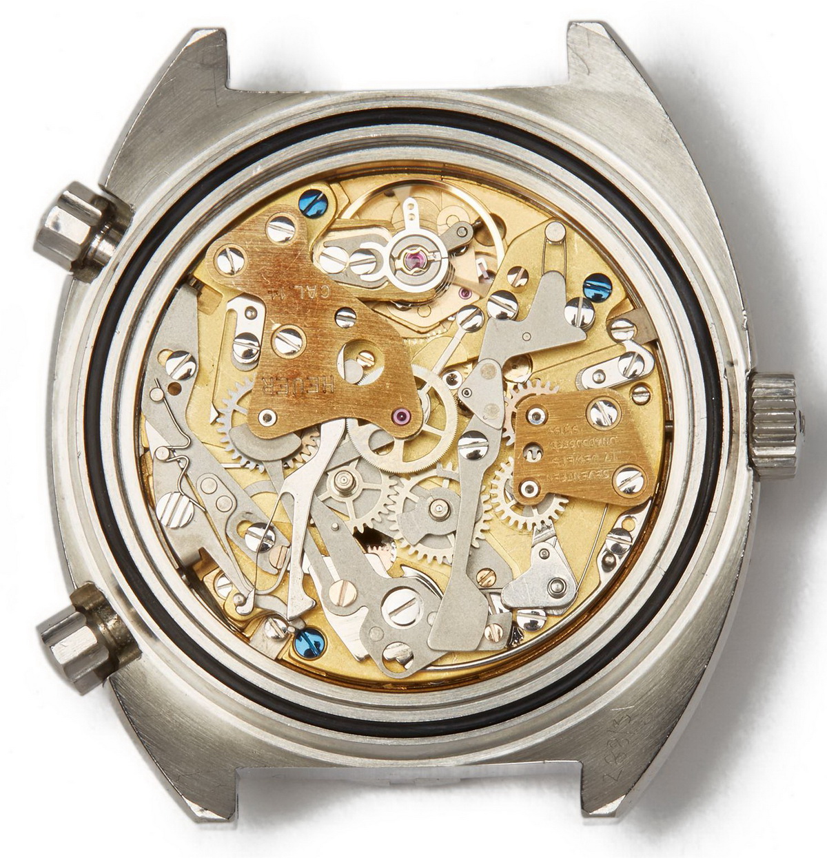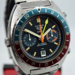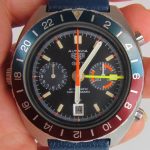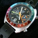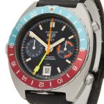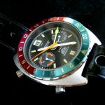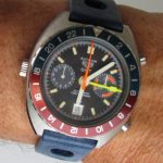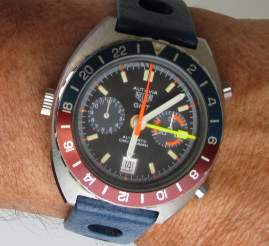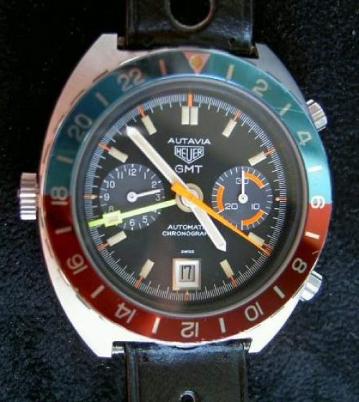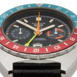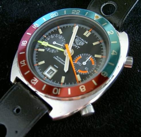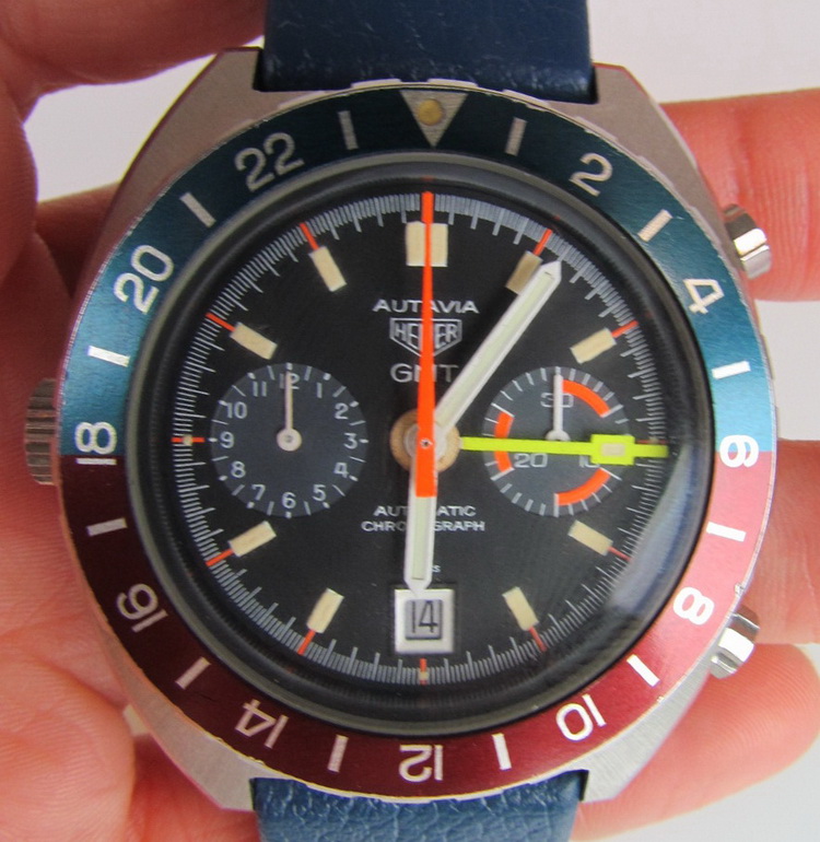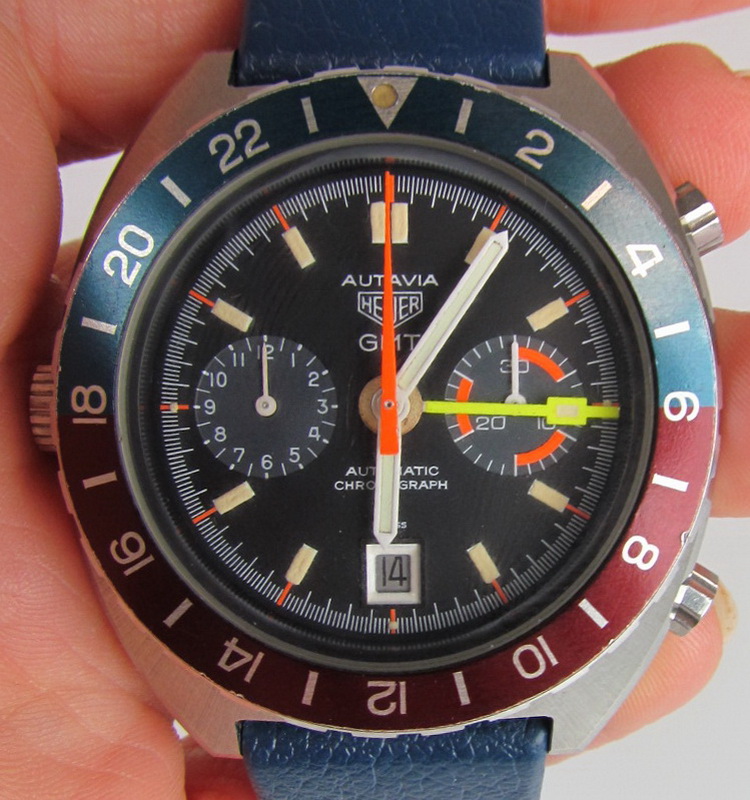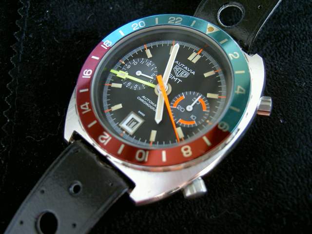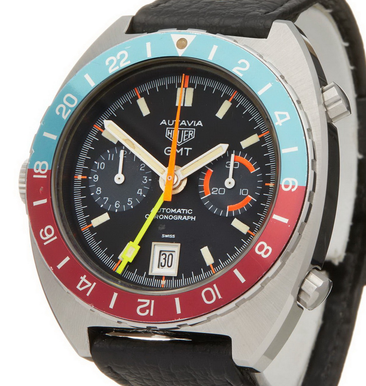 Charcoal registers, with orange stripes on minute recorder; Hands have white edges and full luminous inserts