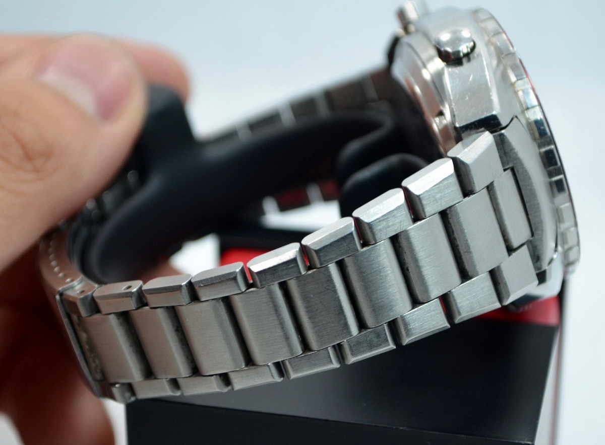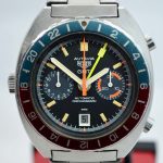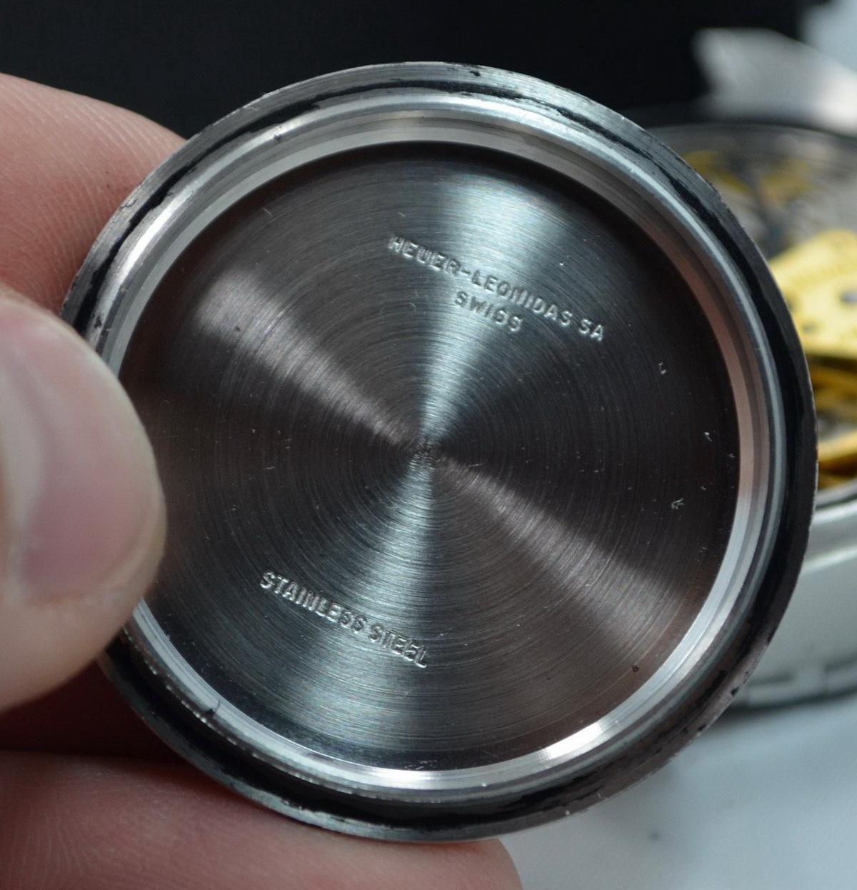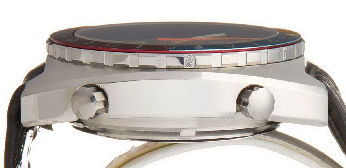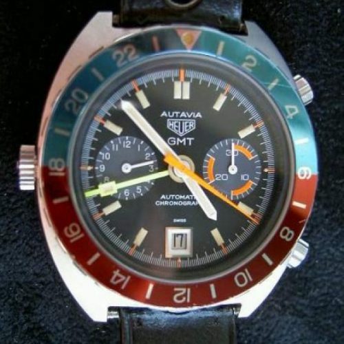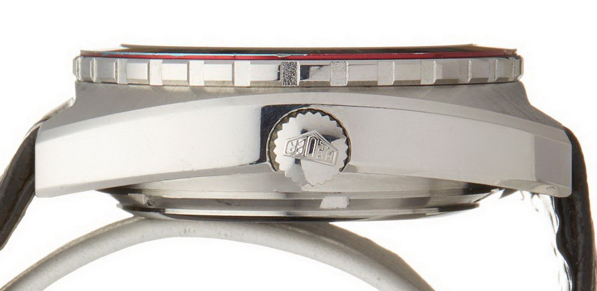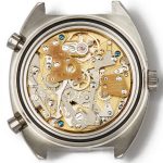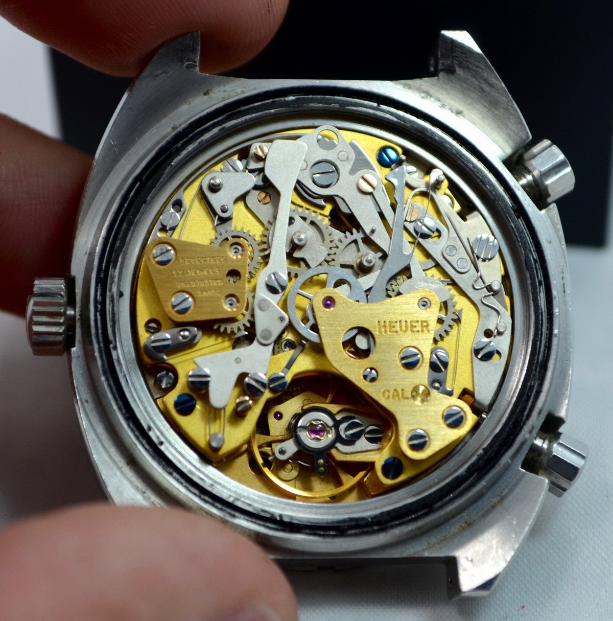Charcoal registers, with orange stripes on minute recorder; Hands have white edges and full luminous inserts