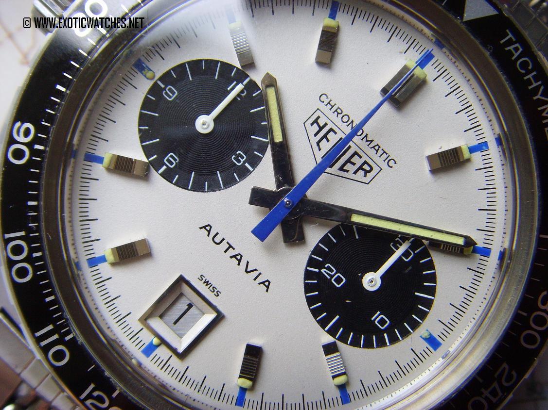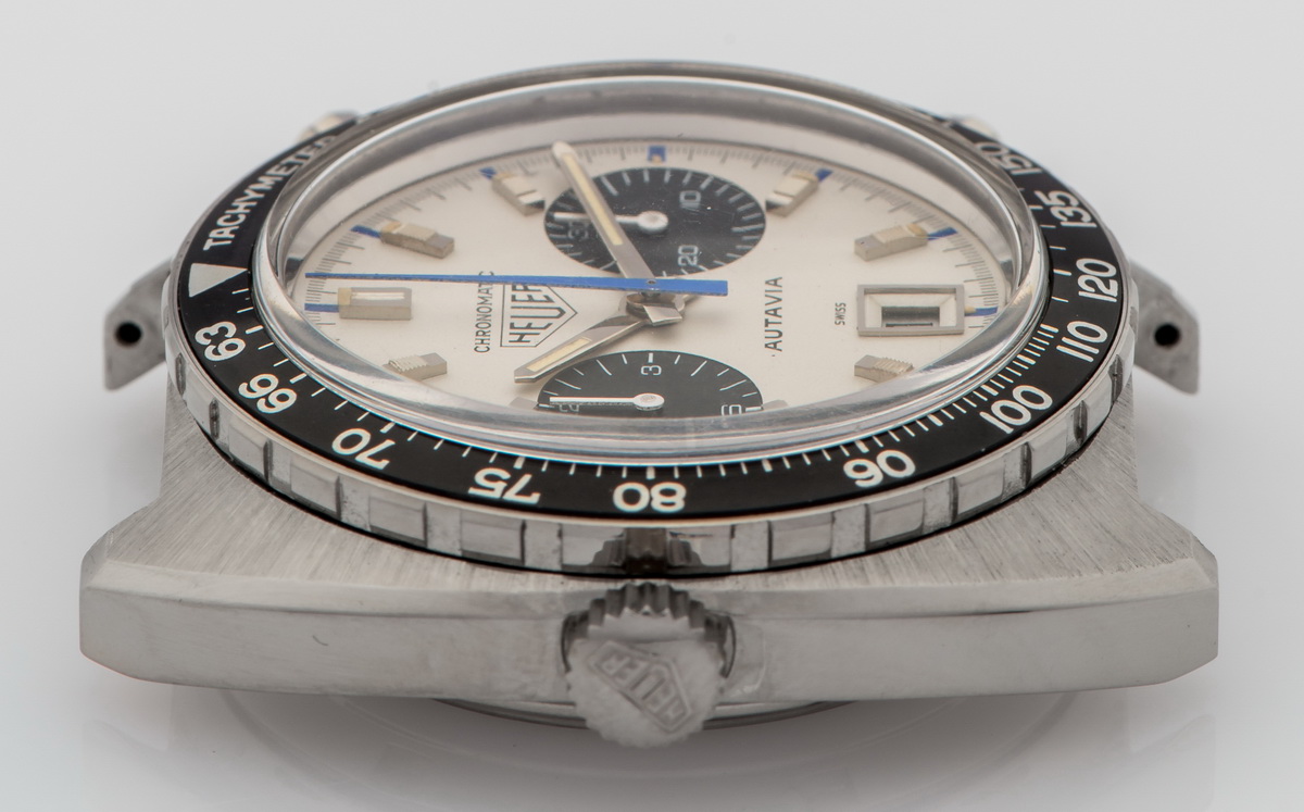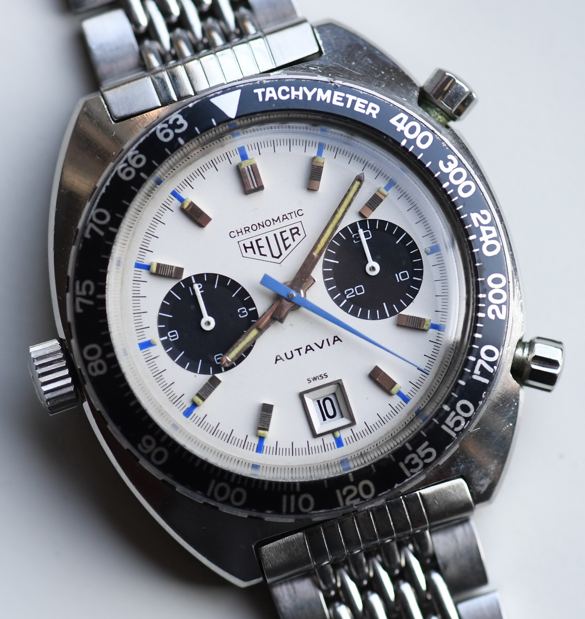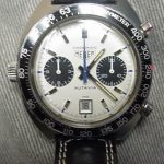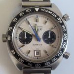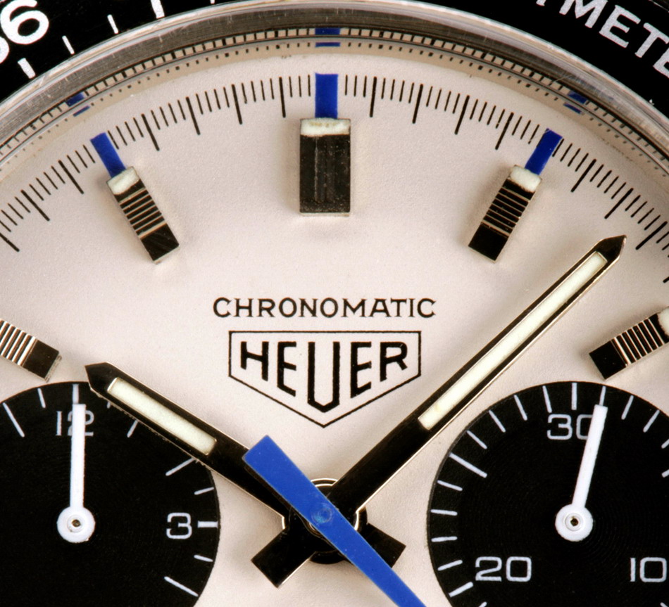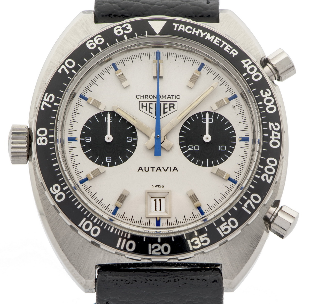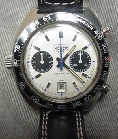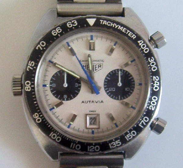 "Chronomatic" above Heuer logo; "Autavia" on lower half of dial; 3-6-9-12 on hour recorder; ridged markers; polished steel hands with luminous inserts