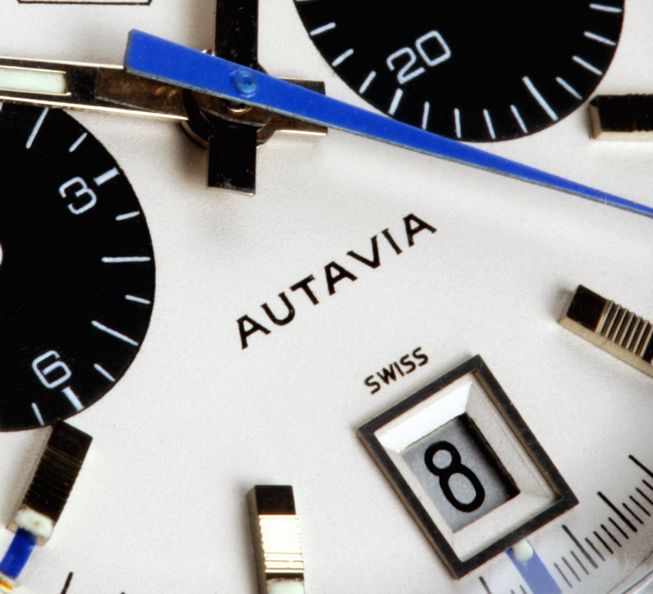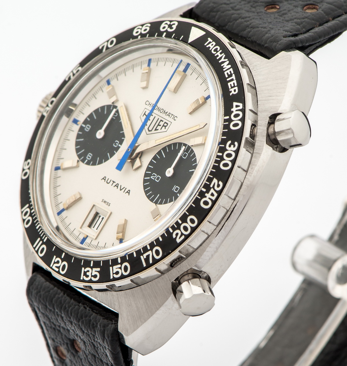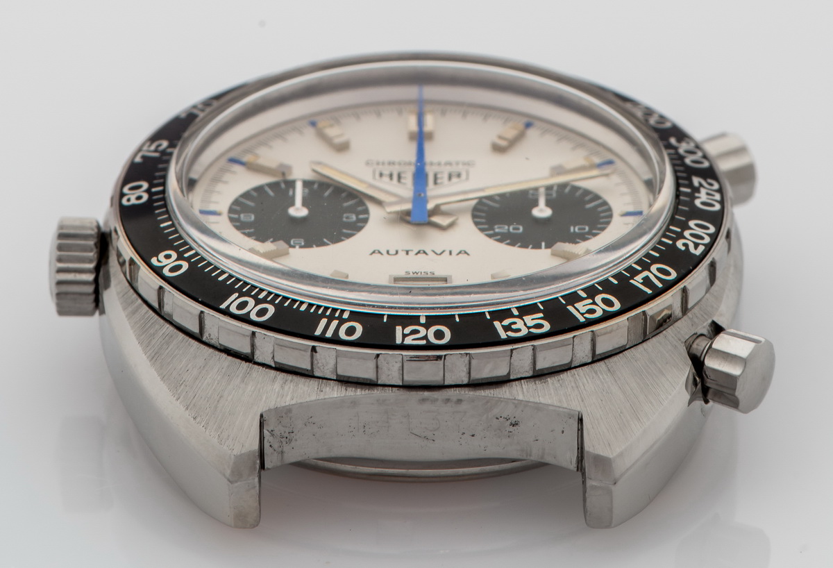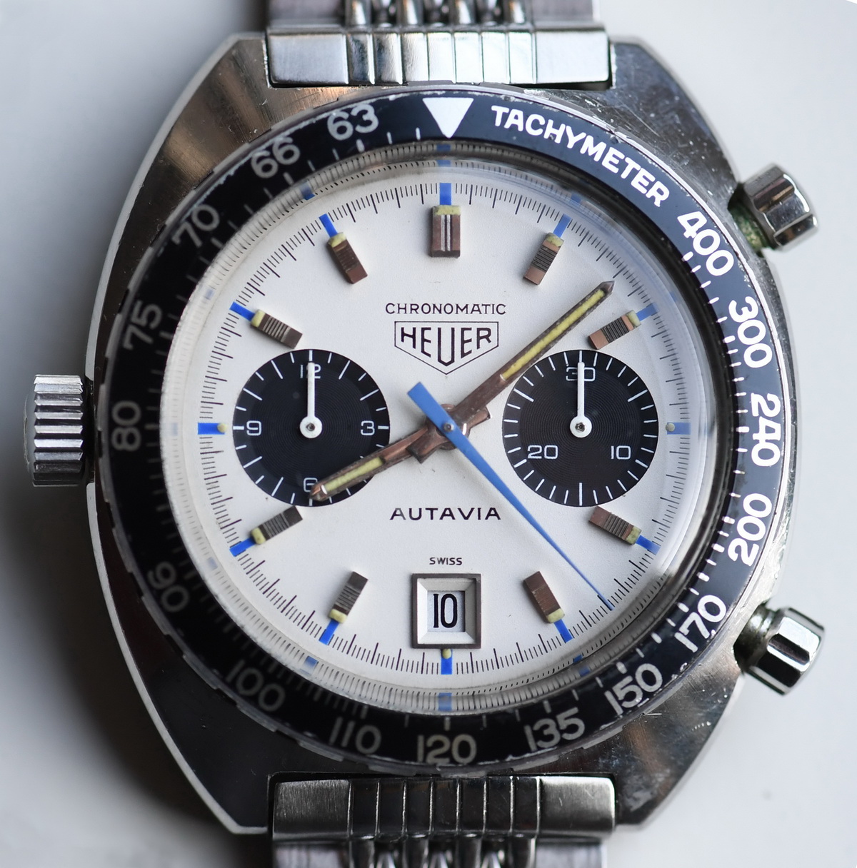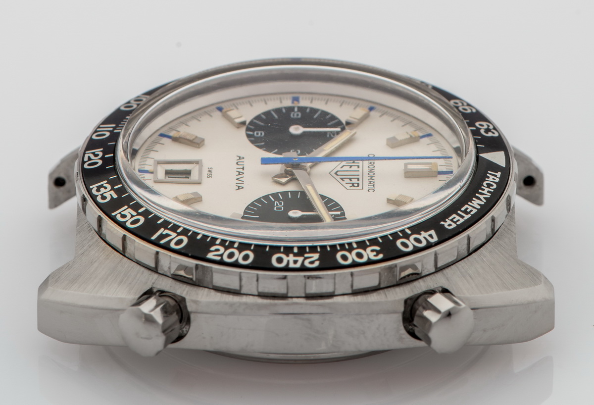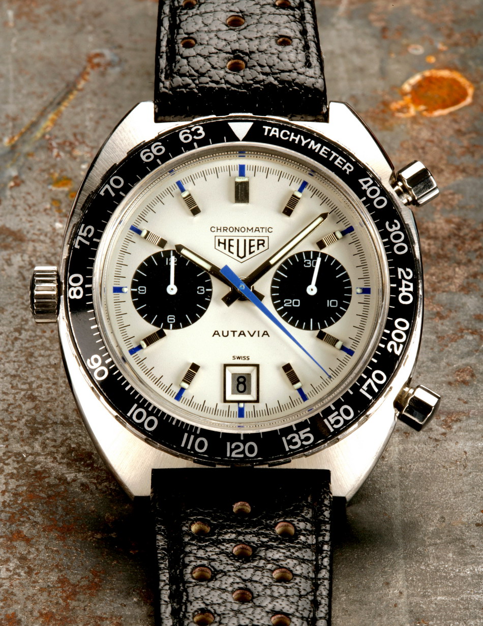 "Chronomatic" above Heuer logo; "Autavia" on lower half of dial; 3-6-9-12 on hour recorder; ridged markers; polished steel hands with luminous inserts