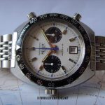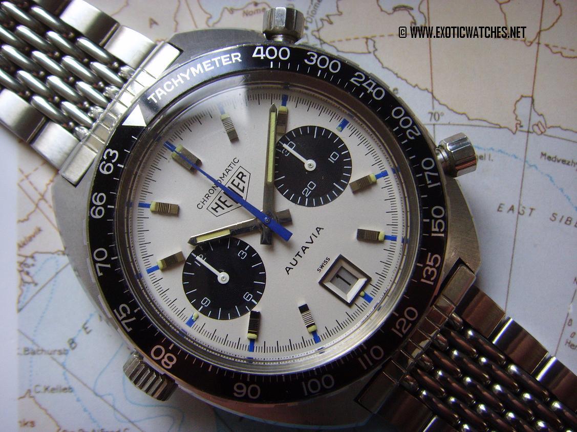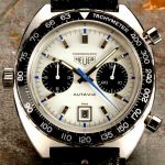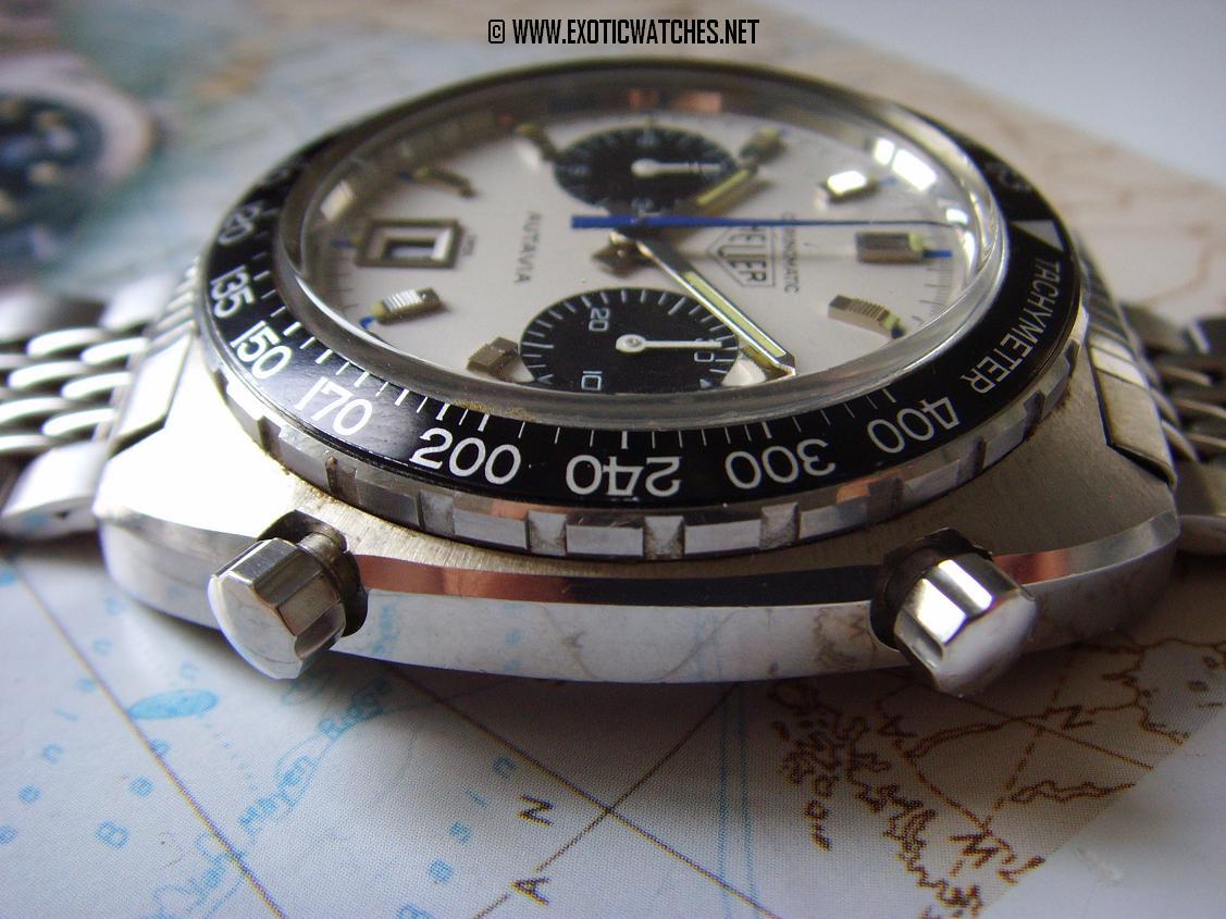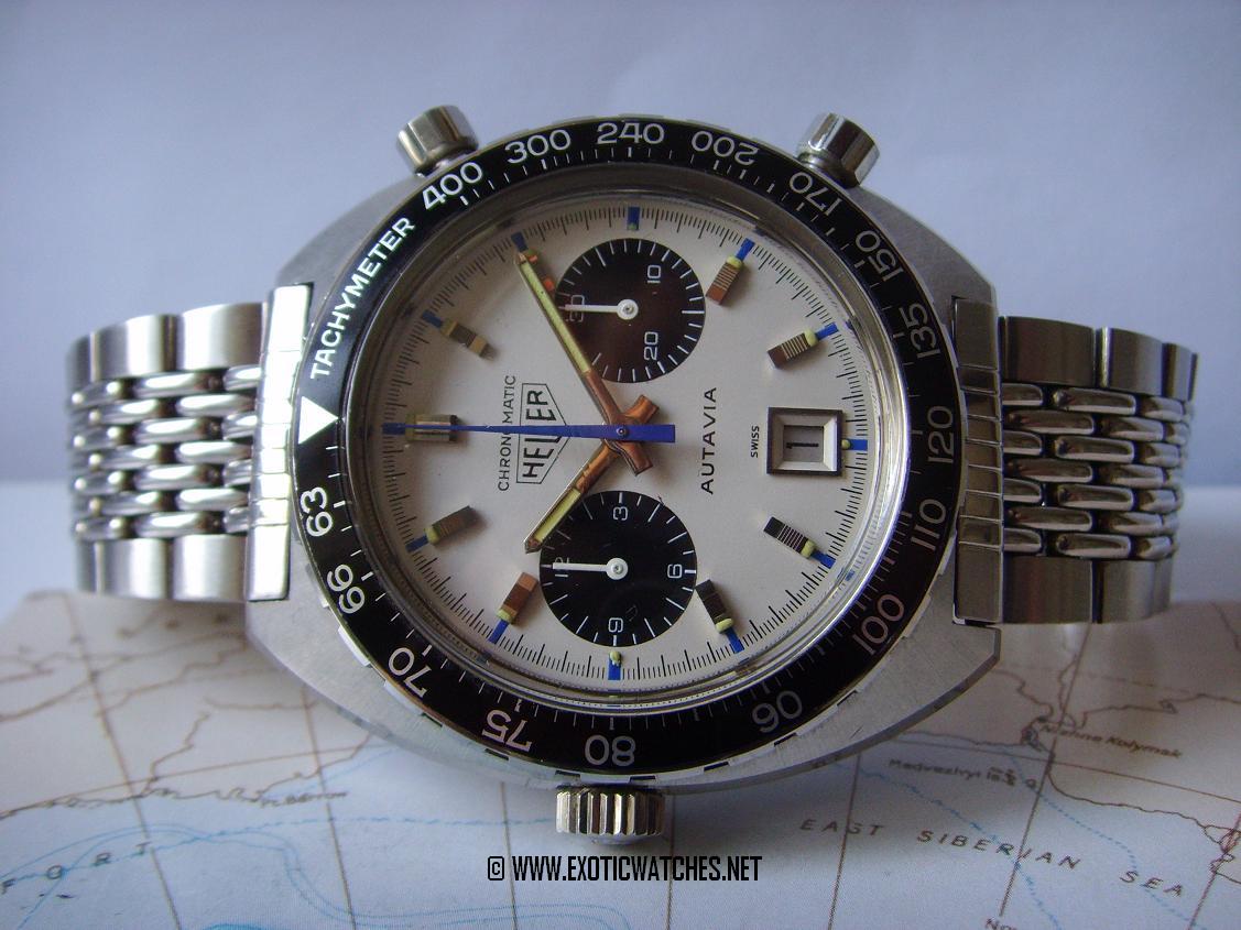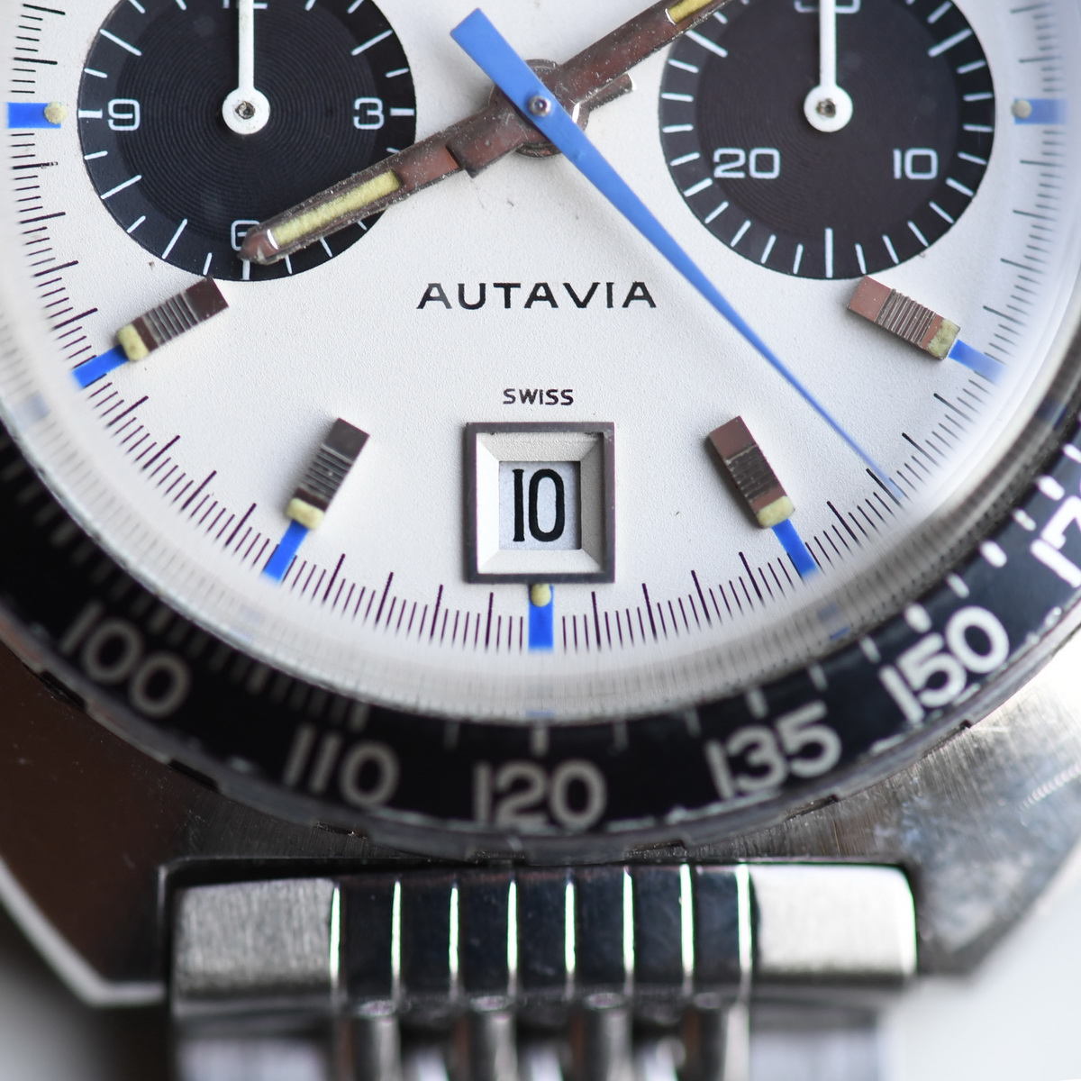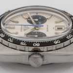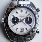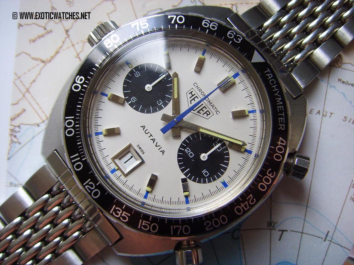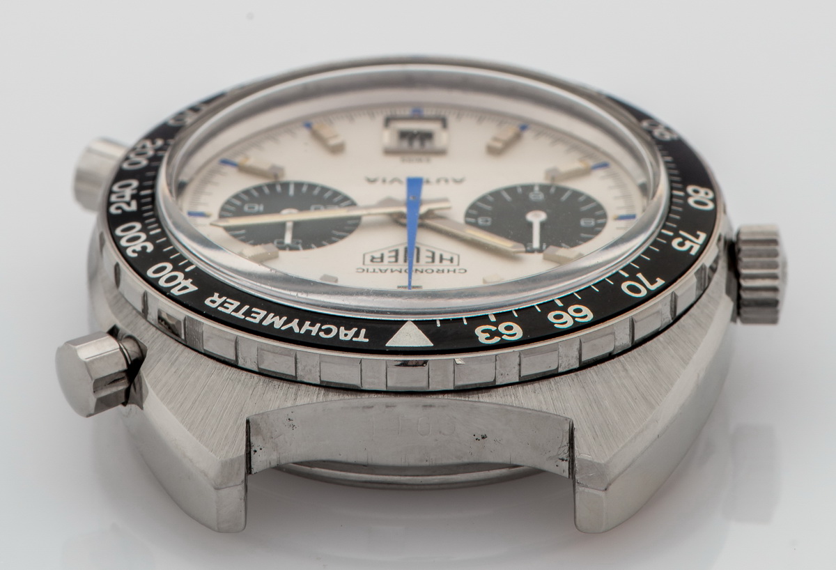 "Chronomatic" above Heuer logo; "Autavia" on lower half of dial; 3-6-9-12 on hour recorder; ridged markers; polished steel hands with luminous inserts