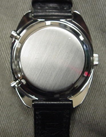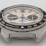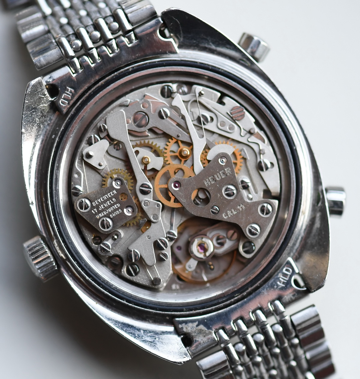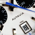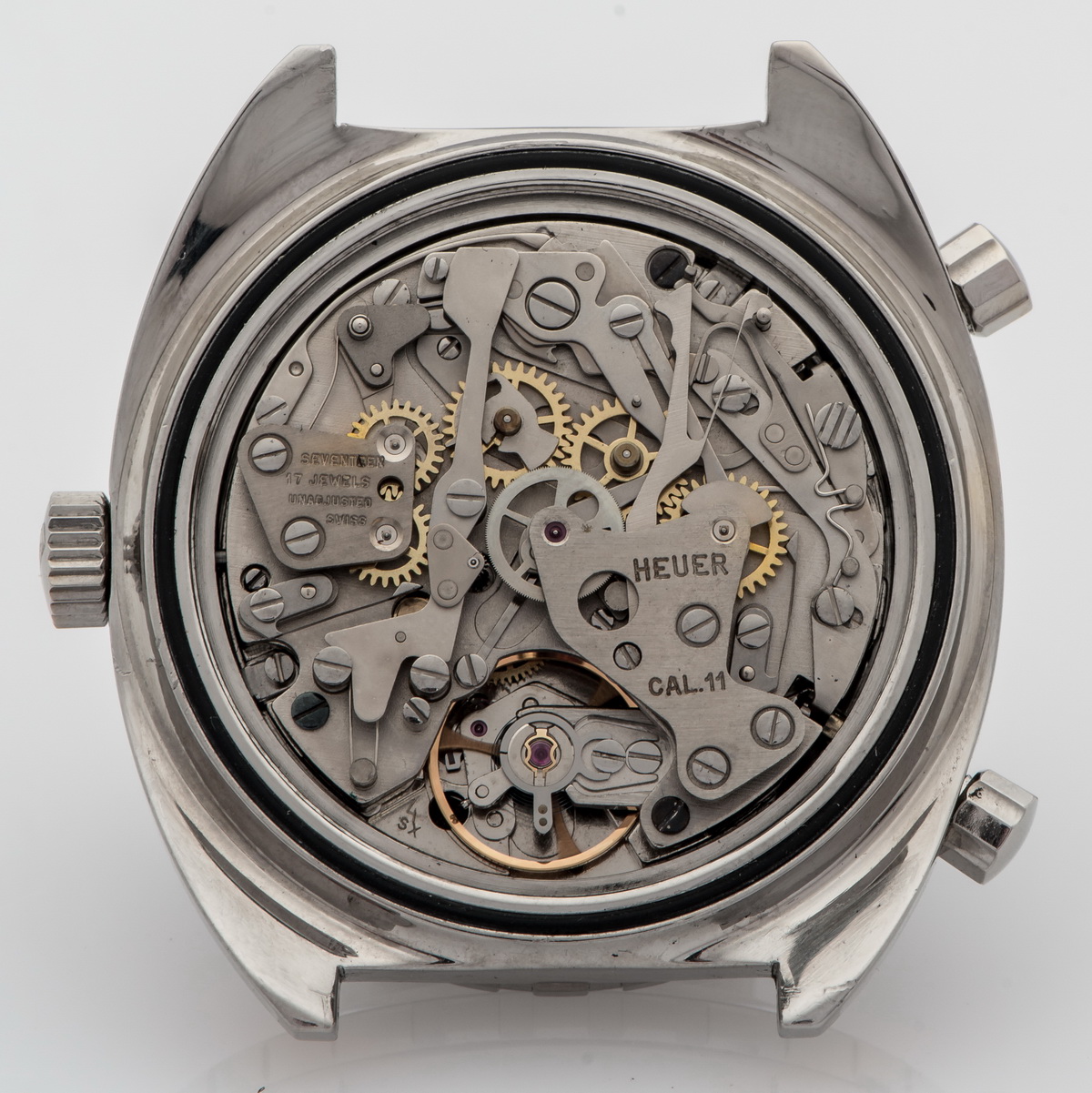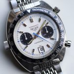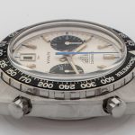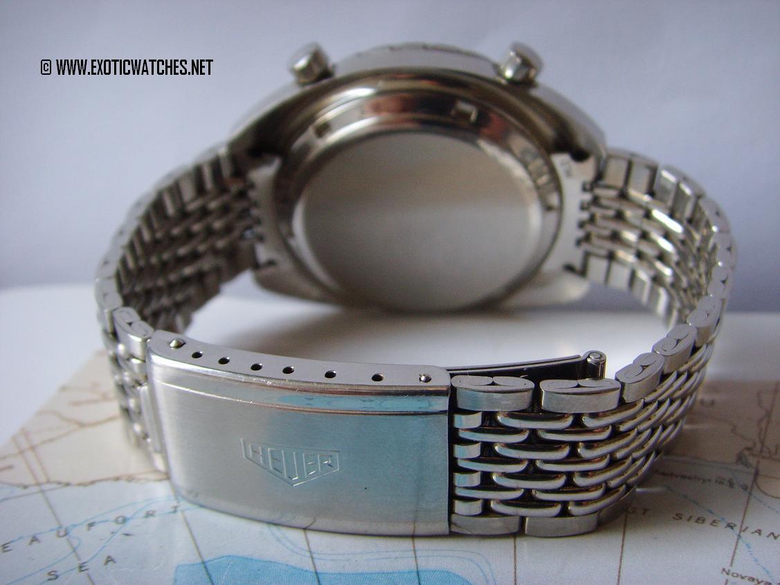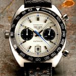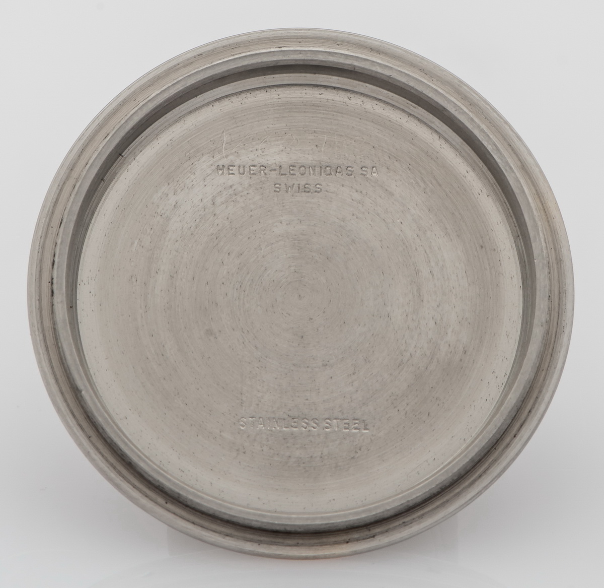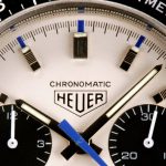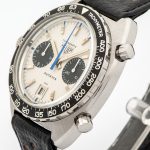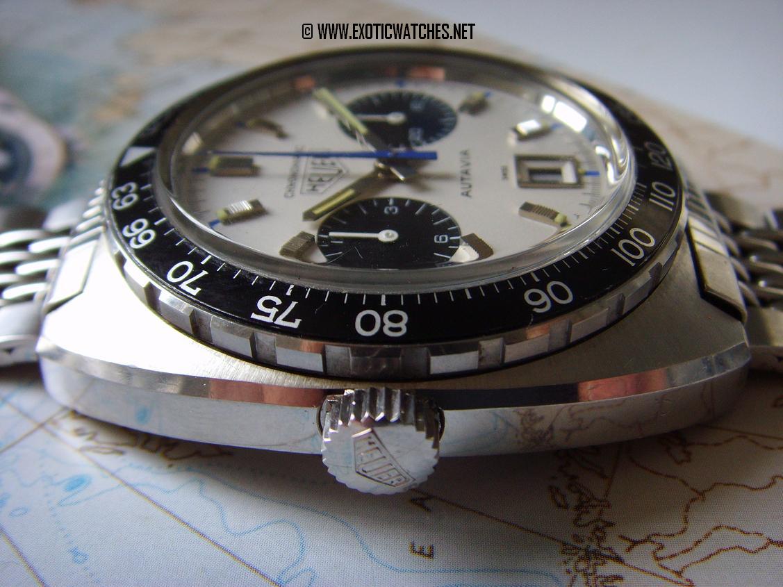"Chronomatic" above Heuer logo; "Autavia" on lower half of dial; 3-6-9-12 on hour recorder; ridged markers; polished steel hands with luminous inserts