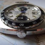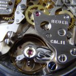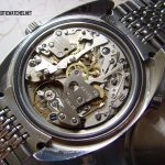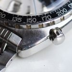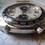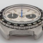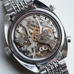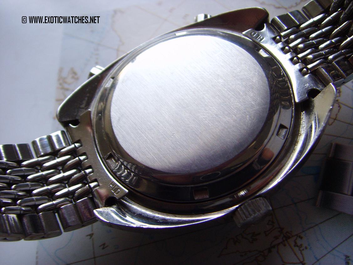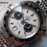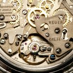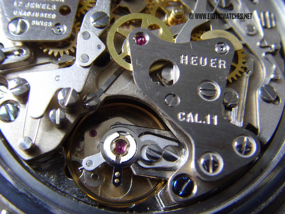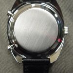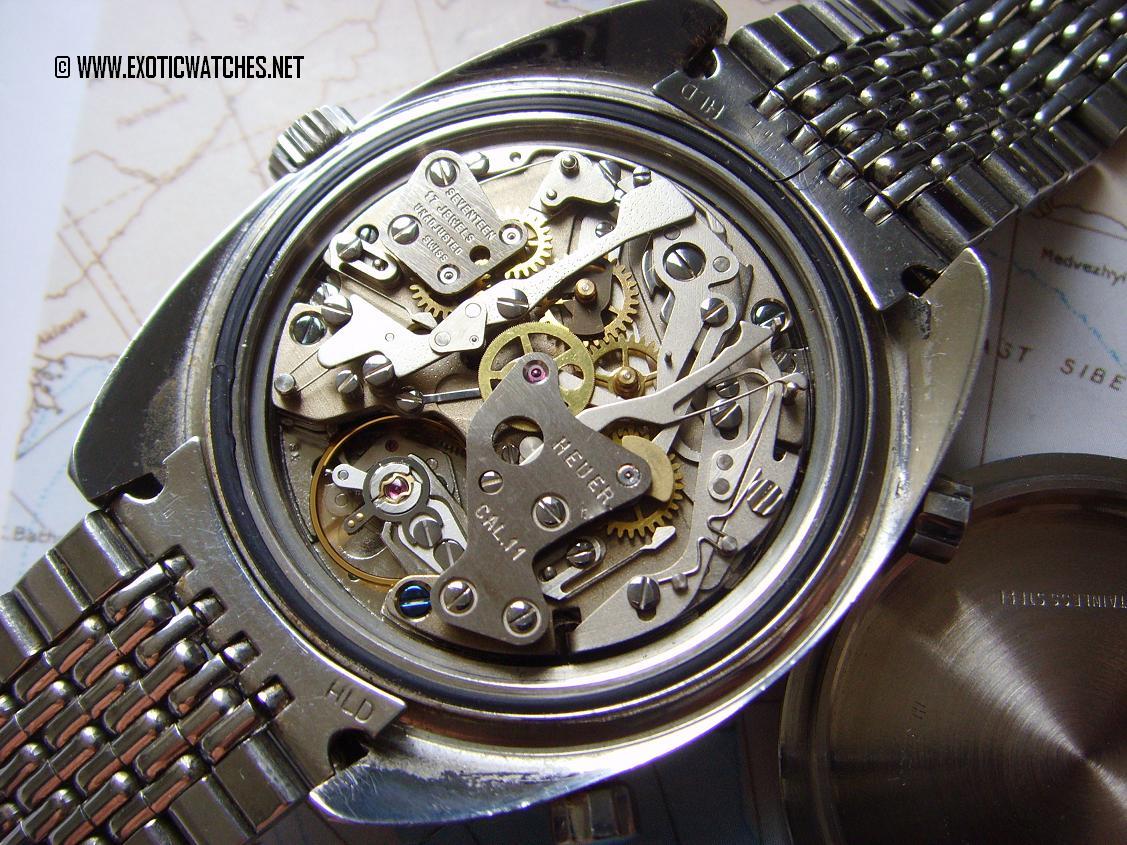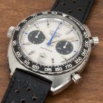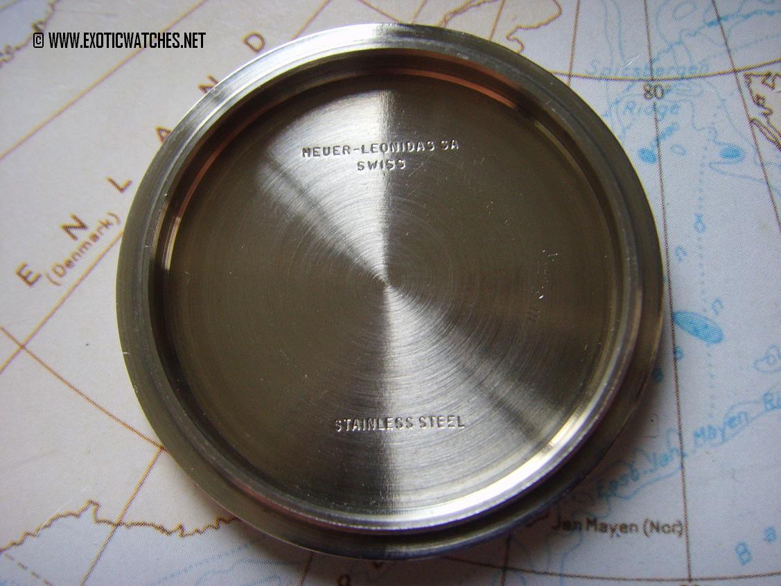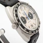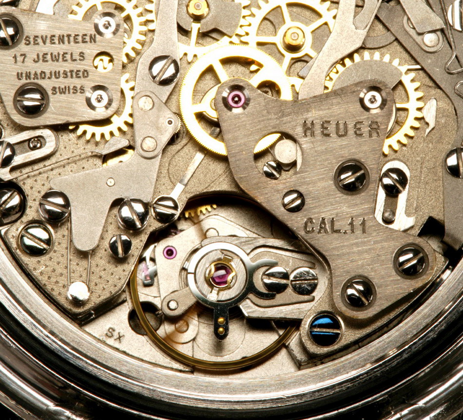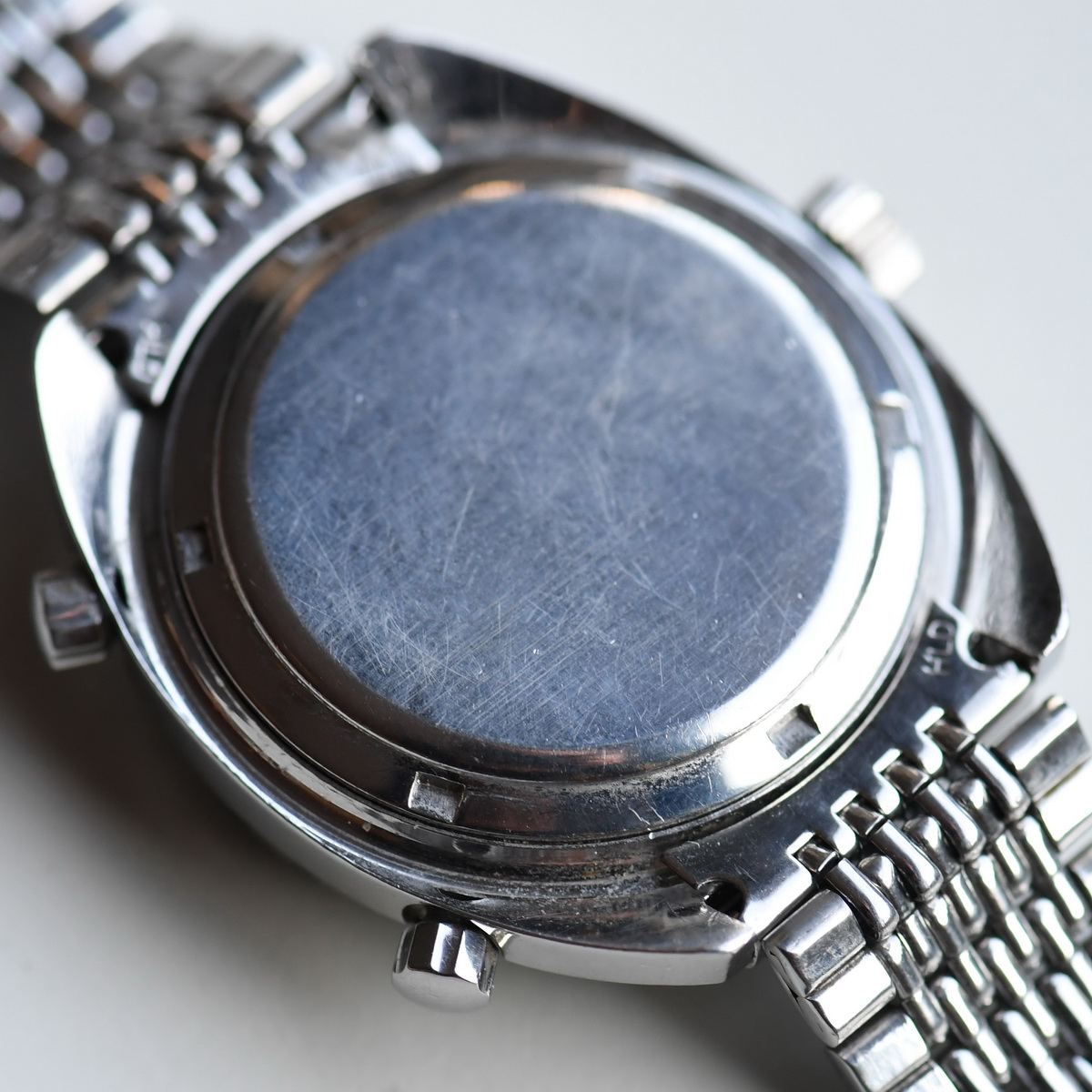 "Chronomatic" above Heuer logo; "Autavia" on lower half of dial; 3-6-9-12 on hour recorder; ridged markers; polished steel hands with luminous inserts