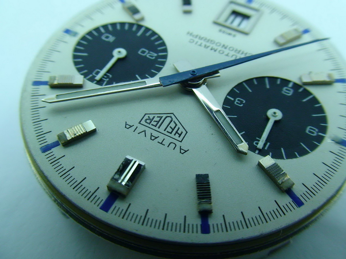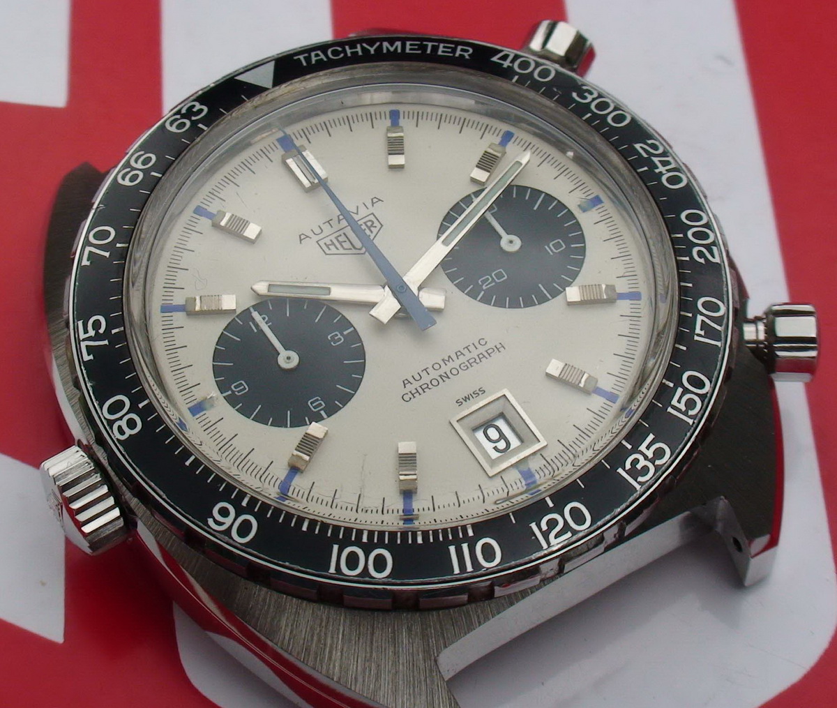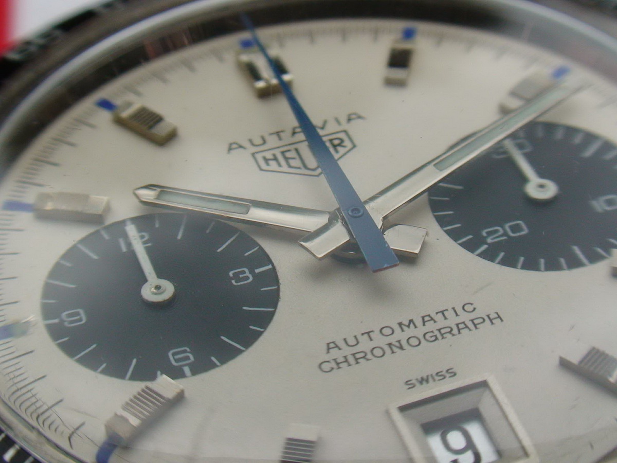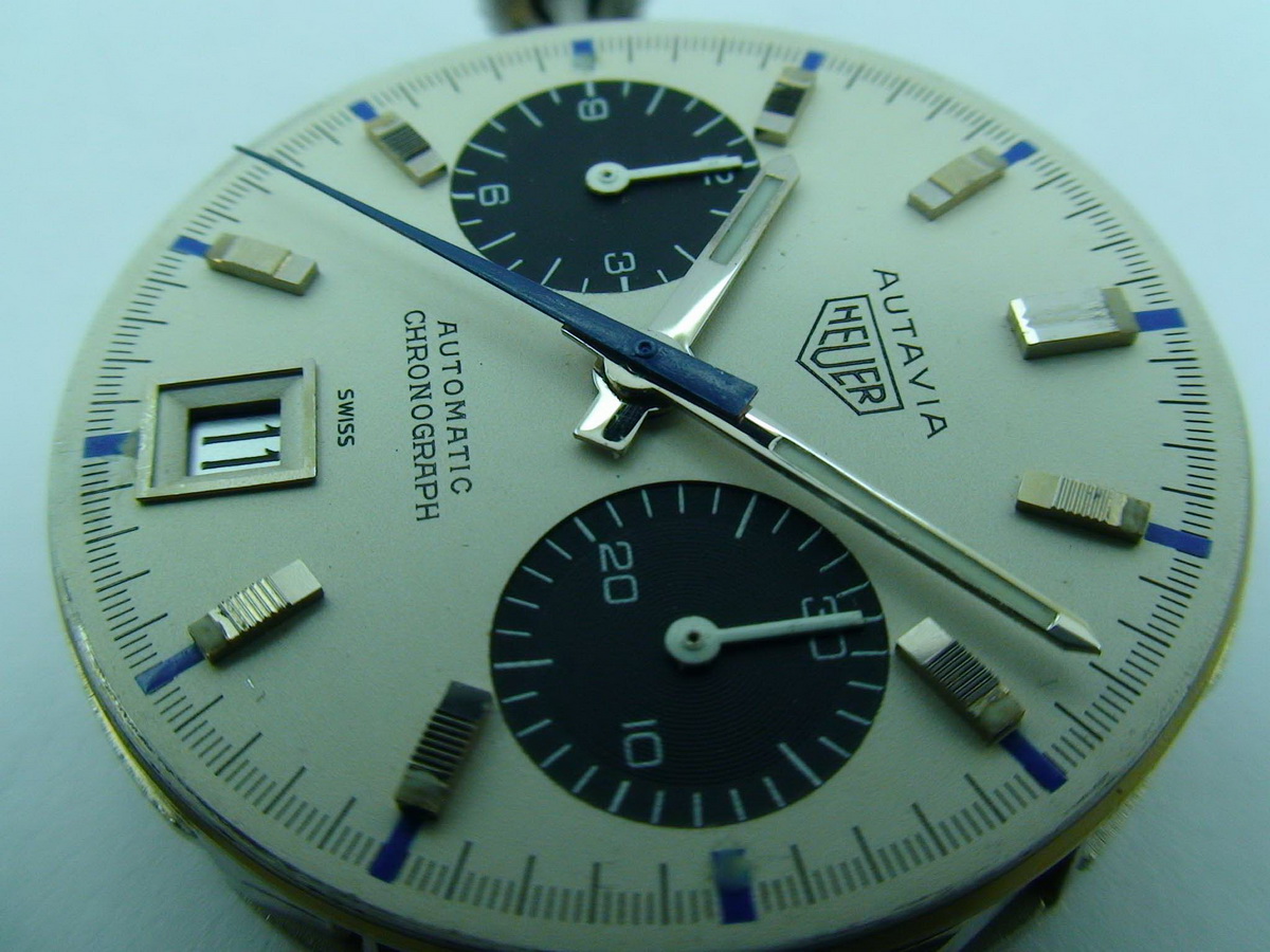 3-6-9-12 on hour recorder; ridged markers; normal (narrow) "V" in Autavia; polished steel hands with luminous inserts