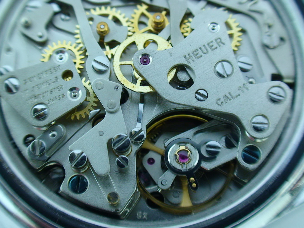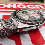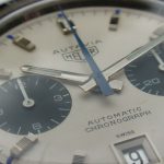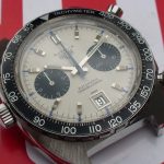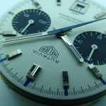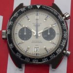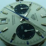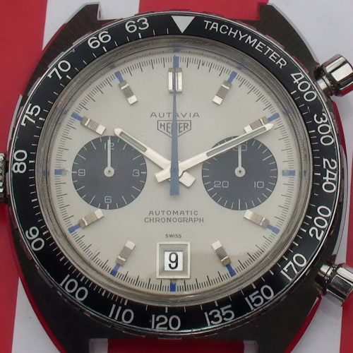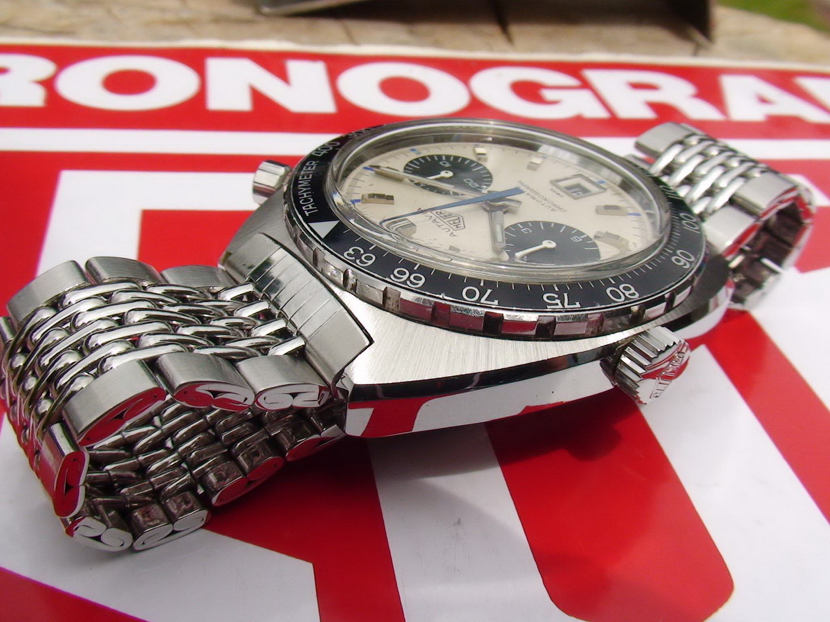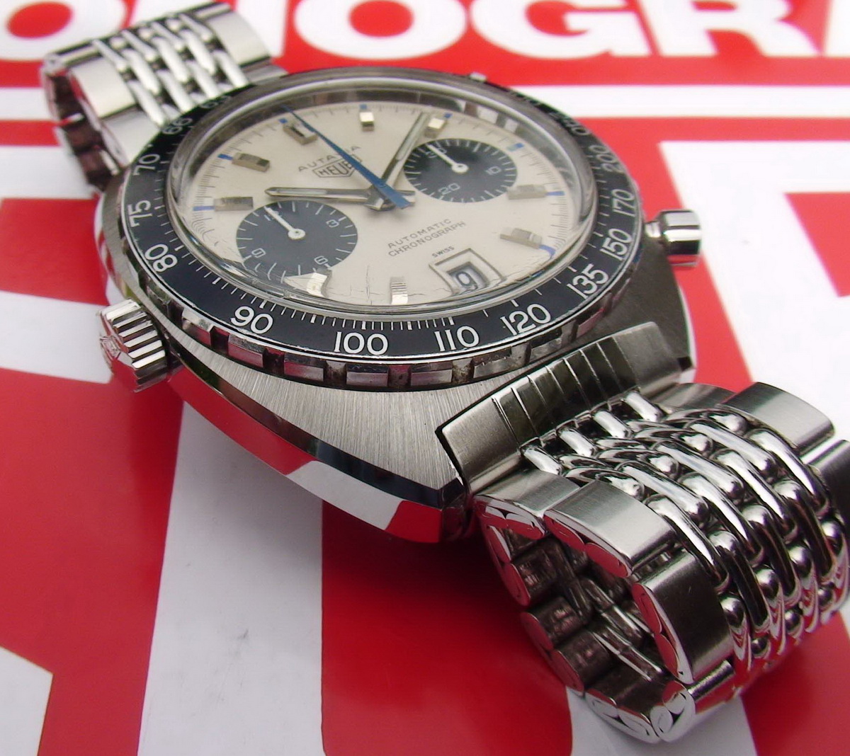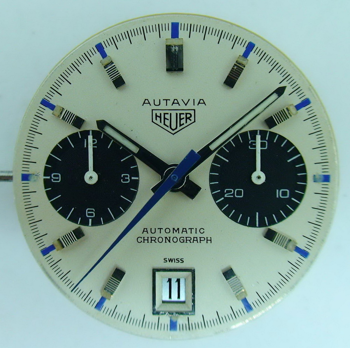 3-6-9-12 on hour recorder; ridged markers; normal (narrow) "V" in Autavia; polished steel hands with luminous inserts