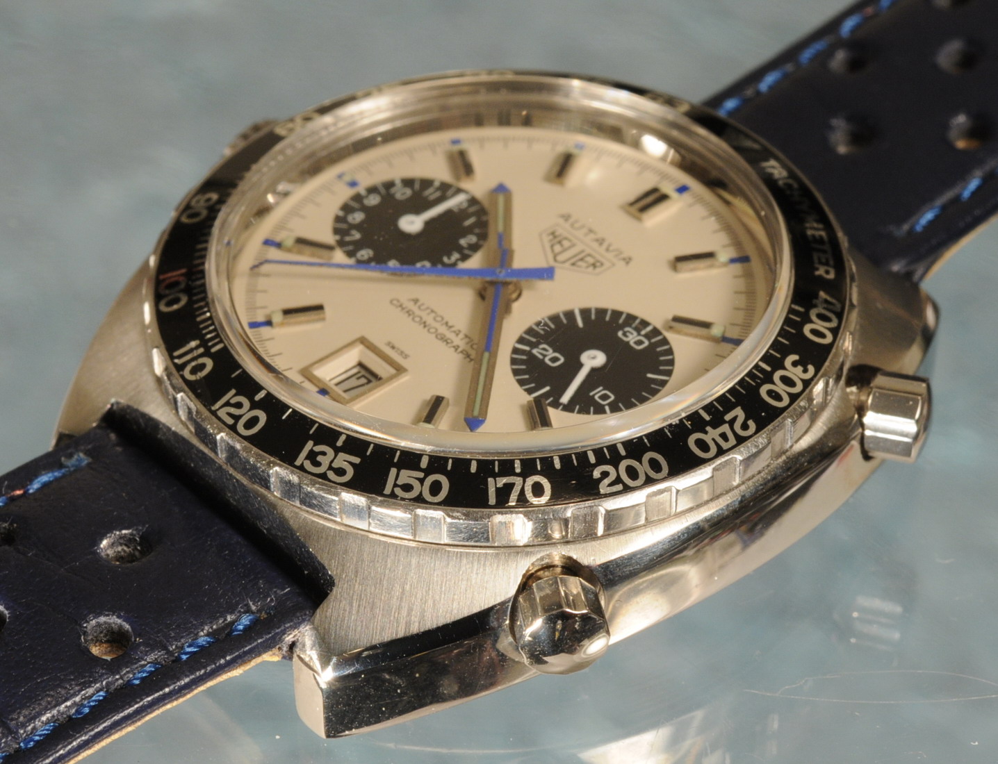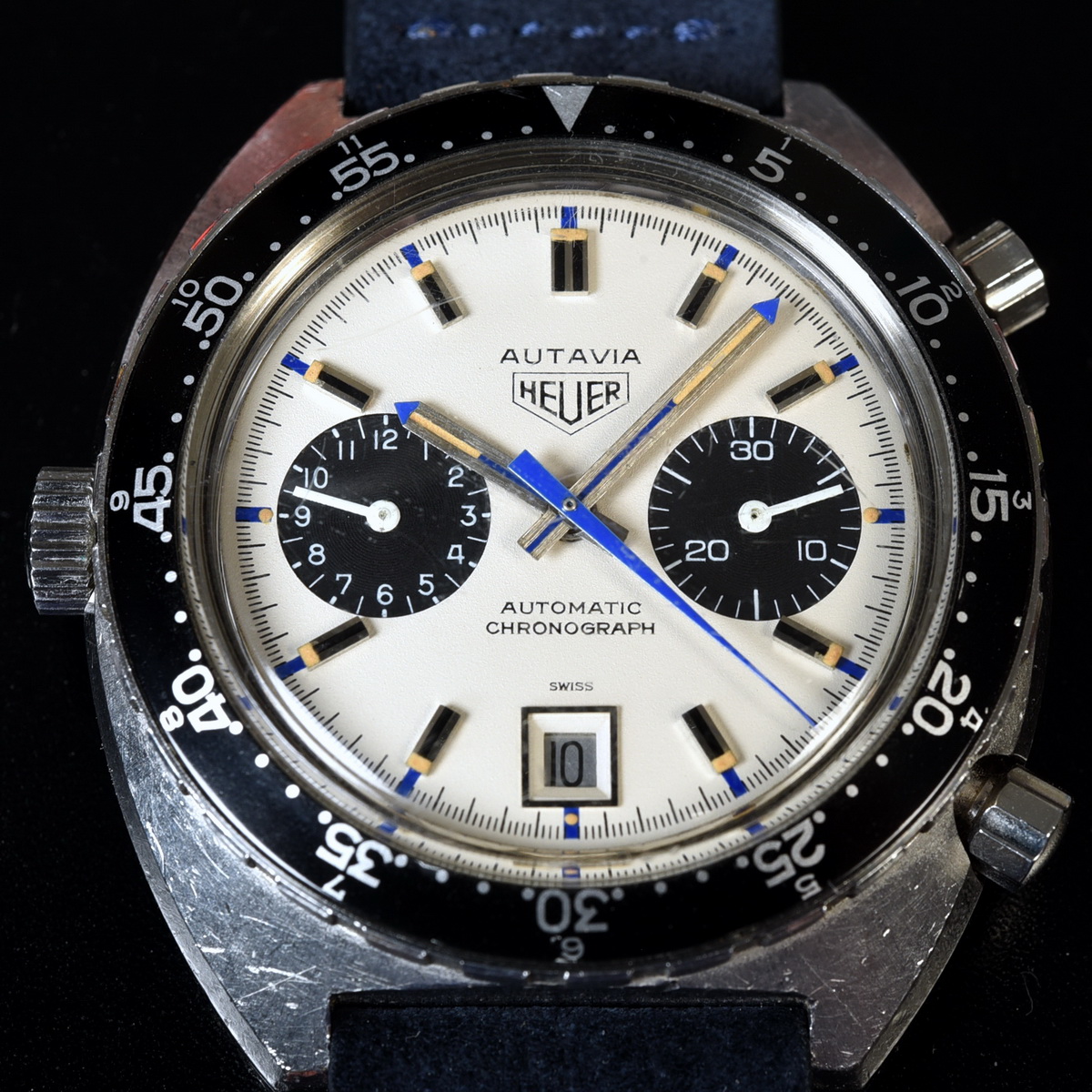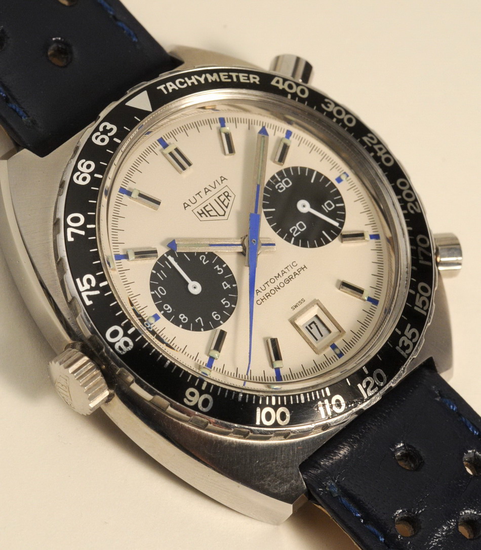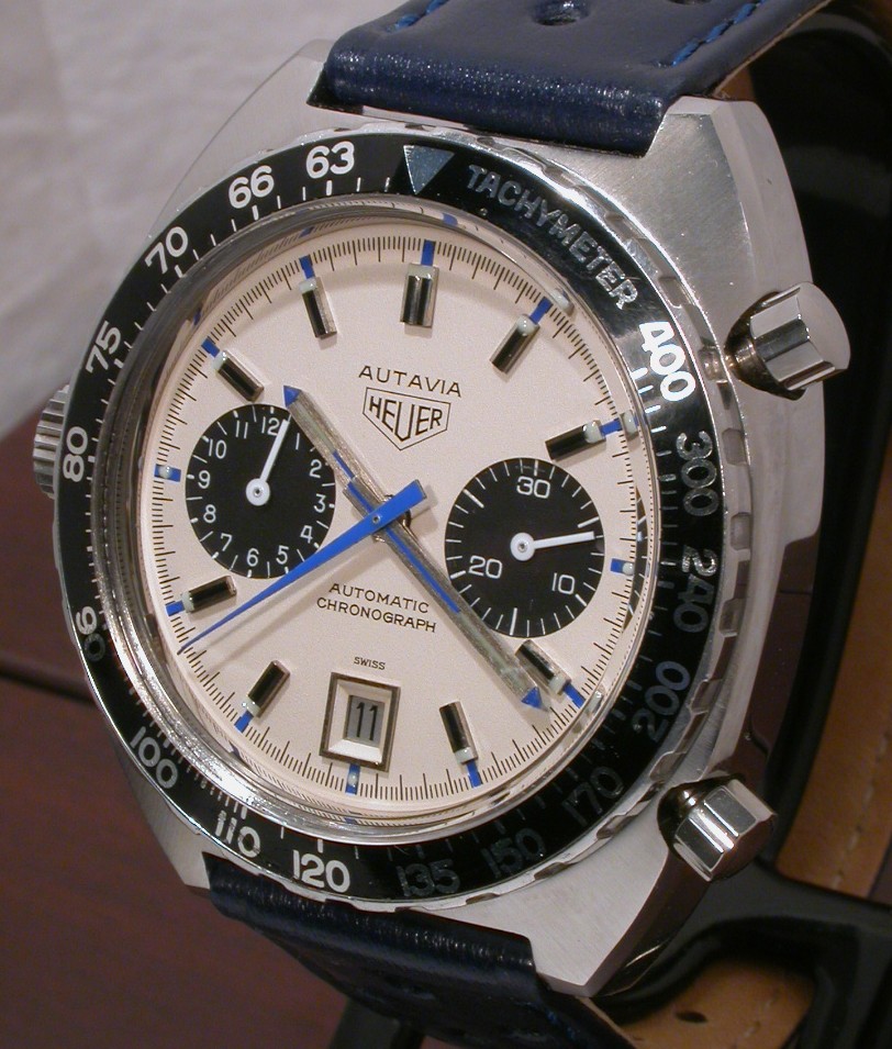 1-through-12 on hour recorder; polished steel markers, with black inserts; brushed steel hands, with blue inserts and tips
