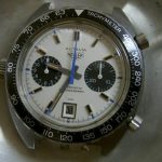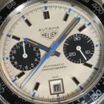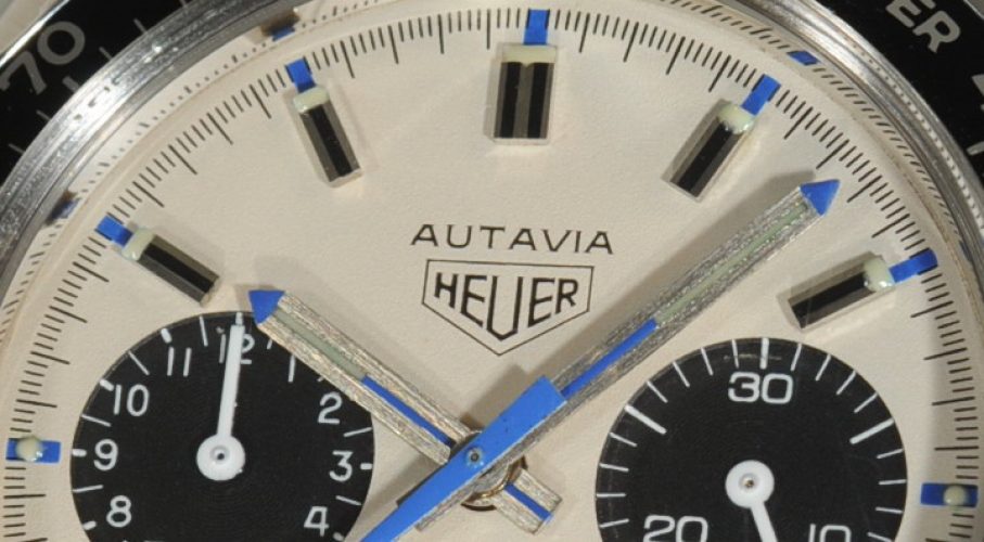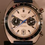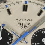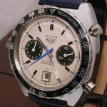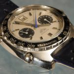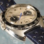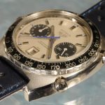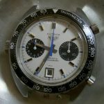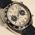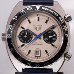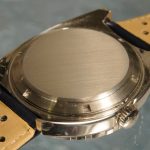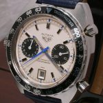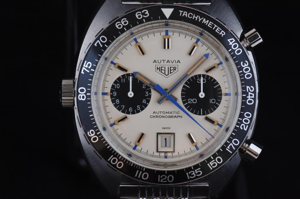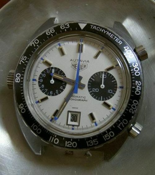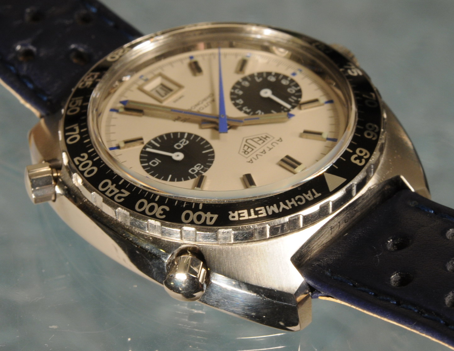 1-through-12 on hour recorder; polished steel markers, with black inserts; brushed steel hands, with blue inserts and tips