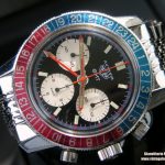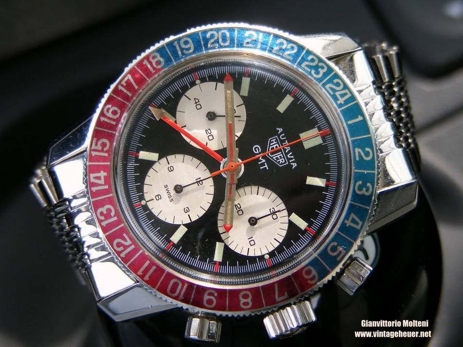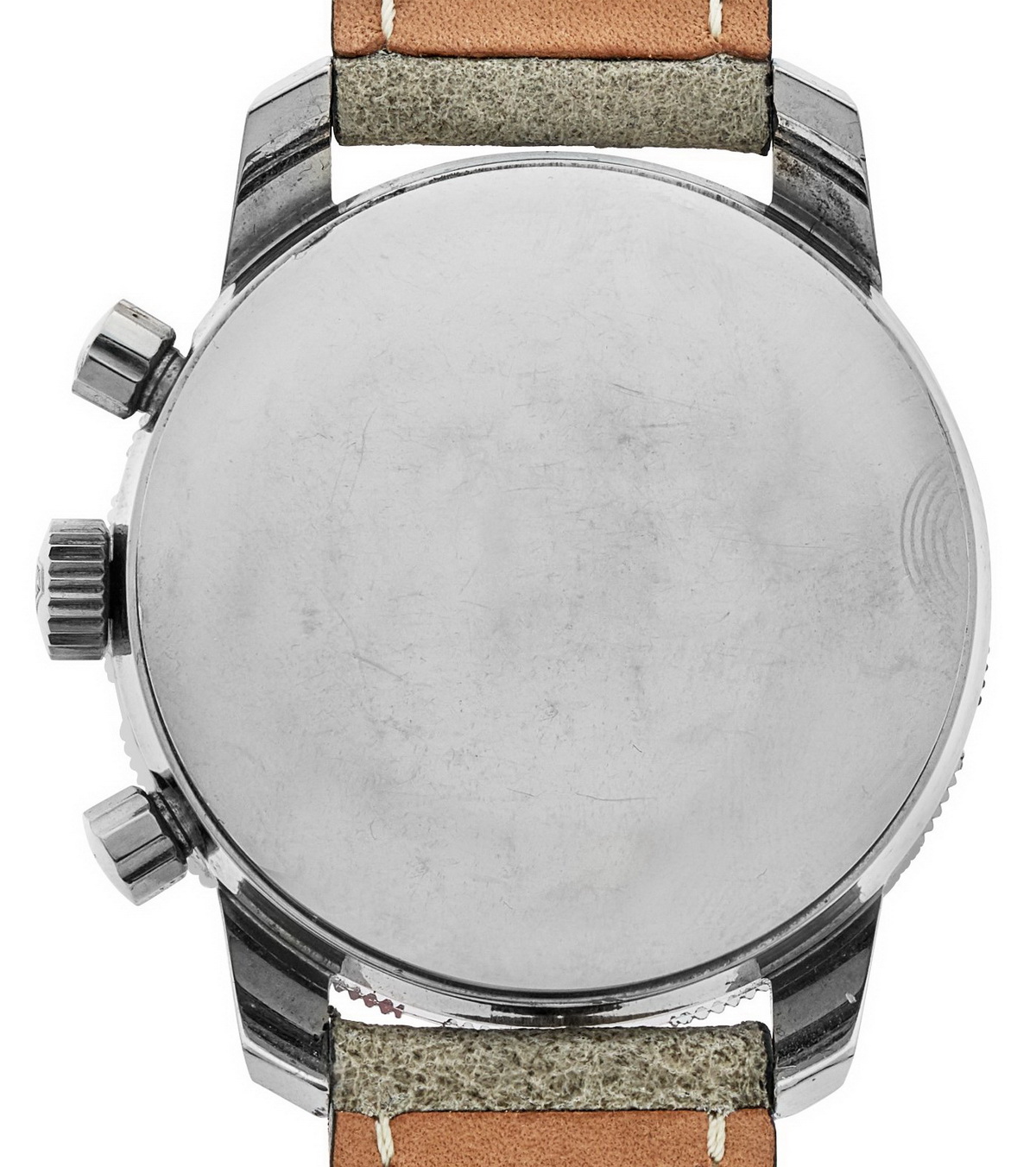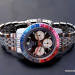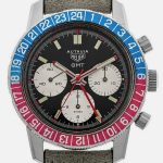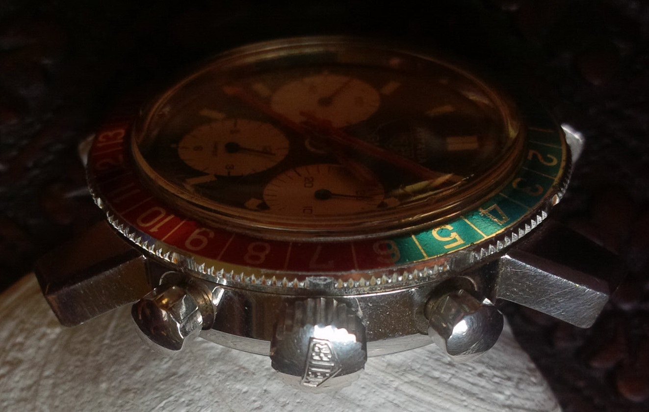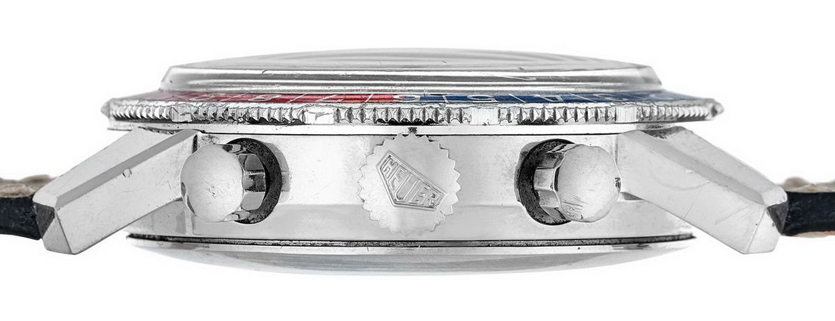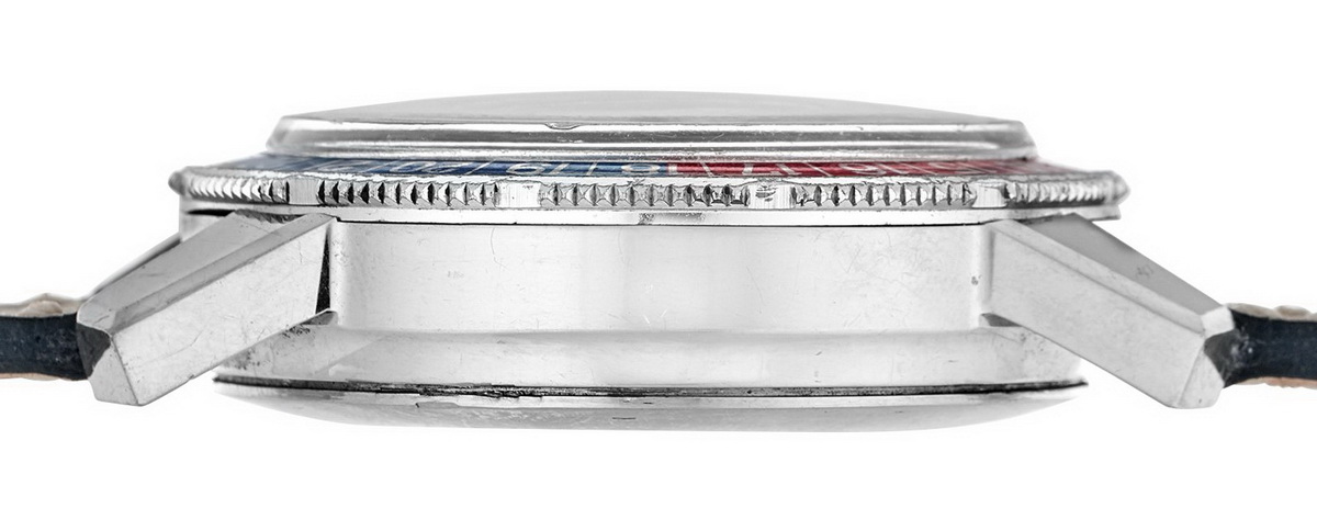 Mark 4 dial has larger, stepped registers and is marked "Swiss"; polished steel hands, with red and luminous inserts, and red triangular tips; red chronograph second hand; fluted pushers