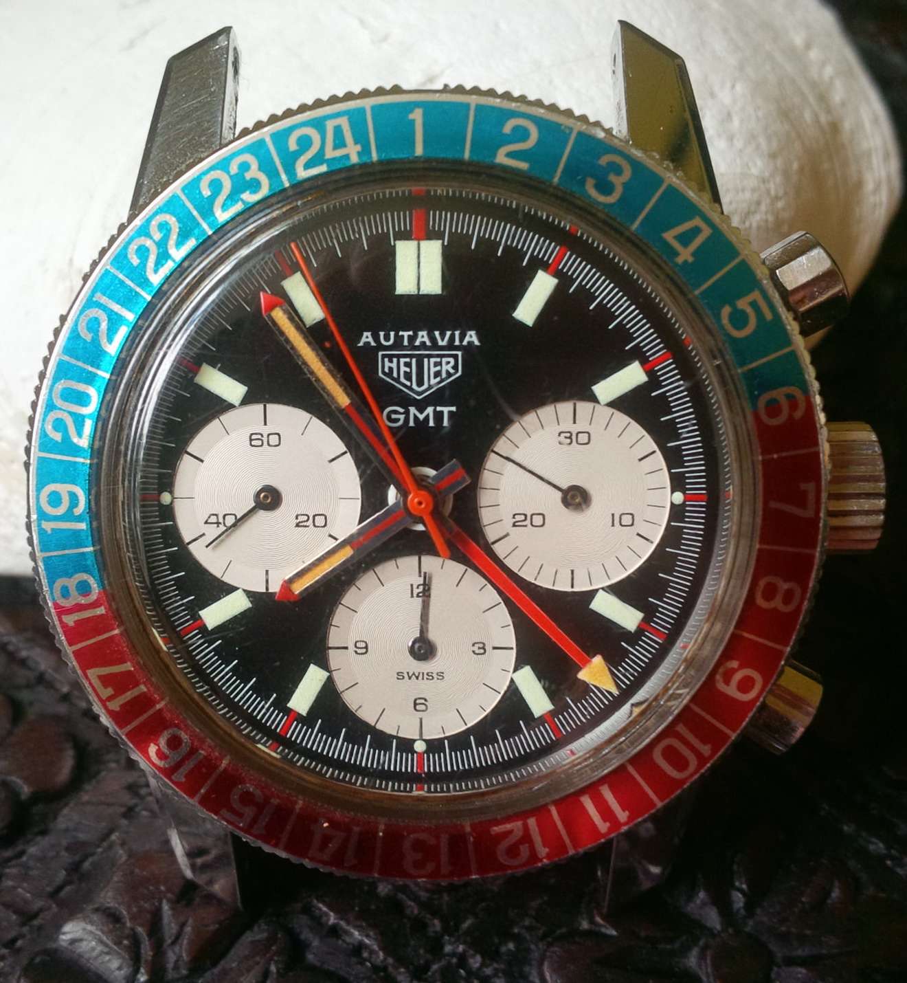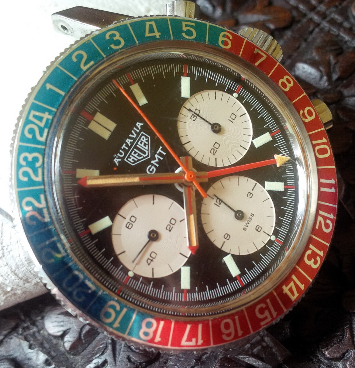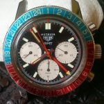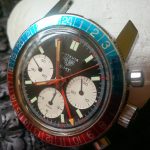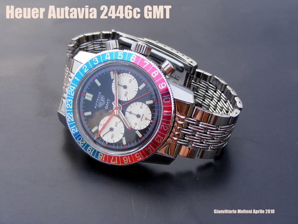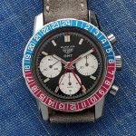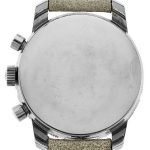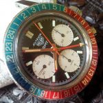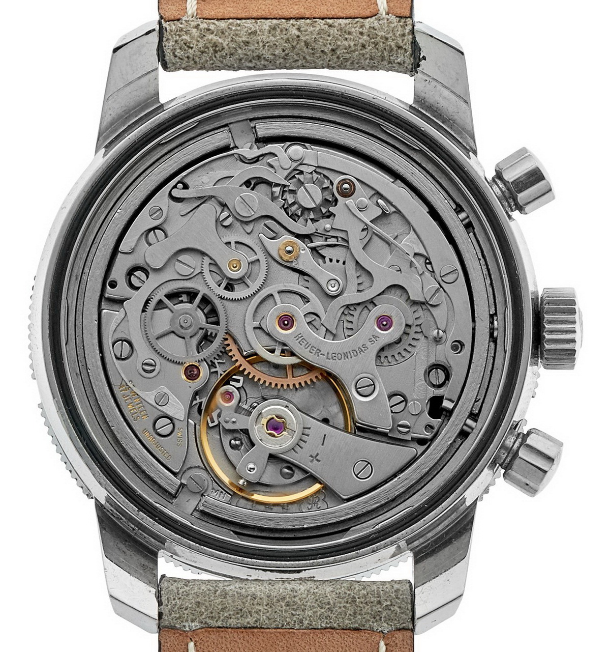 Mark 4 dial has larger, stepped registers and is marked "Swiss"; polished steel hands, with red and luminous inserts, and red triangular tips; red chronograph second hand; fluted pushers