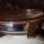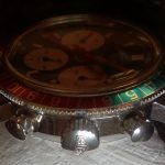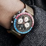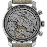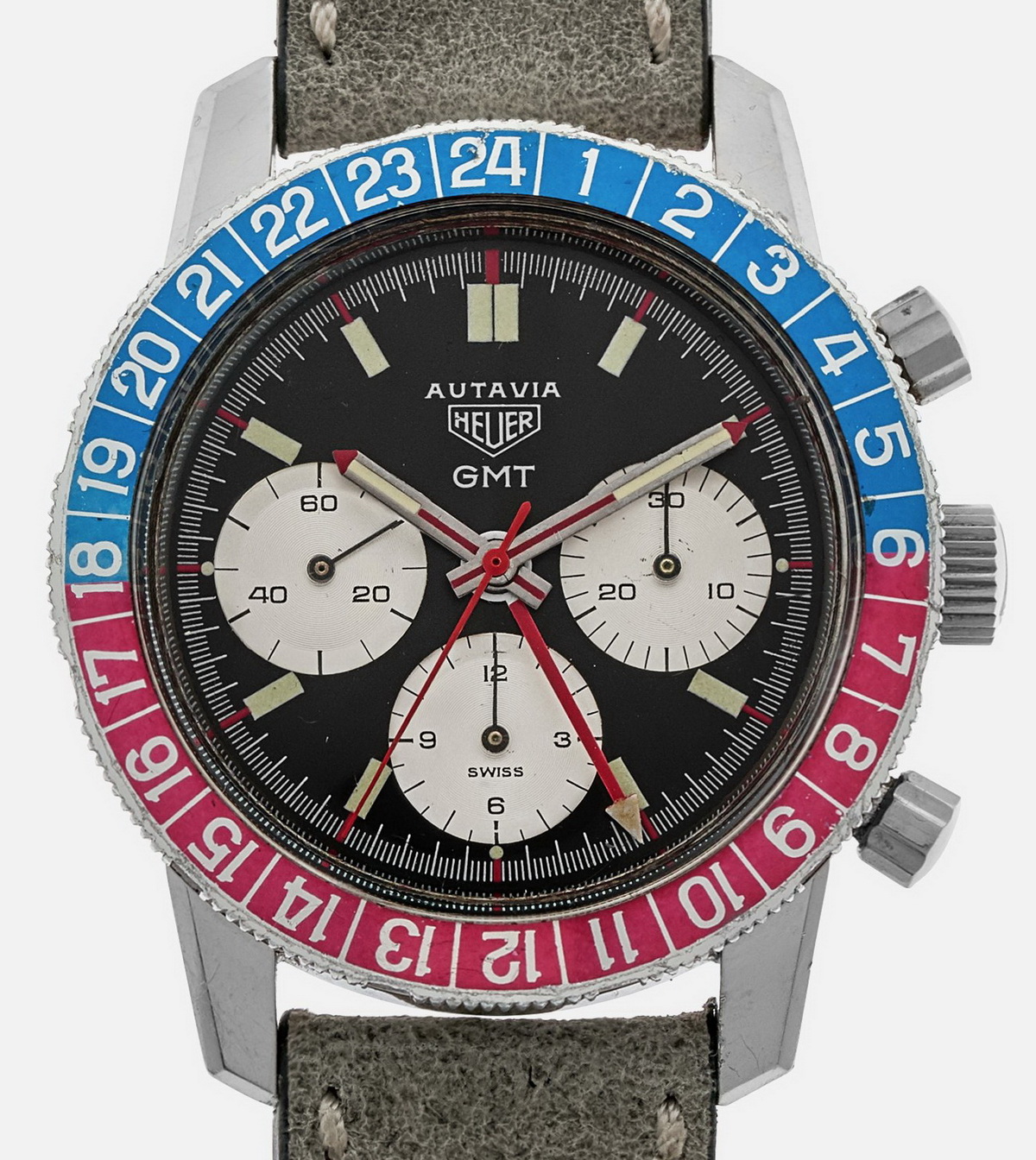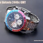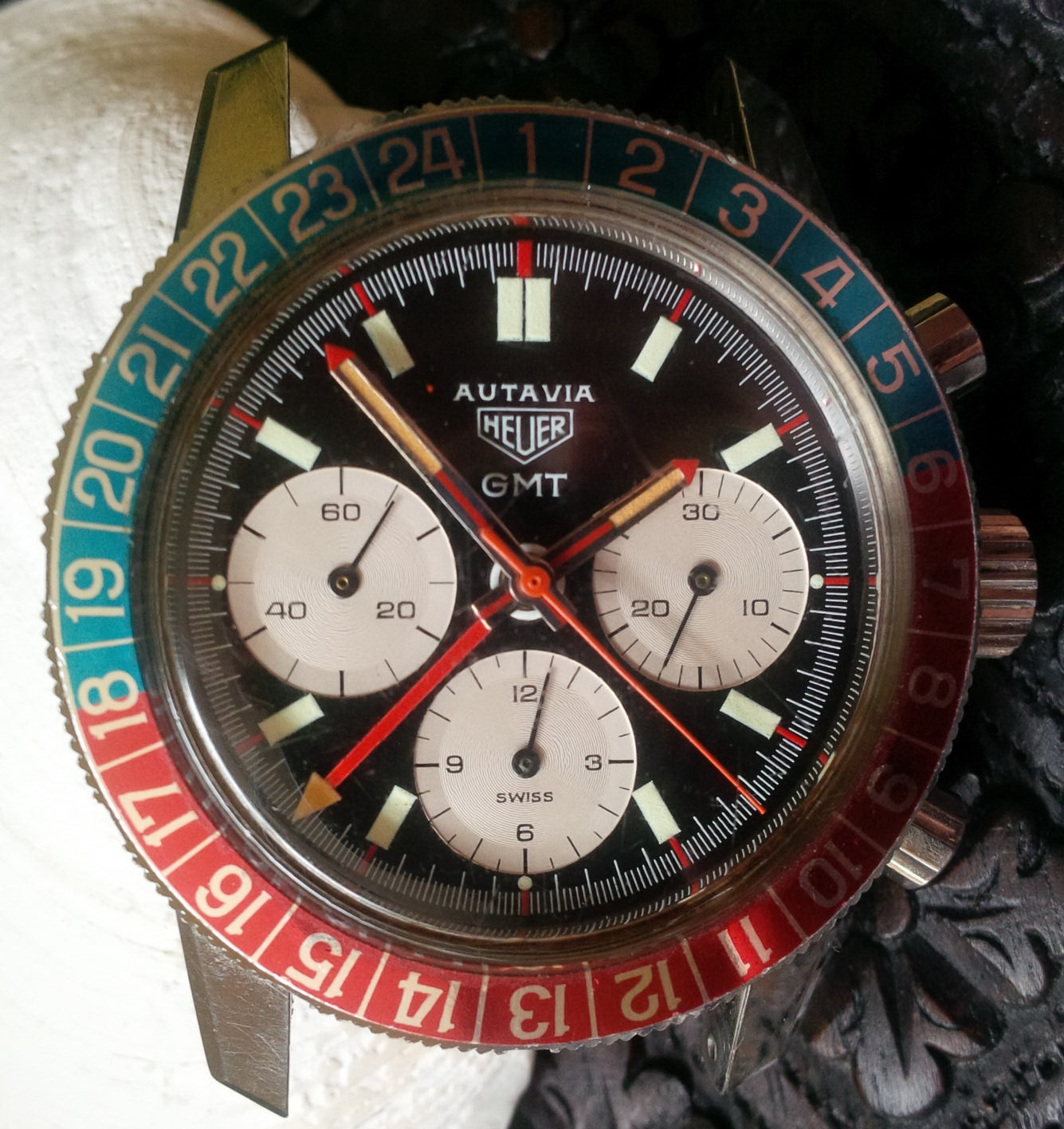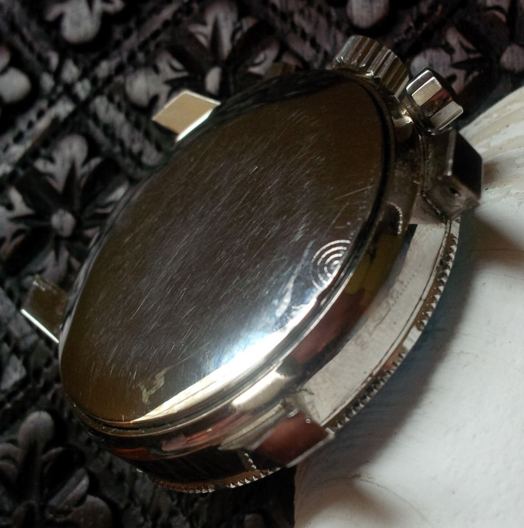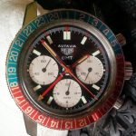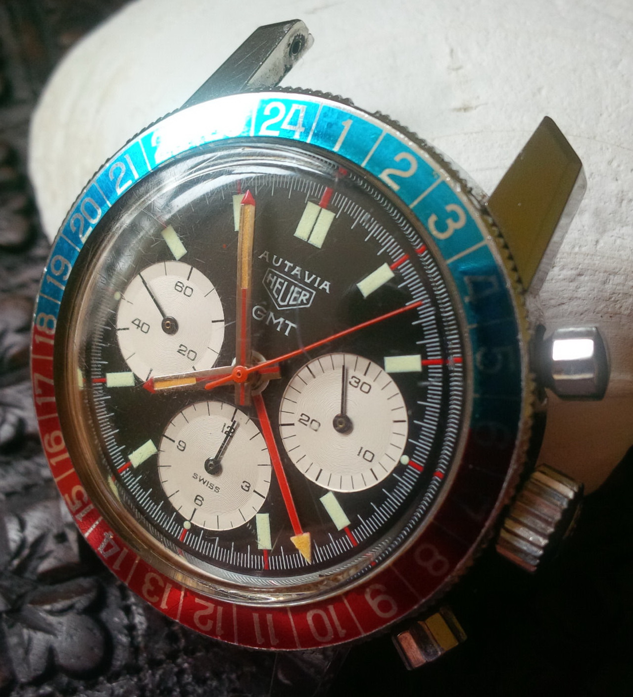 Mark 4 dial has larger, stepped registers and is marked "Swiss"; polished steel hands, with red and luminous inserts, and red triangular tips; red chronograph second hand; fluted pushers