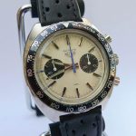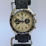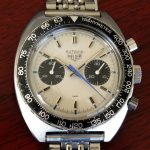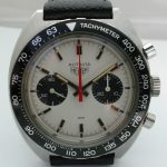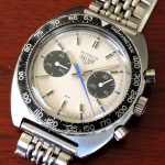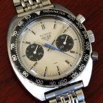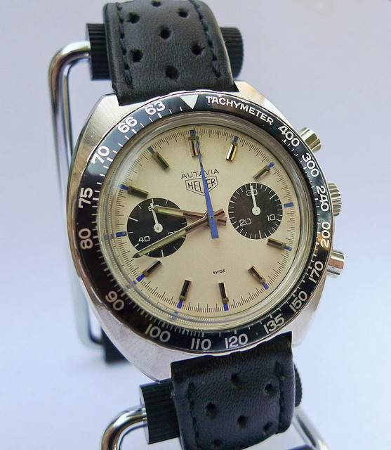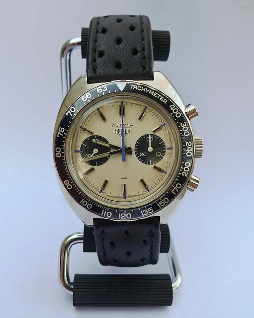 Autavia 73363 -- "Siffert" Colors has white dial with black registers and blue accents; applied markers, with black inserts; polished steel hands, with luminous and black inserts