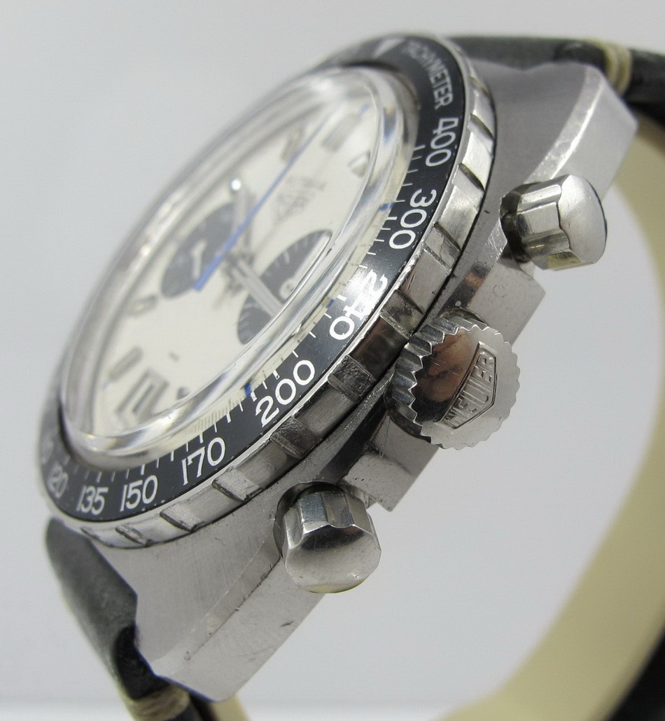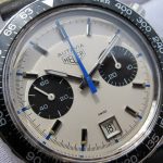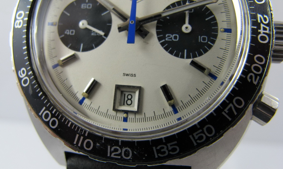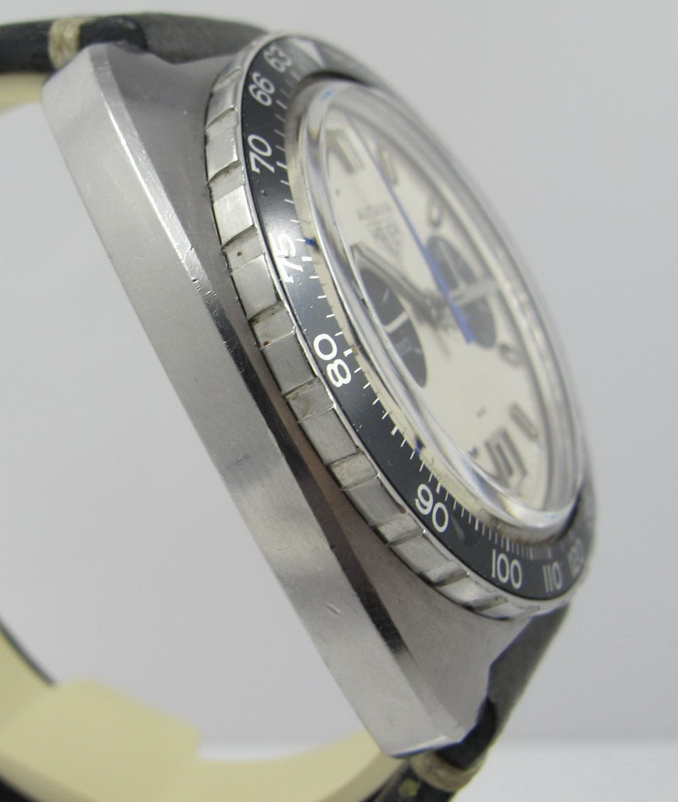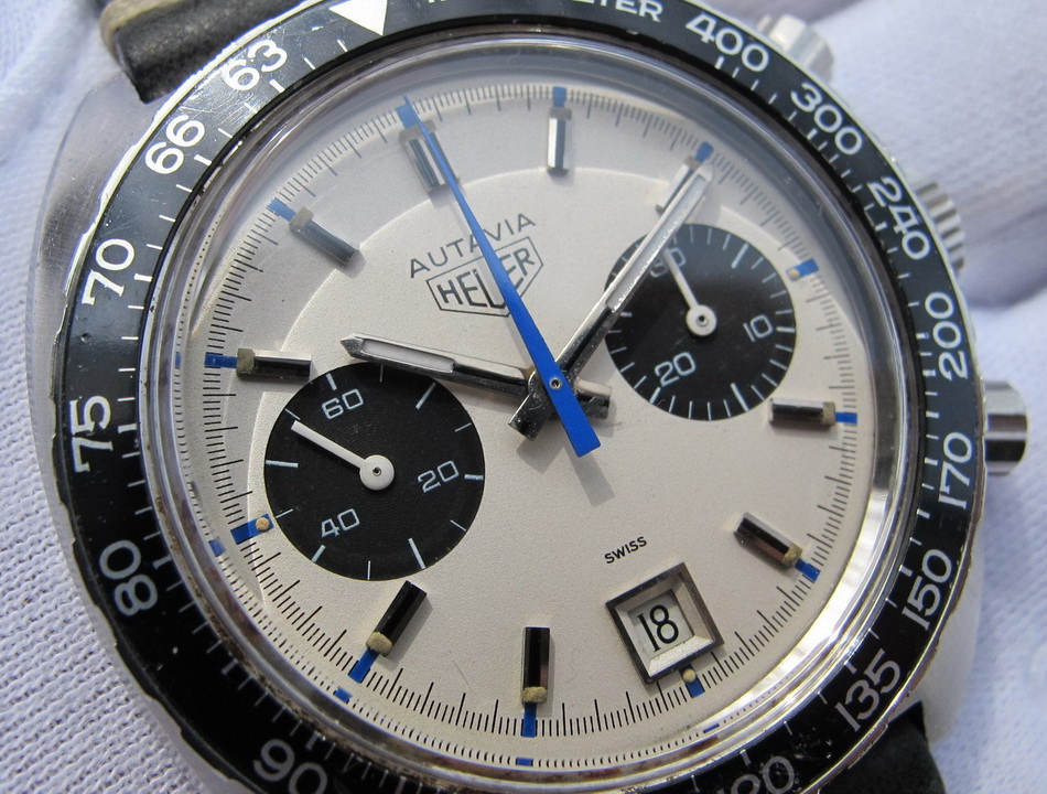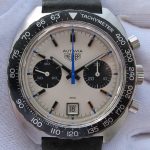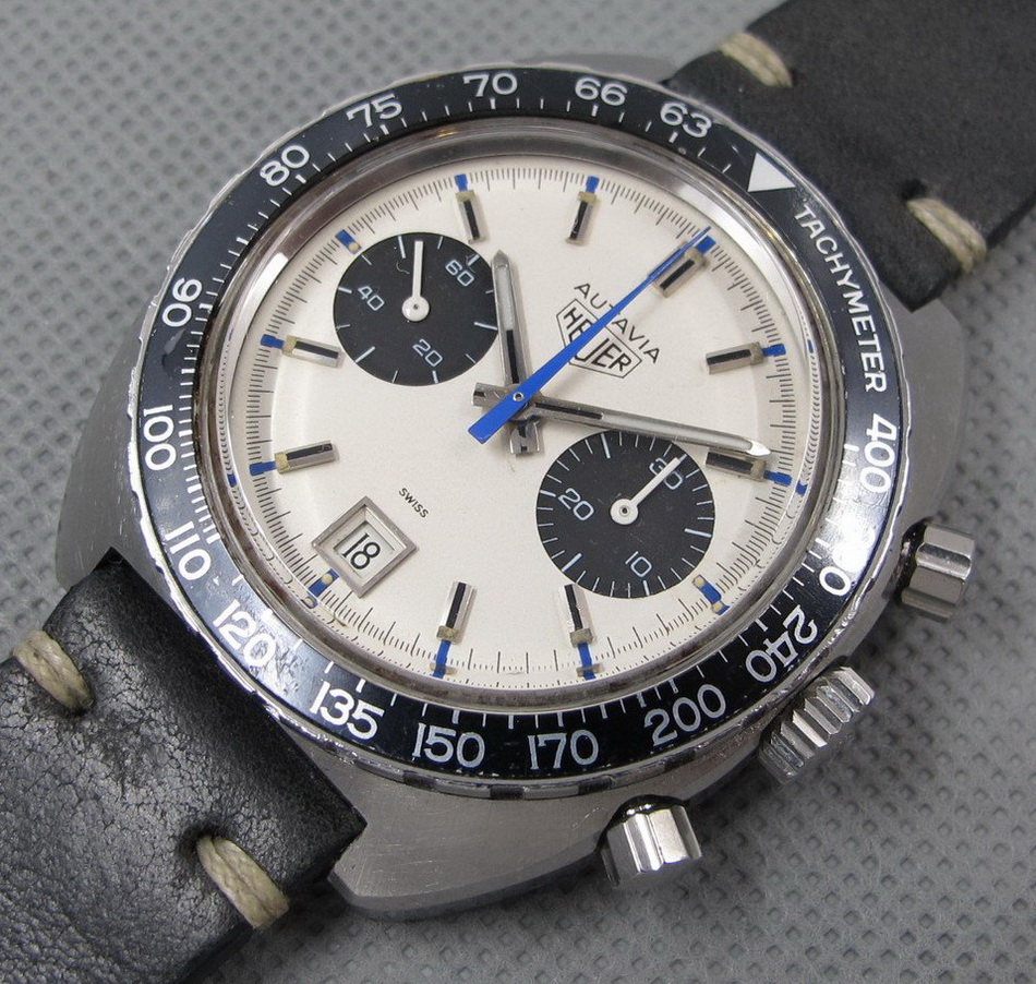 Autavia 73363 -- "Siffert" Colors has white dial with black registers and blue accents; applied markers, with black inserts; polished steel hands, with luminous and black inserts