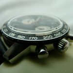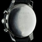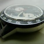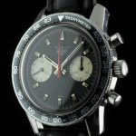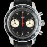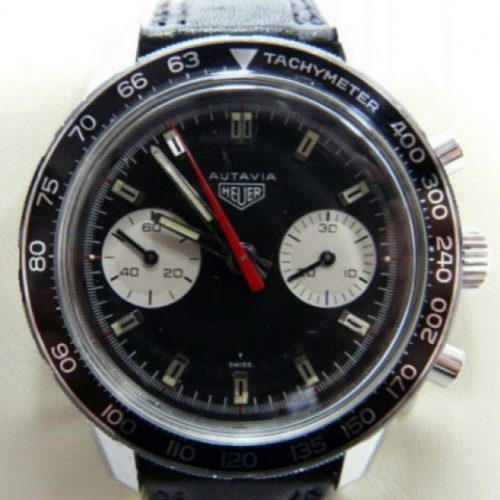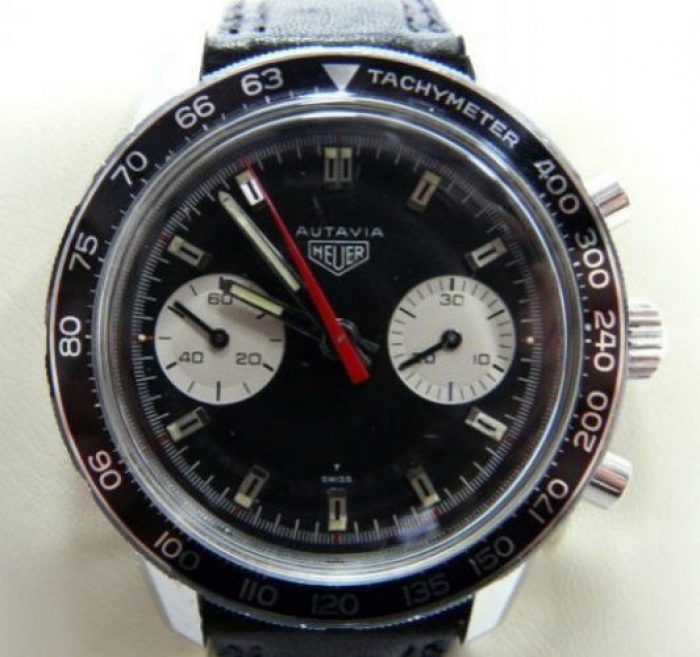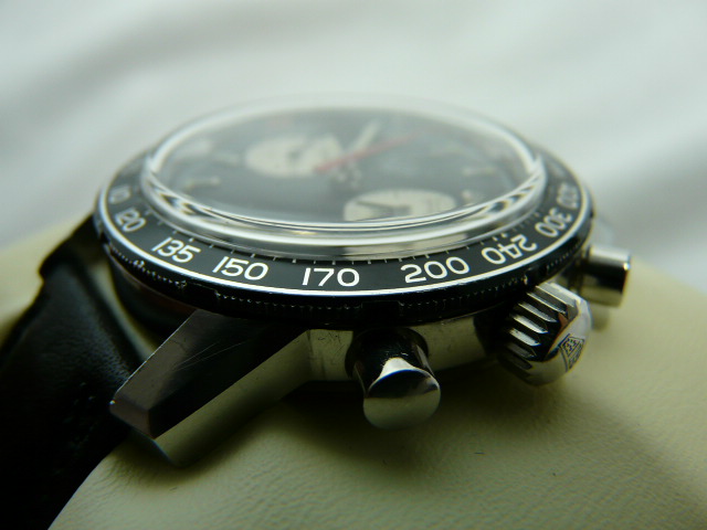 Autavia, Reference 7763C -- Mark 2 has second case (larger teeth on bezel); black dial with white registers, and red accents; markers have black inserts; polished steel hands with luminous and black inserts; red chronograph second hand