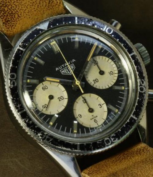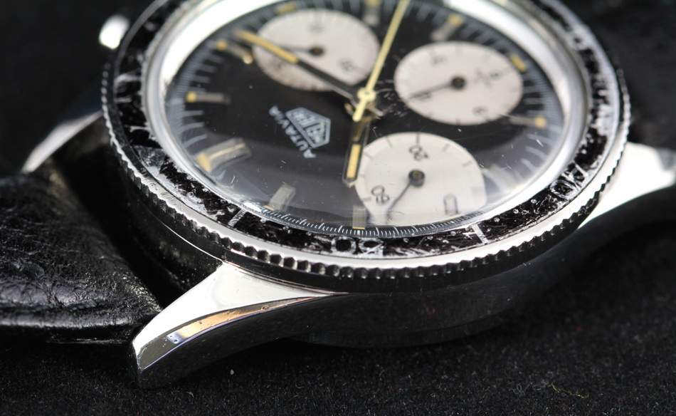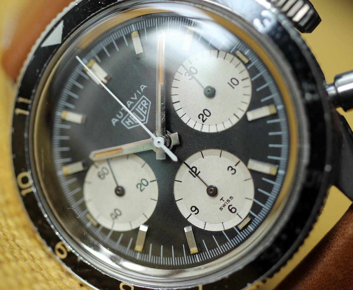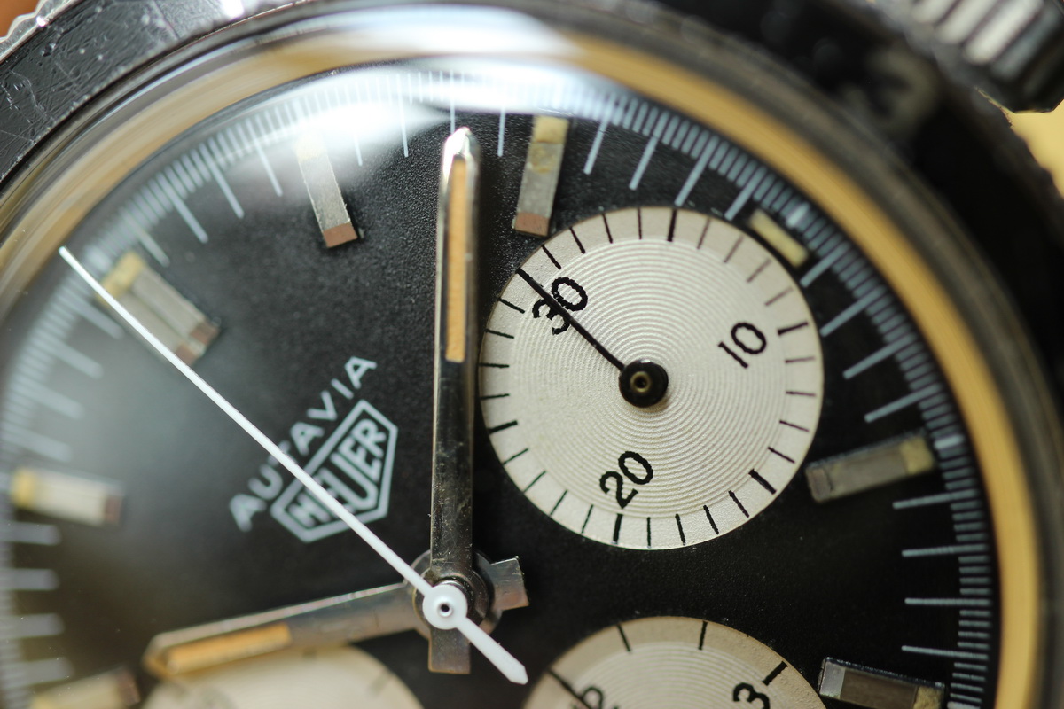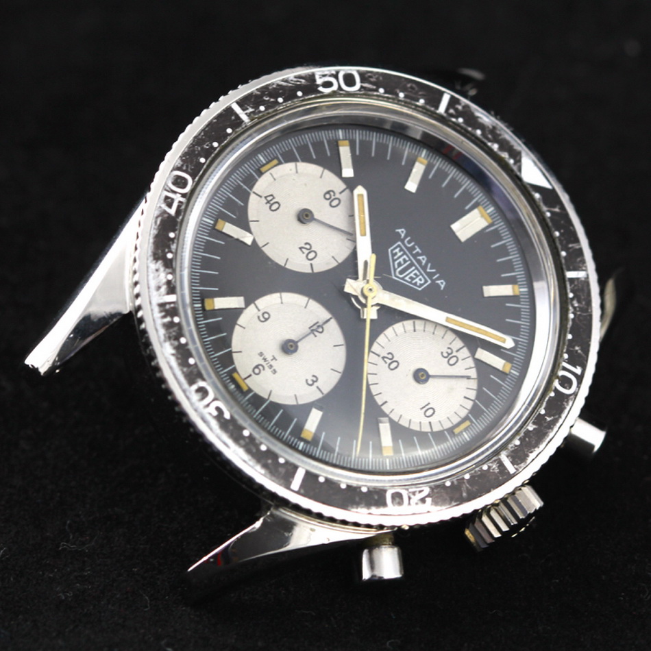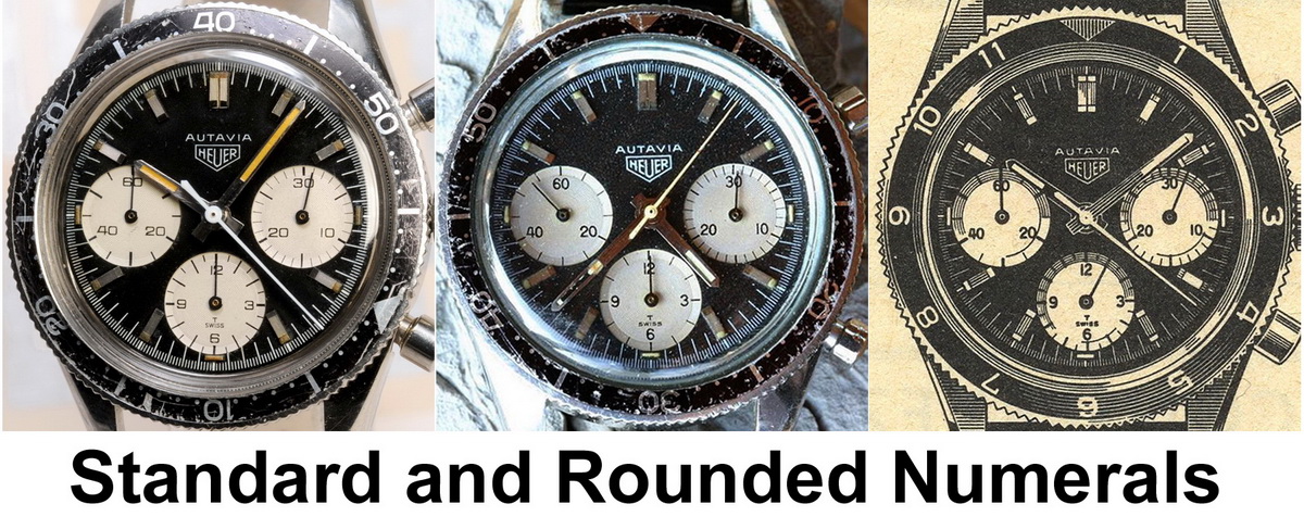 This model is identical to other second execution screw-back Autavias, with third execution dials, except that the numerals on the registers are rounded (derived from Helvetica)