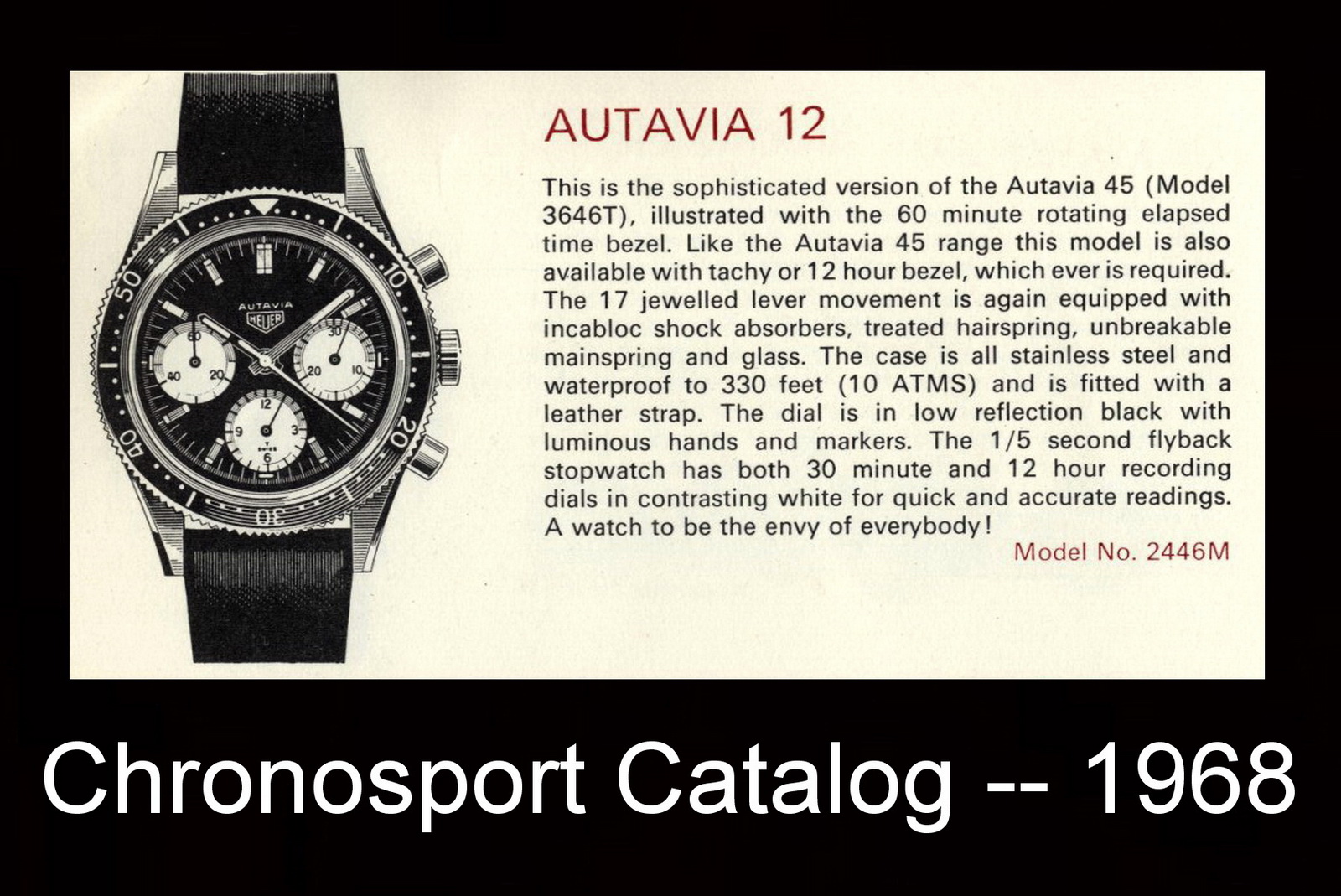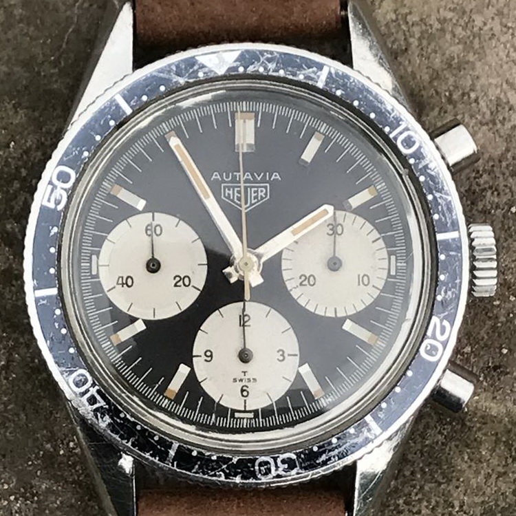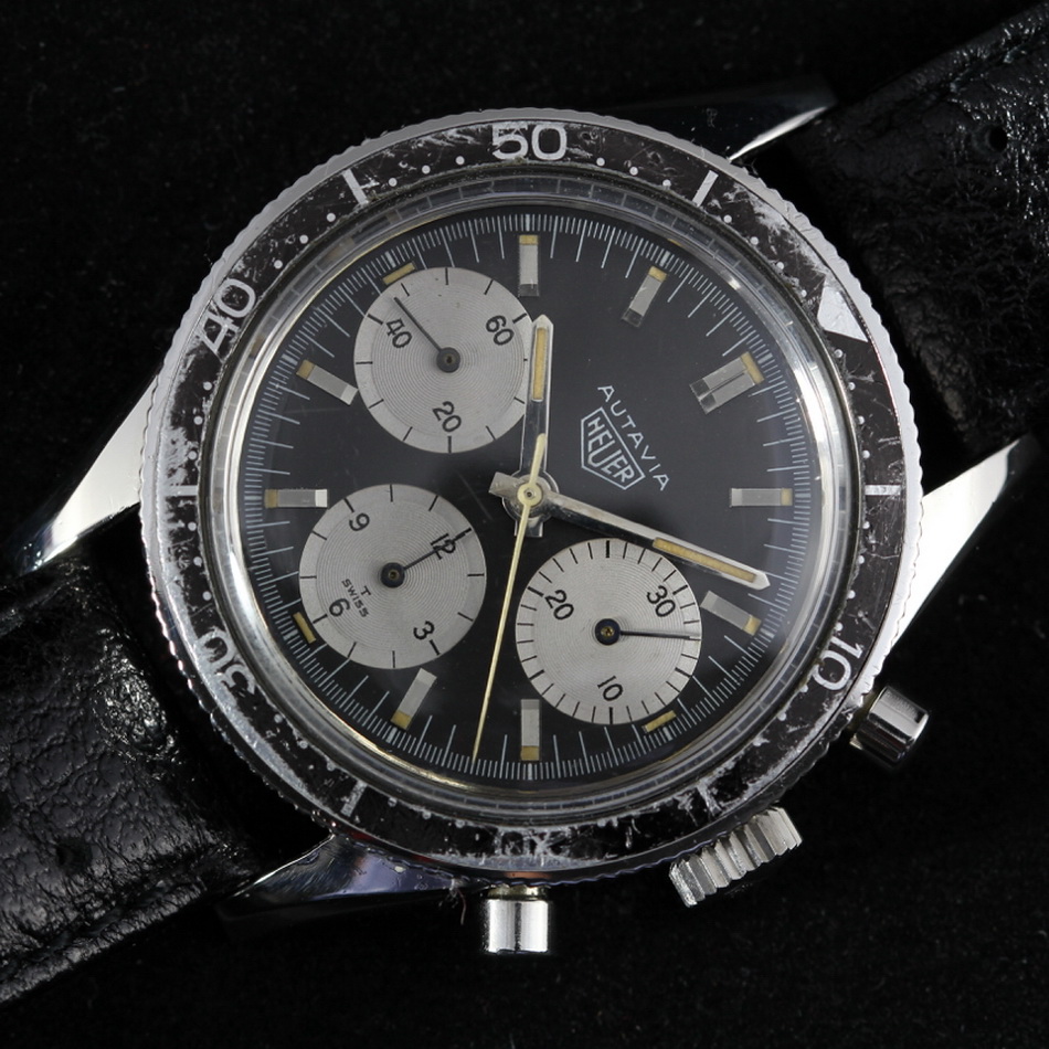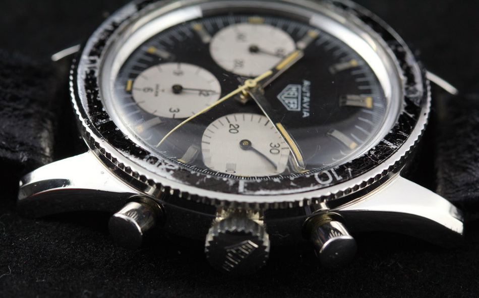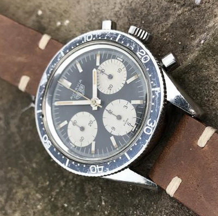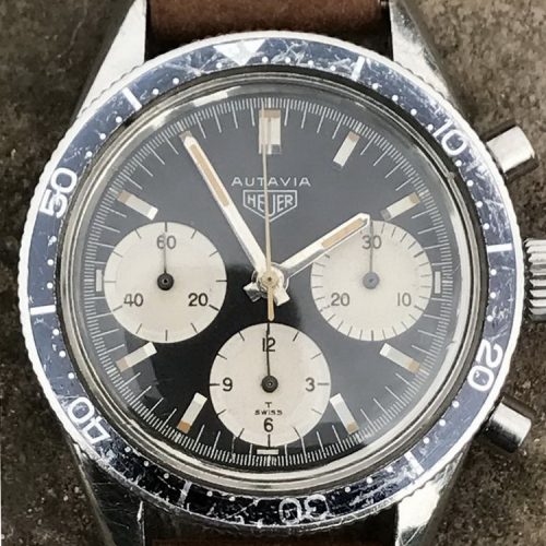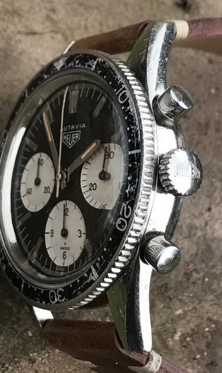 This model is identical to other second execution screw-back Autavias, with third execution dials, except that the numerals on the registers are rounded (derived from Helvetica)